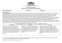 UNIVERSITY OF NORTH CAROLINA WILMINGTON BUSINESS OFFICER COMPETENCY ASSESSMENT WORKSHEET Division/Department Position # Employee: Business Officer Description of Work: Positions in this banded class administer and manage the business and financial affairs of a department, unit, or organization. Responsibilities include facilitation and management of financial resources that may be state appropriated, contracts and grants, and/or receipt generated. Employees perform a range of financial and business related duties associated with specialized areas such as accounting, budgeting, auditing, and/or grants administration. Functions assigned to the business officer role may include financial management, personnel administration/management, payroll, purchasing, inventory control, facilities coordination/planning, information technology assessment/planning and closely related work. Employees may perform or have oversight of accounts reconciliation, maintenance and reporting of financial data, financial projections, cash/receipts management, personnel planning, and facilities management. Most Business Officers have responsibility for accounting/business standards and practices, policy interpretation/implementation, the organization of work, and the supervision of others. As most Business Officers are responsible for similar functions, competency leveling should be based on the degree of employee involvement/responsibility for the function, as well as the size, scope, and nature of the department, unit, or organization. ROLE DESCRIPTIONS BY COMPETENCY LEVEL – BUSINESS OFFICER Contributing Employees at this level are business officer professionals who apply well-defined accounting, budget and business practices to address the business needs of a department unit or organization with consistent funding sources for a limited variety of functional activities or services in a well defined business, and/or program. Journey Employees at this level are business officer professionals who apply a broad knowledge of accounting, budget and business practices for a department unit or organization with dynamic funding sources and a variety of functional activities, programs, and/or services. Advanced Employees at this level are business officer professionals who apply a comprehensive knowledge of accounting, budget and business practices for a multifaceted department unit or organization with unique and specialized activities and/or services. Employees also oversee activities that impact and interface with other functional areas. Note: Competency statements are progressive and not all competencies apply to every position/employee. Evaluate only those that apply. For positions with some supervision consider the highest level of professional work performed. Business Officer Competency Assessment Worksheet –Rev 4-1-2008 1 Competency Business Administration: Knowledge of appropriate business practices and procedures. Manage and improve business processes and operations by ensuring continuity, integration of policies and procedures with the organization’s mission and strategic plan. Develop long- and short-term goals and objectives that support the business functions. Functions assigned to the Business Officer role can include financial management, personnel administration/management, payroll, purchasing, inventory control, facilities coordination/planning, information technology assessment and closely related work. Weight: Contributing Journey Advanced Independently manage welldefined business functions for a department unit or an organization. Independently manage a variety of business functions with dynamic funding sources and/or a variety of functional activities, programs, and/or services. Independently manage a broad range of business functions for a department unit or an organization with unique and specialized activities or services. Oversee activities that impact and interface with other functional areas. Apply established policies and procedures related to business practices and internal control procedures Implement business practices and procedures that support the strategic goals of the organization. Interpret and/or modify policies and procedures to facilitate and ensure the application of sound business practices. May include integration of policies and procedures with work units external to the organization. Interpret, modify and monitor internal policies. Participate and assist in the long-and short-term strategic goals and planning. May participate in planning for future growth. Position Level (C) (J) (A) Employee Level (C) (J) (A) Develop and monitor internal policies and procedures to meet wide-ranging business needs, which may have broad impact. May include negotiating with external entities and constituents. Responsible for recommending and implementing long-range strategic planning, goals, and growth projections. Discussion/Justification including observations or measures: Definitions: Well-defined – Guidelines are clearly outlines and available. Dynamic – Characterized by continuous change, activity, or variety. In addition to other responsibilities, functions such as facilities management, purchasing, IT responsibilities, and receipt-supported operations add to the dynamics of an organization. Unique/Specialized Needs – Distinctive functions which singularly define and impact business operations such as revenue generation, multiple business components, joint venture consortium, etc. Broad Impact – Having the capacity to affect different areas beyond the scope of the operation managed Business Officer Competency Assessment Worksheet –Rev 4-1-2008 2 Competency Financial Management: Plan and monitor the financial resources of the organization (e.g., cash management, revenue) to meet organizational objectives and compliance; and prepare budget documents and reports. Demonstrate a proficient level of professional skill and/or knowledge and analysis in business operations or accountin