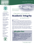 January 2 0 0 3 Vo l . 1 N o . 3 Reflecting the Scholarship of Teaching and Learning at the University of Saskatchewan In This Issue.... One Step Ahead of the Palm Pilots: Creating a Culture of Academic Honesty at the U of S CREATING A CULTURE OF Academic Integrity Academic Integrity Why Do Students Cheat and What Can Teachers Do? How Can Teachers Prevent Plagiarism? Anti-Plagiarism Tips From the Author of “The Plagiarism Handbook” The Risk of Integrity: An Ethical Contradiction? The Internet and Integrity Thinking Critically About Online Resources Ten Principles of Academic Integrity AT THE by Eileen Herteis, Bridges Editor U OF S T he University of Saskatchewan, like universities across North America, is grappling with academic integrity: plagiarism, cheating, and other forms of dishonesty. Advances in technology have increased the choices for those who want to cheat or plagiarize; now many university teachers and administrators are turning to that same technology to detect dishonesty, using software such as turnitin.com or search engines like Google. But academic integrity is about more than just catching cheaters, and thereby encouraging (even unintentionally) an atmosphere of suspicion and distrust by overemphasizing detection tools. Academic integrity involves creating an ethos or culture of trust, responsibility, and honesty. This special issue of “Bridges” looks forward to the kind of campus culture we want to create at the U of S. I have chosen articles from elsewhere in Canada, from Britain, and from the U.S. to show that integrity is an international concern. pla·gia·rize: Function: verb transitive senses: to steal and pass off (the ideas or words of another) as one’s own: use (another’s production) without crediting the source intransitive senses: to commit literary theft: present as new and original an idea or product derived from an existing source Etymology: Latin plagiarus, literally, kidnapper, from plagium netting of game, kidnapping, from plaga net, trap Merriam Webster’s Collegiate Dictionary, consulted online, September 24, 2002 Gwenna Moss Teaching & Learning Centre 37 Murray Building • 966-2231 January 2003 Vol. 1 No. 3 The Gwenna Moss Teaching & Learning Centre University of Saskatchewan Room 37 Murray Building 3 Campus Drive Saskatoon, SK S7N 5A4 Phone (306) 966-2231 Fax (306) 966-2242 e-mail : corinne.f@usask.ca Web site : www.usask.ca/tlc Bridges is distributed to every teacher at the University of Saskatchewan and to all the Instructional Development Offices in Canada, and some beyond. It is freely available on the world wide web through the TLC web site. Your contributions to Bridges will reach a wide local, national, and international audience. Please consider submitting an article or opinion piece to Bridges. Contact any one of the following people; we’d be delighted to hear from you! Ron Marken TLC Director Phone (306) 966-5532 Ron.Marken@usask.ca Eileen Herteis TLC Programme Director & Bridges Editor Phone (306) 966-2238 Fax (306) 966-2242 eileen.herteis@usask.ca Christine Anderson Obach Programme Coordinator Phone (306) 966-1950 Christine.Anderson@usask.ca Corinne Fasthuber Assistant Phone (306) 966-2231 corinne.f@usask.ca Joel Deshaye Instructional Technology Consultant (306) 966-2245 email: joel.deshaye@usask.ca ISSN 1703-1222 ONE STEP AHEAD OF THE PALM PILOTS: CREATING A CULTURE OF ACADEMIC HONESTY AT THE U OF S On Friday September 27th, Dr. Gordon Barnhart, University Secretary, joined Joan Bobyn, Pharmacy, and Susan McDonald, English, to co-present the first session in the TLC’s Academic Integrity series. The three presenters examined the responsibilities of both students and teachers in avoiding and dealing with plagiarism and other forms of academic dishonesty. Is the seductiveness of the internet the reason for increased Gordon Barnhart examples of dishonesty and “cut and paste” plagiarism? Or is it the mounting pressure on students, many of whom are working full-time outside school, to get good grades rather than actually acquire knowledge? Whatever the causes, the presenters agreed that teachers who do not act to create a culture of honesty in their classrooms, and who do not enforce ethical standards, lack integrity as much their students who cheat and plagiarize. Two more Academic Integrity sessions were very successful. On October 24th, Susan McDonald related her experiences with detecting plagiarism using the search engine Google. On November 1st, Alec Couros and James McNinch from the University of Regina examined the factors— internal, external, and even cultural—that lead students to plagiarize. The presenters asked, “How can we educate students and design assignments to ensure that our culture of integrity is more about prevention that detection?” Other Integrity sessions are coming. Watch for details about a special Integrity videoconference in April, 2003, and planning has already begun for a campus-wide Academic Honesty week in Fall, 2003. The TLC is grateful for the support we received from the Tecnololgy Enhanced Learning Fund (TEL) for our Academic Integrity programming. For more information about TEL, visit www.usask.ca/ vpacademic/tel/. For details about the University of Saskatchewan’s policies on academic honesty and useful information and links for students and teachers alike, visit the honesty web site www.usask.ca/honesty. 2 ACADEMIC INTEGRITY The University of Saskatchewan is not alone in its focus on integrity. Julia Christensen Hughes, University of Guelph, provides some facts and figures in the following article. Some facts Integrity is at the heart—the core value—of the academic enterprise. Achieving it requires an ongoing commitment by all levels of the university community—students, staff, faculty, and administrators. Unfortunately, recent articles in academic journals and the popular press have brought into question our collective success in living this value. • Students w
