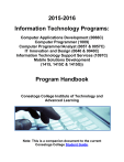 2015-2016 Information Technology Programs: Computer Applications Development (0066C) Computer Programmer (1009) Computer Programmer/Analyst (0057 & 0057C) IT Innovation and Design (0040 & 0040C) Information Technology Support Services (1097C) Mobile Solutions Development (1415, 1415C & 1415G)) Program Handbook Conestoga College Institute of Technology and Advanced Learning Note: This is a companion document to the current Conestoga College Student Guide. Table of Contents Table of Contents ............................................................................................................ 2 1) PROGRAM HANDBOOK GUIDELINES .................................................................. 4 2) PROGRAM ACADEMIC TEAM ................................................................................ 4 2.1 Welcome ................................................................................................................ 4 2.2 Program Administration and Faculty ...................................................................... 4 3) PROGRAM OVERVIEW .......................................................................................... 6 3.1 Program Description .............................................................................................. 6 3.2 Program Design ..................................................................................................... 6 3.3 Program Outcomes................................................................................................ 6 4) PROGRAM ACADEMIC ACHIEVEMENT AND REQUIREMENTS.......................... 6 4.1 Academic Promotion Decisions ............................................................................. 6 4.2 Clearance of Academic Deficiency ........................................................................ 8 4.3 Probation ............................................................................................................... 9 4.4 Discontinuance ...................................................................................................... 9 4.5 Re-admission ......................................................................................................... 9 4.6 Graduation ............................................................................................................. 9 4.7 Withdrawal ............................................................................................................. 9 5) PROGRAM INFORMATION .................................................................................... 9 5.1 Academic Assistance............................................................................................. 9 5.2 Academic Dates..................................................................................................... 9 5.3 Attendance .......................................................................................................... 10 5.4 Awards ................................................................................................................. 12 5.5 Communication and Emailing Requirements ....................................................... 12 5.6 Course Changes (Adding/Dropping) .................................................................... 12 5.7 Co-operative Education Eligibility ........................................................................ 13 5.8 Credit Transfers (Exemptions) ............................................................................. 13 5.9 Evaluations (deadlines, tests and examinations) ................................................. 13 5.10 General Education Electives .............................................................................. 14 5.11 Prior Learning Assessment and Recognition (PLAR) ........................................ 14 5.12 Program Advisory Committee ............................................................................ 14 5.13 Program Transfer............................................................................................... 14 5.14Student Feedback............................................................................................... 15 2 5.15 Student Representation ..................................................................................... 15 6) FACILITY INFORMATION ..................................................................................... 16 6.1 After Hours Access .............................................................................................. 16 7) SAFETY INFORMATION ....................................................................................... 16 7.1 Safety and Security Information ........................................................................... 16 7.2 Basic Safety ......................................................................................................... 17 7.3 Emergency Telephone Messages ....................................................................... 17 7.4 Student Protection Acknowledgement ................................................................. 17 8) STUDENT SERVICES INFORMATION ................................................................. 17 9) COLLEGE-WIDE ACADEMIC POLICIES/PROCEDURES .................................... 18 10) PROGRAM HANDBOOK REVISION LOG .......................................................... 18 3 1) PROGRAM HANDBOOK GUIDELINES The purpose of this handbook is to provide students with program specific details and other important information. The material in this handbook is accurate at the date of posting, and is applicable for the current academic year. Students will be informed of handbook changes that occur, if any, through college email. Program handbooks are updated yearly and students must check their program handbook for the current edition. 2) PROGRAM ACADEMIC TEAM 2.1 Welcome Welcome to the School of Engineering and Information Technology Conestoga offers a full range of engineering and informa
