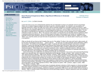 Does Research Experience Make a Significant Difference in Graduate Admissions? - Psi Chi quicklinks PUBLICATIONS Publications Eye on Psi Chi Vol. 5 Iss. 2 The "Other" Founders... Honor Students... Undergraduate... Sex, Lies, and... Demystifying... Does Research... What Can... The Advisor-Student... Get Involved! National Conventions... Does Research Experience Make a Significant Difference in Graduate Admissions? Graduate School Promotion of Research by Lynn H. Collins - La Salle University I know that many of you are undergraduate students who are interested in going on to graduate school in psychology. Others are in master's degree programs and hope to get into a doctoral program. As a student, your perceptions of graduate admissions criteria may differ from those used by graduate admissions committees (Cashin & Landrum, 1991). Although you may accurately recognize the importance of your overall GPA, you probably underestimate the importance of your verbal and quantitative GRE scores, your autobiographical statement, and your letters of recommendation. You are also likely to overestimate the importance of extracurricular activities, practica, and the prestige of your undergraduate institution (Cashin & Landrum, 1991). The purpose of this article is to describe the real role that research experience plays in graduate admissions decisions. You are already ahead of the game. Most students don't bother to investigate how graduate schools select students until they are rejected by the schools to which they apply (Landrum, Jeglum, & Cashin, 1994). If you read this article and seek the kinds of experiences it recommends, you may be able to improve your chances of acceptance. Often we faculty tell you that we had it tougher than you do. We walked 10 miles in the snow and lived in utter poverty, all for the honor of studying for long hours . . . which is all true . . . but time has not made graduate school admissions criteria less stringent. The criteria have actually gotten tougher. In talking with other graduate program admissions committee members, it seems that although the GRE scores required have stayed about the same, these days most successful applicants have already presented their own research at a conference. Many of today's applicants have authored or coauthored papers. These things were not typical of applicants when I applied to graduate programs. Although I have served on admissions committees myself, I thought it was important to examine the literature on graduate admissions. I found that with one or two exceptions, the data is consistent with my experience. Some of the things one might think are important are actually not so important. Your score on the advanced Psychology GRE is less important than your Verbal and Quantitative scores (Bonfazi, Crespy, & Rieker, 1997; Landrum & Cashin, 1991; Munoz-Dunbar & Stanton, 1999; Purdy, Reinehr, & Swartz, 1989). Admissions committees often believe that if you have strong basic academic skills, then they can teach you psychological theories. Practica, internships, or field placement experiences and nonpsychology activities are not given as much weight in PhD program admissions. Although it may be that these hands-on experiences are important for those wishing to enter PsyD programs in clinical psychology, researchers who have studied admissions to PhD programs in experimental, clinical, counseling, and school psychology have found that practica, internships, or field placement experiences are not as important as GPA, GRE scores, letters of recommendation, and research experience (Hines, 1986; Landrum & Cashin, 1991; Landrum, Jeglum, Cashin, 1994; Purdy, Reinehr, & Swartz, 1989). Researchers conducting the most recent study of graduate admission directors of APA programs in clinical psychology found that research experience or commitment to research was the most important factor in selecting graduate students, followed by letters of recommendation, statement of purpose, quantitative GRE score, and other factors (Munoz-Dunbar & Stanton, 1999). In another study of APA-approved clinical psychology programs, research experience was only exceeded http://www.psichi.org/pubs/articles/article_67.asp (1 of 4)4/24/2006 9:34:28 AM Does Research Experience Make a Significant Difference in Graduate Admissions? - Psi Chi in importance by verbal and quantitative GRE scores. These were followed in importance by letters of recommendation and grades (Hines, 1986). Purdy, Reinehr, and Schwartz (1989) looked at the priorities of admission committees in a variety of types of graduate psychology programs. They also found that admission committees emphasized GREs (verbal, quantitative, and total), letters of recommendation, research experience, and GPA more than clinical experience, psychology GRE, analytic GRE, previous graduate course work, and courses taken. Landrum, Jeglum, and Cashin (1994) found that GPA, GRE, and letters of recommendation are important, as are autobiographical statements, conference presentations, and publications. On the other hand, when I've served on PsyD admissions committees, I've noticed that clinical work experiences were valued more highly than research. This observation was confirmed by Bonifazi, Crespy, and Rieker (1997). If you apply to PsyD programs, it will be important that you ask the professors and clinical supervisors who are familiar with your clinical skills to write letters for you. Even on PsyD admissions committees, however, research experience may still be valued. After all, most professors, even those who teach in PsyD programs, hold PhDs themselves and are often interested in research. When Hines (1986) and Bonfazi, Crespy, and Rieker (1997) asked faculty teaching in doctoral programs whether any particular course or activity would have made a student with a master's degree more attractive for admission, the most common response was research involvement. In Bonfazi, Crespy, and Rieker's (1997) study, 33% of the r