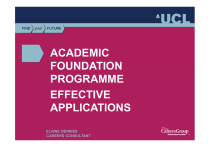 UCL CAREERS ACADEMIC FOUNDATION PROGRAMME EFFECTIVE APPLICATIONS ELAINE DENNISS CAREERS CONSULTANT UCL CAREERS Aims Examine different types of questions you might encounter Provide hints and tips on how to approach questions and structure answers How to present your evidence effectively UCL CAREERS How can you stand out? – Understand recruiters’ hopes and fears – Allay fear and confirm hope – ATIC = Ability To Identify Criteria UCL CAREERS What have you done already? Downloaded application form Read and understood the person specifications for your preferred Units of Applications Read through the applicant handbook Looked at the Academic Compendium and Rough Guide Updated your cv and e-portfolio Talked to F1/F2 doctors on AFP Reflected! UCL CAREERS What are selectors looking for? Besides good clinical skills and consistently high academic achievement, selectors are looking for An understanding of the principles of medical research An understanding of the importance of effective teaching An understanding of the principles of ethical research UCL CAREERS Personal Attributes Patient focused Ability to prioritise tasks and take appropriate decisions Ability to work effectively with others Ability to communicate effectively Initiative and ability to deal with pressure/challenge Commitment to learning/professional development Self awareness and insight into boundaries of own abilities UCL CAREERS Different types of questions Understanding questions Scenario questions Competency questions Experience questions Reflective Learning questions Motivation questions Achievement questions UCL CAREERS What type of question? We recognise that applicants will have had varying levels of research, management and teaching experience. Please give one example from your post-secondary education career to date, of a research project, management or teaching experience and its significance to your application for an academic foundation programme UCL CAREERS What’s being assessed? Provide an overview (list) of your contribution(s) to academic life during your medical school career. Using one of these examples, describe your contribution to academic life during your medical school career and how it will be relevant to an academic medical career. UCL CAREERS Competency question example Academic medicine requires an individual to work successfully in a team. Describe a time that will be relevant to your foundation training when you have worked as a member of a successful team and define your role and contribution to this success UCL CAREERS Verbs not adjectives Supporting Enabling Encouraging Explaining Responding Assessing Respecting Listening Requesting Sharing Demonstrating UCL CAREERS Think about team roles Plant (creative) Resource Investigator Monitor Evaluator Co-ordinator Implementer Completer Finisher Shaper Specialist Based on Belbin’s Team Roles UCL CAREERS Your evidence laid BARE(R) – Background – setting, situation, objective – Actions – what you did, how you did it – Rationale– your thinking and choices – End result – achievements and outcomes – Reflection – learning and lesson UCL CAREERS Evidence for motivation What’s your story? How does it link to the AFP? Past Present Future Understanding the role, making links UCL CAREERS Evidence for motivation Research — What have you discovered about the Academic Foundation Programme and how? What’s involved? What challenges might you face? Decisions — What choices have you made leading up to this stage? Actions and Behaviour — What have you done to gain relevant experience, knowledge and skills? Interests — What do you devote time to inside and outside medicine? Goals — How will this programme help you to achieve your longer term aims and ambitions? UCL CAREERS Sample Answer 1 - Motivation Please identify your reasons for applying for this academic programme of Foundation Training (150 words) Academic medicine is integral to the development of clinical medicine and to making advances in patient care. I developed skills in research analysis and methodology during my intercalated BSc for which I received a first class degree. As an AHO at Mayday Hospital I was also involved in an audit into X which allowed me to see the direct application of research and critical analysis to the improvement of clinical activity. I also believe in the importance of communicating the results of research and medical developments through effective teaching, and have had various opportunities to become involved in teaching, including anatomy and clinical skills demonstrating, peer-led PBL teaching and organizing revision sessions for finalists through the GP Society. I aspire to an academic career where I can combine my passion for research and teaching with my clinical interests. UCL CAREERS Critical commentary Academic medicine is integral to the development of clinical medicine and to making advances in patient care. But why are YOU interested in academic medicine? I developed skills in research analysis and methodology (such as?) during my intercalated BSc for which I received a first class degree. As an AHO at Mayday Hospital I was also involved in an audit into X which allowed me to see the direct application of research and critical analysis to the improvement of clinical activity. (but do you need to be an academic clinician to be involved in audit?) I also believe in the importance of communicating the results of research and medical developments through effective teaching, and have had various opportunities to become involved in teaching, including anatomy and clinical skills demonstrating, peer-led PBL teaching and organizing revision sessions for finalists through the GP Society. (What did you learn about effective teaching from these experiences? What skills would you like to develop as part of an academic career?) I aspire to an academic career where I can combine my passion for research and teaching with my clinical interest