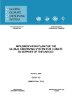 WORLD METEOROLOGICAL ORGANIZATION INTERGOVERNMENTAL OCEANOGRAPHIC COMMISSION IMPLEMENTATION PLAN FOR THE GLOBAL OBSERVING SYSTEM FOR CLIMATE IN SUPPORT OF THE UNFCCC October 2004 GCOS - 92 (WMO/TD No. 1219) UNITED NATIONS ENVIRONMENT PROGRAMME INTERNATIONAL COUNCIL FOR SCIENCE © 2004, World Meteorological Organization NOTE The designations employed and the presentation of material in this publication do not imply the expression of any opinion whatsoever on the part of the Secretariat of the World Meteorological Organization concerning the legal status of any country, territory, city or area, or of its authorities, or concerning the delimitation of its frontiers or boundaries. Editorial Note: This report has been produced without editorial revision by the WMO Secretariat. It is not an official WMO publication and its distribution in this form does not imply endorsement by the Organization of the ideas expressed. IMPLEMENTATION PLAN FOR THE GLOBAL OBSERVING SYSTEM FOR CLIMATE IN SUPPORT OF THE UNFCCC October 2004 GCOS - 92 (WMO/TD No. 1219) (Intentionally blank) Errata Date 26 October 2004 Position Revision p.87, for ECV ”Permafrost…”, column 4 “Derived near-surface temperature and moisture (e.g., ERS/Radarsat, AVHRR, MODIS, AMSR-E).” p.87, for ECV “Permafrost…”, column 5 “No direct operational sensors to detect permafrost; no products.” p.96, line 43 “Action: Maintain the current 125 CALM sites, ensure that all the other 287 boreholes…” p.96, line 44 “..add 150 additional sites as identified by GTN-P including…” p.96, lines 45-46 “…North American alpine and lowlands as part of the IPY Thermal State of Permafrost campaign, ensure…” p.96, lines 57-58 “This will require similar funding to the permafrost sites for coordination and measurements.” p.97, line 3 “Who: Parties’ national services and NSIDC, with guidance from GTN-P and International…” p.97, lines 5-6 “Time-Frame: Complete by 2010. Performance Indicator: Actions using published guidelines.” (Intentionally blank) Table of Contents EXECUTIVE SUMMARY 1. Introduction ................................................................................................................................ 1 2. Meeting the Needs of the UNFCCC for Climate Information.................................................. 1 3. Agents for Implementation........................................................................................................ 3 4. Access to Climate Data ............................................................................................................. 5 5. Availability of Climate Products ............................................................................................. 10 6. Improving the System.............................................................................................................. 11 IMPLEMENTATION PLAN FOR THE GLOBAL OBSERVING SYSTEM FOR CLIMATE IN SUPPORT OF THE UNFCCC 1. Background and Introduction................................................................................................. 13 2. The Strategic Approach to Implementation .......................................................................... 15 2.1. 2.2. 2.3. 2.4. 2.5. 2.6. 2.7. 2.8. 3. Basis Provided by Second Adequacy Report......................................................................... 15 Agents for Implementation......................................................................................................16 Criteria Used to Assign Priority...............................................................................................17 Phased Approach ................................................................................................................... 17 Global and Integrated Approach............................................................................................. 17 Building Capacity .................................................................................................................... 18 Measuring Progress – Assessing Implementation ................................................................. 19 Cost Definitions....................................................................................................................... 20 Over-Arching/Cross-Cutting Actions ..................................................................................... 20 3.1. 3.2. 3.3. 3.4. 3.5. 3.6. 3.7. 3.8. Planning, Reporting and Oversight......................................................................................... 20 Toward Sustained Networks and Systems............................................................................. 23 International Support for Critical Networks – Technical Cooperation..................................... 24 Earth Observation Satellites ...................................................................................................24 Integrated Climate Products ................................................................................................... 25 Historical Data and Palaeo-reconstructions of Past Climates................................................ 27 Data Management and Stewardship ...................................................................................... 30 Scientific and Technological Challenges................................................................................ 32 ATMOSPHERIC CLIMATE OBSERVING SYSTEM ................................................................. 33 4. 4.1. 4.2. 4.3. 4.4. 4.5. 4.6. 4.7. Atmospheric Domain – Surface.............................................................................................. 33 Atmospheric Domain – Upper-Air........................................................................................... 40 Atmospheric Domain – Composition ...................................................................................... 47 Atmospheric Domain – Dat