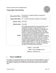 University of California Policy CopyrightOwnership Copyright Ownership Responsible Officer: Vice Provost - Academic Planning, Programs & Coordination Responsible Office: AC - Academic Planning, Programs & Coordination Issuance Date: 8/19/1992 Effective Date: 8/19/1992 This statement sets forth the University's Policy on the Copyright Ownership for works produced at, by, or through the University of California, its campuses, and the Department of Energy Laboratories. This Policy applies to University employees, students, and other persons or entities using designated University facilities or acting under contract with the University for Scope: commissioned works. This Policy addresses ownership of copyright; it does not address ownership or access to the underlying research results or data, as covered in Academic Personnel Manual Section 020. It is does not change or affect obligations under the University of California Patent Policy. If, in any case, the application of the two policies gives rise to a conflict, the ownership principles of the Patent Policy shall apply Contact: Joanne Miller Email: joanne.miller@ucop.edu Phone #: (510) 987-6141 I. POLICY SUMMARY The creation of copyrighted works is one of the ways the University fulfills its mission of contributing to the body of knowledge for the public good. The University encourages the creation of original works of authorship and the free expression and exchange of ideas. Copyright Ownership Page 1 of 7 University of California Policy CopyrightOwnership Copyright Ownership This Policy is intended to embody the spirit of academic tradition, which provides copyright ownership to faculty for their scholarly and aesthetic copyrighted works, and is otherwise consistent with the United States Copyright Law, which provides the University ownership of its employment-related works. Pursuant to Regents' Standing Order 100.4 (gg), the President has responsibility for all matters relating to intellectual property, including copyrights in which the University is involved. II. DEFINITIONS For purposes of this Policy, the following definitions apply: Copyright: Copyright is the intangible property right granted by Federal statute for an original work fixed in a tangible form of expression. Copyright provides the owner with the following exclusive rights in a work: to reproduce, to prepare derivative works, to distribute by sale or otherwise, to perform publicly, and to display publicly. Designated Academic Appointees: Those University employees who have a general obligation to produce scholarly/ aesthetic works. Included are all appointees in the Professor series, In-Residence series, and the Professional Research series. Appointees in other academic titles may also be designated by the appropriate Chancellor or Vice President as having the obligation to produce scholarly/aesthetic works Independent Academic Effort: Inquiry, investigation, or research carried out by designated academic appointees to advance knowledge or the arts where the specific choice, content, course, and direction of the effort is determined by the designated academic appointee without direct assignment or supervision by the University. The general obligation of designated academic appointees to produce scholarly/aesthetic works is considered independent academic effort. License: A contract in which a copyright owner grants to another permission to exercise one or more of the rights under copyright. Originator (s): One who produces a work by his or her own intellectual labor. When there is more than one originator, the ownership of each originator's contribution shall be considered separately pursuant to this Policy. Permissible Consulting Activities: Professional or scholarly services provided by University employees for compensation, which do not interfere with regular University duties, do not utilize University resources, and are not prohibited by terms of the University employment contract or other applicable University agreements or policies. Royalties: A payment made to an owner of a copyright for the privilege of practicing a right under the copyright. Copyright Ownership Page 2 of 7 University of California Policy CopyrightOwnership Copyright Ownership Sponsor: An organization or agency which provides funding, equipment, or other support for the University to carry out a specified project in research, training, or public service pursuant to a written agreement. Sponsors include Federal, State, local, and other governmental entities as well as private industry, educational institutions, and private foundations. University Facilities: Buildings, equipment, and other facilities under the control of the University, that are designated by the appropriate Chancellor, Laboratory Director, or Vice President as requiring an advance agreement, from non-University personnel and University personnel acting outside the scope of their employment, concerning the disposition of any copyrighted works that are originated with the use of these facilities. Such facilities normally include campus computer centers and normally do not include University libraries. For the purposes of this Policy, the Department of Energy Laboratories are considered to be under the control of the University. University Funds: Funds, regardless of source, that are administered under the control, responsibility, or authority of the University. University Resources: University funds or facilities. Work: Any copyrighted expression, including literary work (written lectures are included); musical work including any accompanying words; dramatic work, including any accompanying music; pantomimes and choreographic work; pictorial, graphic, and sculptural work; motion pictures and other audiovisual work; sound recordings; and computer software. III. POLICY TEXT A. Copyright Ownership by Category of Work 1. Scholarly/Aesthetic Work A scholarly/aesthetic work is a work originated by a designated academic appointee resul