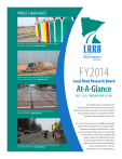 PROJECT HIGHLIGHTS We analyzed traffic sign retroreflectivity to improve our estimates of expected traffic sign life. Report 2014-20 We developed a tool to calculate the impact of heavy vehicles on local asphalt roads. Report 2014-32 FY2014 Local Road Research Board At-A-Glance JULY 1, 2013, THROUGH JUNE 30, 2014 We investigated the premature deterioration of colored concrete pavements. Report 2014-26 We created a guide for choosing pedestrian crossing treatments at uncontrolled intersections. Report 2014-21 This publication summarizes the Local Road Research Board’s Fiscal Year 2014 research activities. It provides a list of completed and ongoing research and implementation projects, categorized by topic area. For more than 55 years, the LRRB has brought important developments to transportation engineers throughout Minnesota—from new ways to determine pavement strength to innovative methods for engaging the public. Today, the LRRB remains true to its important mission: supporting and sharing the latest transportation research applications with the state’s city and county engineers. Bruce Hasbargen LRRB Chair Beltrami County Welcome to the FY2014 Local Road Research Board At-A-Glance. We are pleased to present the work that the LRRB has supported over the past year as we continue our commitment to help Minnesota cities and counties maintain and improve their transportation networks and practices. The LRRB works because of you—the city and county representatives who identify projects to pursue, participate on project panels, work to implement project results and provide feedback to continually improve LRRB operations. Our members are here to serve you and represent your interests as city and county engineers. Feel free to contact any one of us to discuss your research needs and ideas. Julie Skallman MnDOT State Aid Division LRRB MEMBERS Bruce Hasbargen (Chair), Beltrami County Julie Skallman, MnDOT State Aid Division Lyndon Robjent, Carver County Kaye Bieniek, Olmsted County Tim Stahl, Jackson County Steve Koehler, City of New Ulm John Powell, City of Savage Tom Ravn, MnDOT Office of Construction and Innovative Contracting Linda Taylor, MnDOT Research Services & Library Laurie McGinnis, University of Minnesota Center for Transportation Studies 2014 LRRB members: (standing, from left) Tim Stahl, Lyndon Robjent, John Powell, Kaye Bieniek, Tom Ravn; (seated, from left) Linda Taylor, Julie Skallman, Steve Koehler, Bruce Hasbargen, Laurie McGinnis. RESEARCH IMPLEMENTATION COMMITTEE MEMBERS Jeff Hulsether (Chair), City of Brainerd Dave Robley (Vice Chair), Douglas County Mike Flaagan, Pennington County Guy Kohlnhofer, Dodge County Tim Stahl, Jackson County Klayton Eckles, City of Woodbury Merle Earley, MnDOT District 4 Ted Schoenecker, MnDOT State Aid Division Jim Grothaus, University of Minnesota Center for Transportation Studies Hafiz Munir, MnDOT Research Services & Library staff Bruce Holdhusen, MnDOT Research Services & Library staff 2 2014 RIC members: (standing, from left) Joel Ulring (staff), Guy Kohlnhofer, Tim Stahl, Dave Robley, Ted Schoenecker, Chris Kufner (staff), Bruce Holdhusen (staff); (seated, from left) Hafiz Munir, Jeff Hulsether, Klayton Eckles, Mike Flaagan, Merle Earley. Not pictured: Jim Grothaus. LRRB RESEARCH Active Projects in FY2014 COMMON FUNDING SOURCES LRRB Local Road Research Board SP&R State Planning & Research (FHWA) SRP MnDOT State Research Program COPTRSCooperative Program for Transportation Research and Studies Projects highlighted on the front cover are indicated below by bold text and a darker background. A mark in the “TS” column indicates that a Technical Summary for this project can be found at mndot.gov/research. Bridges & Structures LRRB Identifier Title Report #/ Status Investigator End Date Funding Source Project Cost TS? INV 910 Partially Grouted Riprap Lab Flume Study (Matrix Riprap) In Progress Jeff Marr, University of Minnesota 2/28/15 LRRB, SRP $124,831 INV 930 Development and Integration of Advanced Timber Bridge Inspection Techniques for NBIS In Progress Brian Brashaw, University of Minnesota– Duluth 1/31/15 LRRB, Partnership Funds $199,786 INV 938 Culvert Design, Installation and Maintenance Independent Online Distance Learning (ODL) Course In Progress Jim Grothaus, University of Minnesota–CTS 10/31/14 LRRB $55,000 INV 940 INV 940: Development of Cost-Effective Timber Bridge Repair Techniques for Minnesota In Progress Brent Phares, Iowa State University 9/30/15 LRRB, Other DOTs $299,582 INV 944 MPR-4(007): Minnesota Steel Culvert Pipe Service Life Map In Progress Jeff Marr, University of Minnesota 8/31/15 LRRB, SRP, SP&R $60,678 INV 945 Next Generation Bridge Management Tools and Inspection In Progress Basak Aldemir Bektas, Iowa State University 6/30/15 LRRB, SP&R, SRP $72,072 Report #/ Status Investigator End Date Funding Source Project Cost TS? 2014-30 John Gulliver, University of Minnesota 8/31/14 LRRB, SRP $314,000 X Environmental LRRB Identifier Title INV 894 Assessing and Improving Pollution Prevention by Swales INV 897 Developing Salt-Tolerant Sod Mixtures for Use as Roadside Turf in Minnesota In Progress Eric Watkins, University of Minnesota 2/28/15 LRRB $176,516 INV 932 Determination of Effective Impervious Area in Urban Watersheds In Progress John Gulliver, University of Minnesota 7/31/15 LRRB $150,000 INV 965 Study of Deicing Salt Accumulation and Transport Through a Watershed In Progress William Herb, University of Minnesota 2/28/17 LRRB $119,339 Maintenance Operations & Security LRRB Identifier Title Report #/ Status Investigator End Date Funding Source Project Cost INV 865 TPF-5(153): Optimal Timing of Preventive Maintenance for Addressing Environmental Aging in HMA Pavements In Progress Mike Anderson. Asphalt Institute 11/30/14 LRRB, SP&R, Other Federal Funds $286,185 INV 886 Cost-Effective Pavement Preservation Solutions for the Real World 2014-33 W. James Wilde, Minnesota State University, Mankato 9/7/14 LRRB