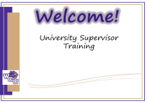University Supervisor Training Agenda • • • • • • • • Welcome & Introductions Roles & Responsibilities Intern I Intern II/Student Teachers Travel Procedural Information Resource Folder - Dropbox Q& A OFE Staff • Dr. Chená Flood – Director OFE • Amanda Chapman – Lead University Supervisor & Instructor • Monica Miller – New Early Field Experience Placement Coordinator • Eric Gatilogo – Administrative Assistant What does it mean to be a University Supervisor? Relationships in Internship University Supervisor Intern and Cooperating Teacher Seminar Instructor Academic Supervisor (EDSE undergrads only) Roles & Responsibilities • Serve as the liaison between the intern and the university. • Foster a supportive relationship with intern, cooperating teacher, and host school • Roles and Responsibilities still differ from program to program so please refer to the 2015-2016 Handbook. CHANGES Previously Now Autonomy within the WCU guidelines and requirements You cannot ask students to do/submit/etc. anything that is not listed as on their program’s requirement list. • You MUST follow each program requirements. Unless there are issues that result in an action plan. Program Intern I Intern II/Student Teaching Elementary Ed. Required Required Middle Grades Required Required Inclusive Ed. Required Required Art Ed. Optional Required HPE Required Required Music Required Required HS-Math Optional Required HS-English Required Required HS-History/SS Required Required HS-Science Optional Required BK For Licensure SPED For Licensure FYI Program Requirements • Some programs have different requirements for the internship/student teaching component of the program. • For example, some programs require all students to complete an Intern I experience. • Some programs do not require an Intern I experience, but encourage the students to go through it. • Some programs do not offer an Intern I experience at all. It can make it challenging to keep track of your interns if you are telling them one thing and a seminar instructor is telling them something else. • Be aware that one intern’s experience may look completely different than another intern’s experience in terms of completing requirements. INTERNSHIP I What is Intern I? Intern I - Internship I is the first component of the full year internship experience. - Required to start the Internship I experience during the first week of WCU classes each semester. - The number of internship hours each week varies by program, though in most cases Intern I candidates are in their host classrooms the equivalent of two full days (15 hours) per week. - Interns observe the cooperating teacher, participate in classroom activities, and plan and teach lessons as required by program specific guidelines. Interns follow WCU’s calendar during Internship I except for initial start dates. Interns are expected to continue in their placements until the final week of classes (not exam week) at WCU. What’s New? • Intern I Syllabus will now serve as the Syllabus and Orientation Checklist. • These two documents have been merged together. • Please share with student and CT. University Supervisor Visits for Intern I 3-4 in all, including at least 2 face-to-face observations 1. Initial Contact Review this checklist, exchange contact information, answer questions, and clarify expectations for the semester. 2. Formal Observation Plans for EACH observation must be approved by the Cooperating Teacher at least two days prior to the lesson and then emailed to the University Supervisor/Academic Supervisor prior to scheduled observation. Written feedback will be provided to the Intern for each formal observation. 3a. Midterm Conference 3b. Formal Observation 4. Final Conference The University Supervisor may schedule a formal observation at this time to correspond with this school visit. The midterm will be a conference among the US, CT, AS, and Intern. The conversation should include the completion of the Intern I midterm evaluation form and should be formative in nature, focusing on the intern’s strengths and needed growth areas. Provide meaningful written feedback to intern. The university supervisor may schedule a formal observation to correspond with this school visit. The final evaluation will be a conference with the US, CT, AS, and Intern. The conversation should include the completion of the Intern I final evaluation form and should be somewhat summative— describing the Intern’s progress during the semester—but should primarily focus on the intern’s strengths and needed growth areas going into the Intern II semester. The Certification of Teaching Capacity may be introduced so the CT and the Intern will be prepared to use it next semester. The discussion might also include lesson planning and the opening schedule for next semester. The Intern I grade sheet should be completed as well. Cooperating Teacher Feedback The cooperating teacher will provide regular formative feedback on lessons taught and overall teaching knowledge, skills, and dispositions. Cooperating teachers are required to provide written feedback for at least two lessons during the internship; one prior to the mid-term conference and one prior to the final evaluation conference. Cooperating Teachers MUST Initial the U.S. Checklist to certify that they have given feedback to their interns. Video Recordings Lessons and Observations At least one lesson during the semester should be video recorded. The purposes of the video lesson are for the intern to be able to evaluate his/her teaching and to practice video recording for future edTPA work. The intern will complete a self-reflection for the video and then upload the video and self-reflection on TaskStream within the Initial Licensure Portfolio. The Intern should be sure to check the picture and audio. The University Supervisor will provide written feedback. Individual programs, not University Supervisors, determi