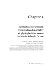 Chapter 4 Latitudinal variation in virus-induced mortality of phytoplankton across the North Atlantic Ocean Kristina D. A. Mojica1, Jef Huisman2, Steven W. Wilhelm3, and Corina P. D. Brussaard1,2 Department of Biological Oceanography, Royal Netherlands Institute for Sea Research (NIOZ), P.O. Box 59, 1790 AB Den Burg, Texel, The Netherlands. 2 Department of Aquatic Microbiology, Institute for Biodiversity and Ecosystem Dynamics (IBED), University of Amsterdam, P.O. Box 94248, 1090 GE Amsterdam, The Netherlands. 3 Department of Microbiology, University of Tennessee, Knoxville, Tennessee 37996, USA. 1 The ISME Journal (2015) in press Chapter 4 Abstract Viral lysis of phytoplankton constrains marine primary production, food web dynamics, and biogeochemical cycles in the ocean. Yet, little is known about the biogeographical distribution of viral lysis rates across the global ocean. To address this, we investigated phytoplankton group-specific viral lysis rates along a latitudinal gradient within the North Atlantic Ocean. The data show large-scale distribution patterns of different virus groups across the North Atlantic that are associated with the biogeographical distributions of their potential microbial hosts. Average virusmediated lysis rates of the picocyanobacteria Prochlorococcus and Synechococcus were lower than those of the picoeukaryotic and nanoeukaryotic phytoplankton (i.e., 0.14 d-1 compared to 0.19 and 0.23 d-1, respectively). Total phytoplankton mortality (virus plus grazer-mediated) was comparable to the gross growth rate, demonstrating high turnover rates of phytoplankton populations. Virusinduced mortality was an important loss process at low and mid latitudes whereas phytoplankton mortality was dominated by microzooplankton grazing at higher latitudes (> 56°N). This shift from a viral-lysis-dominated to a grazing-dominated phytoplankton community was associated with a decrease in temperature and salinity, and the decrease in viral lysis rates was also associated with increased vertical mixing at higher latitudes. Ocean-climate models predict that surface warming will lead to an expansion of the stratified and oligotrophic regions of the world’s oceans. Our findings suggest that these future shifts in the regional climate of the ocean surface layer are likely to increase the contribution of viral lysis to phytoplankton mortality in the higher-latitude waters of the North Atlantic, which may potentially reduce transfer of matter and energy up the food chain and thus affect the capacity of the northern North Atlantic to act as a long-term sink for CO2. 120 Large-scale variation in marine viral lysis rates Introduction Viruses are important mortality agents for marine phytoplankton (Evans et al. 2003; Brussaard 2004a; Tomaru et al. 2004; Baudoux et al. 2006). Through the lysis of their autotrophic hosts viruses regulate primary production (Suttle et al. 1990) and play key roles in species competition and succession of phytoplankton populations (Gobler et al. 1997; Mühling et al. 2005; Haaber and Middelboe 2009). Moreover, lysis of microbes diverts energy and biomass away from the classical grazer-mediated food web towards microbial-mediated recycling and the dissolved organic matter pool. This ‘viral shunt’ reduces the transfer of carbon and nutrients to higher trophic levels, while enhancing the recycling of potential growth-limiting nutrients (Fuhrman 1999; Wilhelm and Suttle 1999). In this manner, viruses have major effects on nutrient cycles and energy flow in the ocean (Brussaard and Martinez 2008; Weitz and Wilhelm 2012). As microbial photoautotrophs are responsible for roughly half of the global annual carbon dioxide fixation and sustain the higher trophic levels in marine ecosystems (Field et al. 1998), their viruses also have the potential to influence these global scale processes. Marine virus dynamics and virus-host interactions are affected by both abiotic and biotic factors (Mojica and Brussaard 2014), which can vary on both spatial and temporal scales. However, despite biogeographical distributions of bacteria and phytoplankton being extensively studied (Irigoien et al. 2004; Martiny et al. 2006; Fuhrman et al. 2008), the possible existence of biogeographical patterns in marine viral populations (and how these may vary) has received less attention (Breitbart and Rohwer 2005; Angly et al. 2006; Matteson et al. 2013). For example, thermal stratification is an important factor regulating phytoplankton dynamics and ocean-climate models predict that global warming will lead to an expansion of the stratified regions of the world’s oceans (Sarmiento et al. 1998; Toggweiler and Russell 2008). Projected alterations to stratification and vertical mixing have the potential to affect the species composition (Huisman et al. 2004; Mojica et al. 2015), phenology (Edwards and Richardson 2004), productivity (Gregg et al. 2003; Behrenfeld et al. 2006; Polovina et al. 2008), size structure (Daufresne et al. 2009; Hilligsøe et al. 2011), nutritional value (Mitra and Flynn 2005; van de Waal et al. 2010), abundance (Richardson and Schoeman 2004) and biogeographical distribution (Doney et al. 2012; Flombaum et al. 2013; van de Poll et al. 2013) of marine phytoplankton. As obligate parasites, viruses rely upon their host to provide the machinary, energy and resources required for viral replication and assembly. 121 4 Chapter 4 Consequently, factors regulating the physiology, production and removal of the host are also important in governing viral dynamics (Van Etten et al. 1983; Moebus 1996; Baudoux and Brussaard 2008; Maat et al. 2014). Therefore, future changes in stratification also have the potential to affect the composition and distribution of viral assemblages associated with phytoplankton communities, and the sensitivity of marine phytoplankton populations to grazing and viral infection. The North Atlantic Ocean offers a large-scale latitudinal gradient, with permanent 
