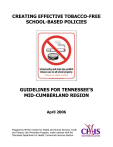 CREATING EFFECTIVE TOBACCO-FREE SCHOOL-BASED POLICIES GUIDELINES FOR TENNESSEE’S MID-CUMBERLAND REGION April 2006 Prepared by MTSU’s Center for Health and Human Services, Youth Led Tobacco Use Prevention Program, under contract with the Tennessee Department of Health, Community Services Section. Creating Effective Tobacco-Free School-Based Policies: Guidelines for the Mid-Cumberland Region of Tennessee Prepared By Youth Led Tobacco Use Prevention Program for Rutherford County Teens Participating Coalition Organizations American Cancer Association American Lung Association American Heart Association Campaign for a Healthy and Responsible Tennessee (CHART) Center for Disease Control and Prevention Community Anti-Drug Coalition of Murfreesboro (CADCOM) Center for Health and Human Services at Middle Tennessee State University Girls Scouts of America Rutherford County Health Department Rutherford County Tobacco Use Prevention Coalition By using this handbook we hope to help counties in Tennessee’s MidCumberland Region to develop effective tobacco-free school-based policies. Acknowledgements The information in this document is based on the most recent research available about youth tobacco use prevention. We gratefully acknowledge the input and assistance of the Youth Led Smoking Prevention Program’s investigators and staff in conjunction with Middle Tennessee State University’s Center for Health and Human Services, in the development of this handbook to reflect the needs of the MidCumberland Region. The Rutherford County Tobacco Use Prevention Coalition also provided valuable assistance with this document. The Coalition, a group of community agencies, has been dedicated to helping strengthen school tobacco prevention in Rutherford County since 2001. We also wish to thank Dr. Jo Edwards, Jacquie Kick, and Judy Campbell, whose writing and research supported the initiative. Funding for this project was provided by the “Youth Led Tobacco Use Prevention Program for Rutherford County Teens Grant” awarded by the Tennessee Department of Health Community Services Section, Tobacco Use Prevention and Control Program. Table of Contents Purpose of this Handbook .......................................................................................... 1 Information on Tobacco Use Prevention ................................................................. 2 Tobacco-Free School-Based Policies ......................................................................... 4 Keys to Developing a Successful School-based Policy for All Age Groups ... 6 10 Steps toward an Effective School Tobacco Policy ............................................... 9 A Model for a 100% Tobacco-Free School Policy ................................................ 15 Engaging Students through Advocacy ..................................................................... 17 Steps to Enacting a New Policy ........................................................................... 18 Steps to Working with Other Advocacy Groups ............................................... 19 Engaging Students Through Campus-Wide Events ................................................ 21 Assessment of Tobacco-Free School-Based Policies ............................................. 25 Sample School Policy Assessment Tool .............................................................. 26 Resources for Students ............................................................................................... 27 Resources for Community Leaders .......................................................................... 30 References .................................................................................................................... 38 Purpose of this Handbook The purpose of this booklet is to help schools and school districts create effective tobacco-free school policies. Schools can help to make sure that children and youth don’t use tobacco, help children and youth to stop using tobacco, and help the community develop a culture that values a non-tobacco environment. Many people in the school community have an interest in a tobacco free school-based policy, including students, teachers, administrators, staff, school counselors, parents, businesses and private landowners near the school, along with public health professionals. The input and support of all of these people is needed to develop a successful tobacco-free school-based policy. This handbook will guide you through the process of developing a realistic tobacco-free school-based policy that meets the needs of all of the people associated with the school in your community. This handbook is intended to be a reference to help you draft your own policy. Use the steps provided in this booklet as a guide as you work through your policy development process. Goal: Tobacco-Free Schools are schools that have a policy that prohibits the use of tobacco products by anyone, including students, staff, and visitors, on school grounds or at school events at all times. This tobaccofree zone includes school premises, school vehicles, and school events, both indoors and outdoors, and both on and off school property. 1 Information on Tobacco Use Prevention Why should you be concerned with tobacco use at school? Tobacco use is the number one preventable cause of death and disease in the United States (CDC, 2002). Tennessee ranks 4th in the United States for Lung & Bronchus Cancer mortality (NVSS, 2001), and 4th in smoking prevalence (BRFSS, 2003). Twenty-seven percent of Tennessee high school students smoke, compared to 22% of the US students (TNYRBS, 2003). Also, twentyone percent of male high school students in Tennessee use smokeless tobacco (Campaign for Tobacco-Free Kids, 2004). The economic cost of tobacco use in Tennessee is staggering. Approximately, $1.69 billion are spent on smoking-related health costs in Tennessee (CDC, 2005). Of the total cost, $626 million is covered by TennCare (CDC