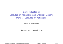 Lecture Notes 8: Calculus of Variations and Optimal Control Part 1: Calculus of Variations Peter J. Hammond Autumn 2013, revised 2014 University of Warwick, EC9A0 Maths for Economists Peter J. Hammond 1 of 18 Outline Introduction Vickrey–Mirrlees Model Typical Problem Economic Application University of Warwick, EC9A0 Maths for Economists Peter J. Hammond 2 of 18 Vickrey–Mirrlees Model Problem: how much to pay workers of different skills. Goal: achieve fairness while preserving incentives. References: William S. Vickrey (1945) “Measuring Marginal Utility by Reactions to Risk” Econometrica 13: 319–333. James A. Mirrlees (1971) “An Exploration in the Theory of Optimal Income Taxation” Review of Economic Studies 38: 175–208. Let n ∈ R+ denote a person’s skill level, defined to mean that there is a constant rate of marginal substitution of n1 /n2 between hours of work supplied by workers of the two skill levels n1 and n2 . Thus, a worker’s productivity is proportional to n, personal skill. Assume that the distribution of workers’ skills can be described by a continuous density function R+ 3 n 7→ f (n) ∈R R+ ∞ which, like a probability density function, satisfies 0 f (n)dn = 1. University of Warwick, EC9A0 Maths for Economists Peter J. Hammond 3 of 18 Objective and Constraints “Macro” model with a “representative consumer/worker” whose preferences for consumption/labour supply pairs (c, `) ∈ R2+ are represented by the utility function u(c) − v (`), where u 0 > 0, v 0 > 0, u 00 < 0 v 00 > 0. The social objective R ∞is to maximize the utility integral 0 [u(c(n)) − v (`(n))]f (n)dn w.r.t. the functions R+ 3 n 7→ (c(n), `(n)) ∈ R2+ . The resource balance constraint takes the form C ≤ F (L) where R∞ I C := 0 c(n)f (n)dn is mean consumption; R∞ I L := 0 n`(n)f (n)dn is mean effective labour supply. The aggregate production function R+ 3 L 7→ F (L) ∈ R+ is assumed to satisfy F 0 (L) > 0 and F 00 (L) ≤ 0 for all L ≥ 0. University of Warwick, EC9A0 Maths for Economists Peter J. Hammond 4 of 18 Pseudo First-Order Conditions Consider the Lagrangian Z ∞ L(c(·), `(·)) := [u(c(n)) − v (`(n))]f (n)dn 0 Z ∞ Z ∞ −λ c(n)f (n)dn − F n`(n)f (n)dn 0 0 as a functional (rather than a mere function) of the functions R+ 3 n 7→ (c(n), `(n)) ∈ R2+ . We derive “pseudo” first-order conditions by pretending ∂L ∂L that the derivatives and both exist, for all n ≥ 0. ∂c(n) ∂`(n) This gives the pseudo first-order conditions 0 = 0 = ∂L ∂c(n) ∂L ∂`(n) = [u 0 (c(n)) − λ]f (n) = −v 0 (`(n))f (n) + λF 0 (L)nf (n) University of Warwick, EC9A0 Maths for Economists Peter J. Hammond 5 of 18 Marxist First Best For any skill level n such that f (n) > 0, these two equations 0 = [u 0 (c(n)) − λ]f (n) and − v 0 (`(n))f (n) + λF 0 (L)nf (n) imply that: I I u 0 (c(n)) = λ and so c(n) = c ∗ , where the constant c ∗ uniquely solves u 0 (c ∗ ) = λ (“to each according to their need”); d` v 0 (`(n)) = λF 0 (L)n, implying that v 00 (`(n)) · = λF 0 > 0, dn d` so > 0 (“from each according to their ability”) dn Exercise Use concavity arguments to prove that this is the (essentially unique) solution. What makes this solution practically infeasible? University of Warwick, EC9A0 Maths for Economists Peter J. Hammond 6 of 18 Outline Introduction Vickrey–Mirrlees Model Typical Problem Economic Application University of Warwick, EC9A0 Maths for Economists Peter J. Hammond 7 of 18 Problem Formulation The calculus of variations is used to optimize a functional that maps functions into real numbers. A typical problem is to choose a function [t0 , t1 ] 3 t 7→ x(t) ∈ R, often denoted simply by x, in order to maximize the integral objective functional Z t1 J(x) = F (t, x(t), ẋ(t))dt t0 subject to the fixed end point conditions x(t0 ) = x0 , x(t1 ) = x1 . A variation involves moving away from the first path x to the variant path x + u, where u denotes the differentiable function [t0 , t1 ] 3 t 7→ u(t) ∈ R, and ∈ R is a scalar. To ensure that the end point conditions x(t0 ) + u(t0 ) = x0 and x(t1 ) + u(t1 ) = x1 remain satisfied by x + u, one imposes the conditions u(t0 ) = u(t1 ) = 0. University of Warwick, EC9A0 Maths for Economists Peter J. Hammond 8 of 18 Toward a Necessary First-Order Condition A maximum is a path x∗ satisfying the end point conditions such that J(x∗ ) ≥ J(x) for any alternative path x that also the satisfies the end point conditions. A necessary condition for x∗ to maximize J(x) w.r.t. x is that J(x∗ ) ≥ J(x∗ + u) for all small . Alternatively, the function R 3 7→ fx∗ ,u () := J(x∗ + u) must satisfy, for all small , the inequality fx∗ ,u (0) = J(x∗ ) ≥ J(x∗ + u) = fx∗ ,u () In case the function 7→ fx∗ ,u () is differentiable at = 0, a necessary first-order condition is therefore fx0∗ ,u (0) = 0. University of Warwick, EC9A0 Maths for Economists Peter J. Hammond 9 of 18 Evaluating the Derivative Our definitions of the functions J and fx∗ ,u imply that ∗ Z t1 fx∗ ,u () = J(x + u) = F (t, x ∗ (t) + u(t), ẋ ∗ (t) + u̇(t))dt t0 Differentiating the integrand w.r.t. implies that Z t1 [Fx0 (t)u(t) + Fẋ0 (t)u̇(t)]dt fx0∗ ,u (0) = t0 where for each t ∈ [t0 , t1 ], the partial derivatives Fx0 (t) and Fẋ0 (t) of F (t, x, ẋ) are evaluated at the triple (t, x ∗ (t), ẋ ∗ (t)). University of Warwick, EC9A0 Maths for Economists Peter J. Hammond 10 of 18 Integrating by Parts The product rule for differentiation implies that d 0 d 0 [F (t)u(t)] = F (t) u(t) + Fẋ0 (t)u̇(t) dt ẋ dt ẋ and so, integrating by parts, one has Z t1 Z t1 0 0 Fẋ (t)u̇(t)dt = |t0 Fẋ (t)u(t) − t0 t1 t0 d 0 F (t) u(t)dt dt ẋ But the end point conditions imply that u(t0 ) = u(t1 ) = 0, so the first term on the right-hand side vanishes. University of Warwick, EC9A0 Maths for Economists Peter J. Hammond 11 of 18 The Euler Equation Rt d 0 Rt Substituting − t01 dt F