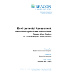 G UIDING S OLUTIONS IN THE N ATURAL E NVIRONMENT Environmental Assessment Natural Heritage Features and Functions Steeles West Station TTC Toronto-York Spadina Subway Extension Prepared For: Watters Environmental Group Inc. Prepared By: Beacon Environmental Date: Project: September 2009 209024 8 Main St. North, Markham, Ontario, Canada L3P 1X2 Tel: (905) 201 7622 Fax: (905) 201 0639 Natural Heritage Assessment Steeles West Station Toronto –York Spadina Subway Table of Contents page 1. 2. Introduction ................................................................................................ 1 Methodology ............................................................................................... 1 2.1 2.2 3. Existing Natural Heritage Conditions ....................................................... 3 3.1 3.2 3.3 3.4 3.5 4. 5. Aquatic Resources .......................................................................................................... 3 Amphibians ..................................................................................................................... 3 Birds ................................................................................................................................ 5 Vegetation ....................................................................................................................... 7 3.4.1 Flora ................................................................................................................................. 9 3.4.2 Vascular Plant Rarity ........................................................................................................ 9 Other Wildlife Attributes ................................................................................................ 11 3.5.1 Mammals ........................................................................................................................ 11 3.5.2 Wildlife Habitat ............................................................................................................... 12 3.5.3 Landscape Connectivity ................................................................................................. 12 Summary of Key Functions and Attributes............................................ 12 Preliminary Design Mitigation and Enhancements ............................... 13 5.1 5.2 6. 7. Background Review ........................................................................................................ 1 Field Investigations .........................................................................................................2 Design Mitigation Measures .......................................................................................... 14 General Construction Mitigation Measures ................................................................... 14 Summary ................................................................................................... 15 Cited References ...................................................................................... 16 Natural Heritage Assessment Steeles West Station Toronto –York Spadina Subway Figures Figure 1. Natural Heritage Features ...................................................................................................... 4 Tables Table 1: Table 2. Table 3. Table 4. Bird Species and Status for the Steeles West Station Study Area .......................................... 5 Locally Rare Species for Subject Lands .................................................................................. 9 Mammals Species Documented for Study Area and Adjacent Lands ................................... 11 Summary of Key Functions and Attributes ............................................................................ 13 Appendices 1. 2. Species Status Definition List of Plant Species Natural Heritage Assessment Steeles 1. West Station Toronto –York Spadina Subway Introduction Beacon Environmental was retained by Watters Environmental Group Inc. (Watters Environmental) to undertake an assessment of the natural heritage features and functions as part of the Preliminary Design Report for the Steeles West Station, which is one of the subway stations comprising the Toronto-York Spadina Subway Extension (TYSSE) project. This report provides a detailed assessment of existing natural conditions for the lands associated with the preliminary design for the elements of the Steeles West station. The purpose of this assessment is summarized as follows: 1. Inventory and assessment of flora and fauna associated with the planned development lands; 2. Identification of significant or sensitive natural heritage features or functions on or near the planned development lands; 3. Identification of environmental features that could represent potential constraints for the planned development; 4. Preliminary identification of design and construction mitigation measures (if required); and 5. Identification of potential compensation requirements for natural heritage features (if any). Terms of Reference for this assessment were submitted to Watters Environmental on April 27, 2009, and generally followed the scope of work pre-established between the TYSSE and Canadian Wildlife Service (undated document). 2. Methodology 2.1 Background Review Background information pertaining to the natural and physical setting of the subject lands and environs was gathered and reviewed at the outset of the project. These information sources included: Spadina Subway Extension – Downsview Station to Steels Avenue Environmental Assessment. 2006 Toronto-York Spadina Subway Extention, Downsview Station to Highway 7. CEAA Canadian Environmental Assessment Act Screening Report. 2008; Ministry of Natural Resources’ Natural Heritage Information Centre (NHIC) rare species database; and Provisional Ontario Breeding Bird Atlas (http://www.birdsontario.org/atlas/atlasmain.html). (OBBA) data for 2000-2005 Other sources of informa