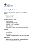 Interviewing Tips for Managers One of the keys to successful recruitment and retention is the interviewing process. Developing a plan from initiating the search through to selection will enhance your chance for success. The purpose of an interview is to: • • • Assess essential job skills Assess other related skills Can be used as a public relations tool During the interview process you should: • • • • • • • • • • • Use job related questions only Use a structured approach Utilize prepared questions for consistency Utilize standard scoring/rating for each interviewee Consider using an interview panel approach Avoid questions that could infer discrimination Ask open-ended questions Utilize the situational/hypothetical approach Eliminate “small talk” Disregard the use of pre-interview data about applicant that is unrelated to job Call back top two or three candidates for second interview Interviewing: • • • • • • • Establish rapport Be on time Put candidate at ease Discuss process Time frame Skills assessment A question such as “What do you know about the Health Center?” is a good lead into the interview Position Discussion: • • • Identify aspects of the position and how it ties into organization Identify the mission of the department and how it relates to the Health Center Describe the position and don’t minimize the realities Obtain information from candidate: • • • • • • Use an evaluation tool such as a weighted scale and take notes Ask “How do you feel your experience makes you the choice applicant for this position?” Encourage the applicant to do most of the talking (80/20 rule) Ask the same questions of all applicants for consistency Avoid asking questions pertaining to: age, race or ethnicity, candidate’s ancestry, birth place, native language, religion, religious customs or holidays, sex or gender, pregnancy or medical history, family or marital status, childcare arrangements, physical or mental disabilities Be careful what you ask – remember that asking the wrong questions could be a potential liability for the Health Center Concluding the Interview: • • • Give applicant a chance to add anything or ask any addition questions Outline the next steps (second interview, for example) Always end on a positive note to promote public relations Evaluation and Documentation: • • • • Review/score responses Value all opinions – facilitates successful selection and reduces liability Document/rate/recommend Consult Human Resources Officer or Recruitment Specialist with any questions or concerns When Interviewing Persons with Disabilities: DO • Ensure that the interview facility is accessible to people with disabilities • Inform the applicant of any special parking available • Allow the applicant at least a full day to prepare for your interview • Identify the essential functions of the job • Make eye contact with the person. Talk directly to the person with the disability – not to an interpreter • After the initial greeting, sit down so that a person who uses a wheelchair can easily make eye contact DON’T: • Assume the person is able to shake your hand in greeting • Lean on an applicant’s wheelchair • Shout or raise your voice to a person who is hearing impaired • Touch or talk to a seeing-eyed dog • Ask about a person’s disability history • Ask about prior workers’ compensation claims • Ask how the person became disabled • Ask how a person is going to get to work Interviewing Tips for Managers Page|2 Final Interview Reminders: • It is essential to know your state and local discrimination laws because some individuals may be in a “protected class” even if they are not in a federally protected class (sexual orientation is a good example) • The interviewer should stay focused on the job and its requirements, not any preconceived assumptions about what the applicant can or cannot do • Sell the job and the Health Center while keeping your pitch realistic. Unrealistic job expectations will generally lead to employee dissatisfaction and higher turnover • Make sure you elicit questions or provide information which will help clear up any unanswered questions or doubts that are lingering in the applicant’s mind • End the interview on a friendly note and, if possible, apprise the candidate of the next step and the time frame for a decision • Complete the candidate evaluation form while the interview is still fresh in your mind • Make a fair and unbiased recommendation or decision based on the job-related qualifications of the applicants Please remember to keep your Human Resource Officer an active part of the process. She/he is available to assist you in the development of an evaluation scale and may also participate in the interview process. Feel free to ask questions and solicit advice. The end result of hiring a qualified candidate will validate your efforts! Sample Interview Questions Can you tell me about your qualifications for this position? Interviewer is looking for a confident applicant that can give a brief summary of his/her strengths, significant achievements, and career goals. Candidate should be able to describe his/her qualifications for the position and give specific examples. What do you know about the Health Center, and why do you want to work here? Interviewer is looking to see how much homework he/she has done in researching the company (product knowledge, size of organization, corporate mission). You are looking for the candidate to show you that they have acquired knowledge about the Health Center or they say something specific that demonstrates that they have a sincere interest in working here. Interviewing Tips for Managers Page|3 What interests you about this job, and what skills and strengths can you bring to it? Interviewer is looking to see if he/she is a strong candidate who has the necessary skills and are able to correlate yo