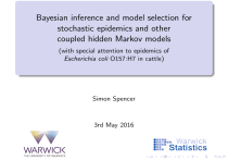 Bayesian inference and model selection for stochastic epidemics and other coupled hidden Markov models (with special attention to epidemics of Escherichia coli O157:H7 in cattle) Simon Spencer 3rd May 2016 Acknowledgements Bärbel Finkenstädt Rand Peter Neal TJ McKinley Nigel French, Tom Besser and Rowland Cobbold Panayiota Touloupou Outline 1. Introduction 2. Bayesian inference for epidemics 3. Model selection for epidemics 4. Scalable inference for epidemics 5. Conclusion Introduction Introduction A typical epidemic model: Susceptible → Exposed → Infected → Removed Infections occur according to an inhomogeneous Poisson process with rate ∝ S(t)I (t). 100 A simulation 0 20 40 60 80 Susceptible Exposed Infected Removed 0 20 40 60 time 80 100 Comments Statistical inference for epidemic models is hard. Intractable likelihood – need to know infection times. Usual solution: large scale data augmentation MCMC. What are the observed data? Epidemic data Historically: final size (single number). Final size in many sub-populations, e.g. households. Markov models: removal times. Who is removed is not needed / recorded. Epidemic data Historically: final size (single number). Final size in many sub-populations, e.g. households. Markov models: removal times. Who is removed is not needed / recorded. Individual level diagnostic test results. To be realistic, tests are imperfect. Temporal resolution of 1 day. Epidemic data Historically: final size (single number). Final size in many sub-populations, e.g. households. Markov models: removal times. Who is removed is not needed / recorded. Individual level diagnostic test results. To be realistic, tests are imperfect. Temporal resolution of 1 day. ⇒ View epidemic as hidden Markov model Motivating example: Escherichia coli O157 E. coli O157 is a highly pathogenic form of Escherichia coli. It can cause severe gastroentestinal illness, haemorrhagic diarrhoea and even death. Outbreaks and endemic cases are associated with food, water or direct contact with infected animals. Cattle are the main reservoir. Additional economic burden due to impacts on trade. Study design Natural colonization and faecal excretion of E. coli O157 in commercial feedlot. 20 pens containing 8 calves were sampled 27 times over a 99 day period. Each sampling event included a faecal pat sample and a recto-anal mucosal swab (RAMS). Tests were assumed to have perfect specificity but imperfect sensitivity. Patterns of infection 8 ● ● 7 ● ● ● 6 ● ● ● ● ● ● ● ● 5 ● ● ● ● ● ● ● ● ● ● 4 ● ● ● ● ● ● ● ● ● ● ● 3 ● ● ● ● ● ● ● 2 ● ● ● ● ● ● ● ● ● ● ● 1 Animal Positive Tests, Pen 5 (South) ● ● ● ● ● ● ● ● ● 0 ● ● ● RAMS Faecal ● ● ● Negative ● ● ● ● 20● ● ● ● ● ● ● ● ● ●● ● ● ● ● ● ●● ● ● ● ● ● ● ● ● ● ●● ● ● ● ● ● ● 40 ● ● ● ● ● ● ● ● ● ● ● ●● ● ● ● ● ● ● ● ● ● ● ●● ● ● ● ● ● ● ● ● ● ● ● ● ●● ● ● ● ●● ● ● ● ● ● ● ● ● ●● ● ● ●● ● ● ● ● ● ● ● ● ● ● ● ●● ● ● ●● ● ● ● ● ● ● ● ● ● Time (days) 60 80 ●● ● ● ● 100 Patterns of infection 8 ● ● 7 ● ● ● 6 ● ● ● ● ● ● ● ● ● ● ● ● ● ●● ● ● ● ● ● ● ● ● ● ● ● ● ● ● ● ● ● ● ● ● ● ● ● ● ● ● ● ● ● ● ● ● ● ● ● ● ● ● ● ● ● ● ● 4 ● ● 3 ● ● ● 2 5 ● ● ● ● ● 1 Animal Positive Tests, Pen 7 (North) ● ● ● 0● ● ● ● ● ● ● ● ● ● ● ● ● ● ● ● ● ● ● ● ● ● ● ● ● ● 20● ● ● ● ●● 40 ● ● ●● ● ● ● Time (days) 60 ● ●● ● ● ● ●● ● ● ● ● ● ● ● ● ● ● ● ● ● ● ●● ● ● ● ●● ● ● ● ● ● ● ●● ● ● ● ● ● ● ● ● 80 ●● ● ● ● ●● ● ● RAMS Faecal ●● ● ● ● ● Negative ● ● 100 Bayesian inference for epidemics Bayesian inference for epidemics Intractable likelihood: π(y |θ). Need to impute infection status of individuals x for augmented likelihood π(y |x , θ). Missing data x typically very high dimensional. Updating the infection status Standard method by O’Neill and Roberts (1999) involves 3 steps: 1 2 3 Add a period of infection Remove a period of infection Move an end-point of a period of infection This method was designed for SIR models (where individuals can’t be infected twice). Easily adapted to discrete time models. Add a period of infection Current: 0 0 0 0 0 0 0 0 0 0 0 0 0 0 0 0 0 0 0 0 ? Propose: 0 0 0 0 0 1 1 1 1 1 0 0 0 0 0 0 0 0 0 0 1 Choose a block of zeros at random. 2 Propose changing zeros to ones. 3 Accept or reject based on ratio of posteriors. Remove a period of infection Current: 0 0 0 0 0 1 1 1 1 1 0 0 0 0 0 0 0 0 0 0 ? Propose: 0 0 0 0 0 0 0 0 0 0 0 0 0 0 0 0 0 0 0 0 1 Choose a complete block of ones. 2 Propose changing ones to zeros. 3 Accept or reject based on ratio of posteriors. Move an endpoint Current: 0 0 0 0 0 1 1 1 1 1 1 1 1 1 1 0 0 0 0 0 ? Propose: 0 0 0 0 0 0 0 0 0 0 1 1 1 1 1 0 0 0 0 0 1 Choose an endpoint of a block of ones. 2 Propose a new location for that endpoint. 3 Accept or reject based on ratio of posteriors. Some pros and cons ! Considerably fast ! Can handle non-Markov models % Most of the hidden states are not updated % High degree of autocorrelation Slow mixing of the chain and long run length % Tuning of the maximum block length required. Alternative approach: FFBS Discrete time epidemic is a hidden Markov model. Gibbs step: sample from the full condition distribution of the hidden states. Use Forward Filtering Backward Sampling algorithm (Carter and Kohn, 1994). Some pros and cons ! Very good mixing of the MCMC c