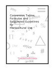 Conversion Tables, Formulas and Suggested Guidelines for Horticultural Use Table of Contents Table No. 1. 2. 3. 4. 5. Page Equivalents for liquid measure (volume) . . . . . . . . . . . . . . . . . . . . . . . . . . . . . . . . . . . . . . . . . . . . . . . 3 Equivalents for dry measure and weight . . . . . . . . . . . . . . . . . . . . . . . . . . . . . . . . . . . . . . . . . . . . . . . 4 Metric system conversion table . . . . . . . . . . . . . . . . . . . . . . . . . . . . . . . . . . . . . . . . . . . . . . . . . . . . . . 5 Dilution of liquid pesticides at various concentrations . . . . . . . . . . . . . . . . . . . . . . . . . . . . . . . . . . . . 5 Equivalent quantities of dry materials (wettable powders) for various volumes of water based on recommended pounds per 100 gallons . . . . . . . . . . . . . . . . . . . . . . . . . . . . . . . . . . . . . . . . . 6 6. Equivalent quantities of liquid materials (emulsion concentrates, etc.) for various volumes of water based on pints per 100 gallons . . . . . . . . . . . . . . . . . . . . . . . . . . . . . . . . . . . . . . . . . . . . . . . . 6 7. Rate of application equivalent table .. . . . . . . . . . . . . . . . . . . . . . . . . . . . . . . . . . . . . . . . . . . . . . . . . . 7 8. Fertilizer conversions for specified square feet and row areas . . . . . . . . . . . . . . . . . . . . . . . . . . . . . . 8 9. Fertilizer weight as measured by standard pot size . . . . . . . . . . . . . . . . . . . . . . . . . . . . . . . . . . . . . . . 9 10. Element concentrations for pounds soluble fertilizer in 1000 gallons (U.S.) water . . . . . . . . . . . . . 10 11. Injection ratios and nitrogen concentrations for constant fertilization . . . . . . . . . . . . . . . . . . . . . . . 11 12. Injector calibration with a conductivity meter . . . . . . . . . . . . . . . . . . . . . . . . . . . . . . . . . . . . . . . . . . 12 A. Peters Single Element Fertilizer Components. . . . . . . . . . . . . . . . . . . . . . . . . . . . . . . . . . . . . . . 12 B. Peters Mixed Soluble Fertilizer Analysis. . . . . . . . . . . . . . . . . . . . . . . . . . . . . . . . . . . . . . . . . . . 13 13. Parts per million of desired nutrient to ounces of fertilizer carrier in 100 gallons of water15 (or grams in 1 liter) and vice versa .. . . . . . . . . . . . . . . . . . . . . . . . . . . . . . . . . . . . . . . . . . . . . . . . . . 14 14. Conversion factors among electrical conductivity (EC) units . . . . . . . . . . . . . . . . . . . . . . . . . . . . . . 15 15. Various acids to add to irrigation water for acidification . . . . . . . . . . . . . . . . . . . . . . . . . . . . . . . . . 16 16. Amounts of nutrient sources to combine in making various fertilizer formulas . . . . . . . . . . . . . . . . 17 17. Formulas for additional fertilizer calculations . . . . . . . . . . . . . . . . . . . . . . . . . . . . . . . . . . . . . . . . . . 18 18. Miscellaneous conversions used in fertilizer calculations . . . . . . . . . . . . . . . . . . . . . . . . . . . . . . . . . 19 19. Osmocote® controlled-release fertilizers and their release periods . . . . . . . . . . . . . . . . . . . . . . . . . 20 20. Rates in lb/yd3 (kg/m3 ) for incorporation of three of the most popular formulations of Nutricote into greenhouse root substrates . . . . . . . . . . . . . . . . . . . . . . . . . . . . . . . . . . . . . . . . . . . 21 21. Materials, rates necessary to lower the pH level of greenhouse potting substrate 0.5 to 1.0 units . . 21 22. Approximate amount of materials required to change pH of potting mixes . . . . . . . . . . . . . . . . . . . 22 23. Dilution/conversion chart for various chemical growth regulators . . . . . . . . . . . . . . . . . . . . . . . . . . 22 24. Pre-plant fertilizer sources and rates of application .. . . . . . . . . . . . . . . . . . . . . . . . . . . . . . . . . . . . . 26 25. Cornell Peat-lite Mix A for seedlings, bedding plants and potted plants .. . . . . . . . . . . . . . . . . . . . . 27 26. Number of pots per bushel and per cubic yard of soil mix . . . . . . . . . . . . . . . . . . . . . . . . . . . . . . . . 28 27. Number of nursery containers that can be filled from 1 yd3 of soil mix . . . . . . . . . . . . . . . . . . . . . . 29 28. Coverage estimates for perlite, peat, topsoil and straw . . . . . . . . . . . . . . . . . . . . . . . . . . . . . . . . . . . 29 29. Plant spacing guide (greenhouse) .. . . . . . . . . . . . . . . . . . . . . . . . . . . . . . . . . . . . . . . . . . . . . . . . . . . 30 30. Plant spacing guide (field/orchard) . . . . . . . . . . . . . . . . . . . . . . . . . . . . . . . . . . . . . . . . . . . . . . . . . . 30 Landscape 31. Estimated number of plants to fill 100 ft2 bed area for square (row) and triangular (equilateral) planting patterns using 4 to 14 inch spacing distances . . . . . . . . . . . . . . . . . . . . . . . . . . . . . . . . . . . 31 32. Number of bedding/groundcover plants required at various spacing for landscape planting . . . . . . . . . 33. Number of plants per acre at various spacings .. . . . . . . . . . . . . . . . . . . . . . . . . . . . . . . . . . . . . . . . . 32 34. Times required to mow or trim lawn areas .. . . . . . . . . . . . . . . . . . . . . . . . . . . . . . . . . . . . . . . . . . . . 33 35. Volume of water delivered - by size of hose . . . . . . . . . . . . . . . . . . . . . . . . . . . . . . . . . . . . . . . . . . . 34 36. Cubic yards of soil needed at various depths and areas . . . . . . . . . . . . . . . . . . . . . . . . . . . . . . . . . . . 34 37. Areas covered in square feet at various depths . . . . . . . . . . . . . . . . . . . . . . . . . . . . . . . . . . . . . . . . . 35 38. Temperature conversion . . . . . . . . . . . . . . . . . . . . . . . . . . . . . . . . . . . . . . . . . . . . . . . . . . . . . . . . . . . 35 Figure No. Page 1A-C. Formulas for calculating greenhouse volume . . . . . . . . . . . . . . . . . . . . . . . . . . . . . . . . . . . . . . . . 36 2A-C. Formu