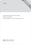 w w ap eP m e tr .X w Syllabus om .c s er Cambridge IGCSE Computer Studies Syllabus code 0420 For examination in June and November 2011 Note for Exams Officers: Before making Final Entries, please check availability of the codes for the components and options in the E3 booklet (titled “Procedures for the Submission of Entries”) relevant to the exam session. Please note that component and option codes are subject to change. Contents Cambridge IGCSE Computer Studies Syllabus code 0420 1. Introduction ..................................................................................... 2 1.1 1.2 1.3 1.4 Why choose Cambridge? Why choose Cambridge IGCSE Computer Studies? Cambridge International Certificate of Education (ICE) How can I find out more? 2. Assessment at a glance .................................................................. 4 3. Aims and assessment ..................................................................... 5 3.1 3.2 3.3 3.4 Aims Scheme of assessment Assessment objectives and their weighting in the exam papers Exam combinations 4. Curriculum content ........................................................................ 10 4.1 Paper 1: Theoretical paper 4.2 Paper 2: Coursework 4.3 Paper 3: Alternative to coursework 5. Appendix ....................................................................................... 29 5.1 Notes for the guidance of teachers 5.2. Forms 5.3 Assessment criteria for coursework (school-based assessment) Cambridge IGCSE Computer Studies 0420. Examination in June and November 2011. © UCLES 2008 1. Introduction 1.1 Why choose Cambridge? University of Cambridge International Examinations (CIE) is the world’s largest provider of international qualifications. Around 1.5 million students from 150 countries enter Cambridge examinations every year. What makes educators around the world choose Cambridge? Recognition Cambridge IGCSE is internationally recognised by schools, universities and employers as equivalent to UK GCSE. Cambridge IGCSE is excellent preparation for A/AS Level, the Advanced International Certificate of Education (AICE), US Advanced Placement Programme and the International Baccalaureate (IB) Diploma. Learn more at www.cie.org.uk/recognition. Support CIE provides a world-class support service for teachers and exams officers. We offer a wide range of teacher materials to Centres, plus teacher training (online and face-to-face) and student support materials. Exams officers can trust in reliable, efficient administration of exams entry and excellent, personal support from CIE Customer Services. Learn more at www.cie.org.uk/teachers. Excellence in education Cambridge qualifications develop successful students. They not only build understanding and knowledge required for progression, but also learning and thinking skills that help students become independent learners and equip them for life. Not-for-profit, part of the University of Cambridge CIE is part of Cambridge Assessment, a not-for-profit organisation and part of the University of Cambridge. The needs of teachers and learners are at the core of what we do. CIE invests constantly in improving its qualifications and services. We draw upon education research in developing our qualifications. Cambridge IGCSE Computer Studies 0420. Examination in June and November 2011. 2 1. Introduction 1.2 Why choose Cambridge IGCSE Computer Studies? The Cambridge IGCSE Computer Studies syllabus enables candidates to develop an interest in computing and gain confidence in the use of computers. Candidates develop an appreciation of the broad range of computer applications, in order to improve their understanding of the power and versatility of the computer and the benefits of its use, but also its limitations and potential disadvantages. Cambridge IGCSE Computer Studies is an ideal foundation for further study at A Level, and the skills learnt can also be used in other areas of study and in everyday life. 1.3 Cambridge International Certificate of Education (ICE) Cambridge ICE is the group award of the International General Certificate of Secondary Education (IGCSE). It requires the study of subjects drawn from the five different IGCSE subject groups. It gives schools the opportunity to benefit from offering a broad and balanced curriculum by recognising the achievements of students who pass examinations in at least seven subjects, including two languages, and one subject from each of the other subject groups. The Cambridge portfolio of IGCSE qualifications provides a solid foundation for higher level courses such as GCE A and AS Levels and the International Baccalaureate Diploma as well as excellent preparation for employment. A wide range of IGCSE subjects is available and these are grouped into five curriculum areas. Computer Studies (0420) falls into Group V, Creative, Technical and Vocational Subjects. Learn more about ICE at www.cie.org.uk/qualifications/academic/middlesec/ice. 1.4 How can I find out more? If you are already a Cambridge Centre You can make entries for this qualification through your usual channels, e.g. CIE Direct. If you have any queries, please contact us at international@cie.org.uk. If you are not a Cambridge Centre You can find out how your organisation can become a Cambridge Centre. Email us at international@cie.org.uk. Learn more about the benefits of becoming a Cambridge Centre at www.cie.org.uk. Cambridge IGCSE Computer Studies 0420. Examination in June and November 2011. 3 2. Assessment at a glance Cambridge IGCSE Computer Studies Syllabus code 0420 Candidates take Paper 1, and either Paper 2 or Paper 3. Candidates must be entered for one of the following options: Option 1: Option 2: Paper 1 and Paper 2 Paper 1 and Paper 3 Candidates take: Paper 1: Theoretical paper 2 hours 30 minutes This written paper contains short-answer and structured questions. There is no choice of questions. 75% of total marks And either: Or: Paper 2: Coursework (school-based assessment