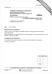 w w Candidate Number ap eP m e tr .X w Centre Number om .c s er Candidate Name CAMBRIDGE INTERNATIONAL EXAMINATIONS General Certificate of Education Advanced Subsidiary Level and Advanced Level ACCOUNTING 9706/2 PAPER 2 Structured Questions (Core) OCTOBER/NOVEMBER SESSION 2002 1 hour 30 minutes Candidates answer on the question paper. No additional materials are required. TIME 1 hour 30 minutes INSTRUCTIONS TO CANDIDATES Write your name, Centre number and candidate number in the spaces at the top of this page. Answer all questions. Write your answers in the spaces provided on the question paper. If you require extra space for your answers or workings, use page 9. INFORMATION FOR CANDIDATES The number of marks is given in brackets [ ] at the end of each question or part question. You may use a calculator. FOR EXAMINER’S USE 1 2 3 TOTAL This question paper consists of 11 printed pages and 1 lined page. SPA (SC/KS) S18227/4 © CIE 2002 [Turn over 2 1 Dellow and Coucom are in partnership in a business which has three retail departments, Television, Computing and Telephones. The following balances were extracted from the business accounts at 30 April 2002: Purchases and Sales Wages Stocks at 1 May 2001 Television Computing Telephones Television Computing Telephones Sales staff salaries General expenses Office salaries Advertising Rent Electricity Insurance Motor Vehicles at cost Furniture & Fittings at cost Dr $ 120 000 220 000 40 000 56 000 8 000 19 000 3 000 147 000 5 000 35 000 14 000 40 000 9 000 5 000 45 000 30 000 Cr $ 214 000 428 000 107 000 NOTES The following must now be taken into consideration. Stocks at 30 April 2002: Television $17 000 Computing $40 000 Telephones $5 000 Stock-taking is computerised and is based solely on sales and purchases – no physical stock check has been taken. Accruals at 30 April 2002: General expenses $2 000 Electricity $1 000 Rent $2 000 Number of sales staff employed Television Computing Telephones Commission is paid to sales staff at 1% of Sales. 3 4 1 Depreciation is charged to Motor Vehicles and Furniture & Fittings at 20% per annum on cost. Floor space (square metres) Television Computing Telephones 9706/2/O/N/02 2 000 2 500 500 For Examiner’s Use 3 For Examiner’s Use Expenses are apportioned as follows: Expense Wages General expenses Office salaries Sales staff salaries Advertising Rent and rates Electricity Insurance Depreciation Basis of apportionment Sales Sales Sales Number of sales staff Sales Floor area Floor area Floor area Equally between departments Dellow and Coucom share profits in the ratio of their Capital accounts, which at 1 May 2001 were: Dellow: $60 000 Coucom: $40 000. Interest on capital is payable at 1% of opening capital. Cash drawings for the year were Dellow, $15 000 and Coucom, $4 000. Interest is chargeable on drawings at 2% of total drawings for the year. Coucom is paid a Partnership salary of $7 600. During the year Coucom took from stock for her own use a Television costing $1 000. No entries were made for this in the accounts. (a) Prepare, in columnar format, Departmental Trading and Profit and Loss Accounts for the year ended 30 April 2002. .......................................................................................................................................... .......................................................................................................................................... .......................................................................................................................................... .......................................................................................................................................... .......................................................................................................................................... .......................................................................................................................................... .......................................................................................................................................... .......................................................................................................................................... .......................................................................................................................................... .......................................................................................................................................... .......................................................................................................................................... .......................................................................................................................................... .......................................................................................................................................... .......................................................................................................................................... .......................................................................................................................................... .......................................................................................................................................... 9706/2/O/N/02 [Turn over 4 .......................................................................................................................................... .......................................................................................................................................... .......................................................................................................................................... .......................................................................................................................................... ..................