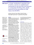 Downloaded from http://bmjopen.bmj.com/ on February 4, 2016 - Published by group.bmj.com Open Access Protocol A cluster randomised controlled trial of advice, exercise or multifactorial assessment to prevent falls and fractures in community-dwelling older adults: protocol for the prevention of falls injury trial (PreFIT) Julie Bruce,1 Ranjit Lall,1 Emma J Withers,1 Susanne Finnegan,1 Martin Underwood,1 Claire Hulme,2 Ray Sheridan,3 Dawn A Skelton,4 Finbarr Martin,5 Sarah E Lamb,1,6 on behalf of PreFIT Study Group To cite: Bruce J, Lall R, Withers EJ, et al. A cluster randomised controlled trial of advice, exercise or multifactorial assessment to prevent falls and fractures in community-dwelling older adults: protocol for the prevention of falls injury trial (PreFIT). BMJ Open 2016;6: e009362. doi:10.1136/ bmjopen-2015-009362 ▸ Prepublication history and additional material is available. To view please visit the journal (http://dx.doi.org/ 10.1136/bmjopen-2015009362). Received 10 July 2015 Revised 1 September 2015 Accepted 10 September 2015 For numbered affiliations see end of article. Correspondence to Professor Sarah E Lamb; sarah.lamb@ndorms.ox.ac.uk ABSTRACT Introduction: Falls are the leading cause of accidentrelated mortality in older adults. Injurious falls are associated with functional decline, disability, healthcare utilisation and significant National Health Service (NHS)-related costs. The evidence base for multifactorial or exercise interventions reducing fractures in the general population is weak. This protocol describes a large-scale UK trial investigating the clinical and cost-effectiveness of alternative falls prevention interventions targeted at community dwelling older adults. Methods and analysis: A three-arm, pragmatic, cluster randomised controlled trial, conducted within primary care in England, UK. Sixty-three general practices will be randomised to deliver one of three falls prevention interventions: (1) advice only; (2) advice with exercise; or (3) advice with multifactorial falls prevention (MFFP). We aim to recruit over 9000 community-dwelling adults aged 70 and above. Practices randomised to deliver advice will mail out advice booklets. Practices randomised to deliver ‘active’ interventions, either exercise or MFFP, send all trial participants the advice booklet and a screening survey to identify participants with a history of falling or balance problems. Onward referral to ‘active’ intervention will be based on falls risk determined from balance screen. The primary outcome is peripheral fracture; secondary outcomes include number with at least one fracture, falls, mortality, quality of life and health service resource use at 18 months, captured using self-report and routine healthcare activity data. Ethics and dissemination: The study protocol has approval from the National Research Ethics Service (REC reference 10/H0401/36; Protocol V.3.1, 21/May/ 2013). User groups and patient representatives were consulted to inform trial design. Results will be reported at conferences and in peer-reviewed publications. A patient-friendly summary of trial findings will be published on the prevention of falls injury trial (PreFIT) website. This protocol adheres to the recommended SPIRIT Checklist. Amendments will be reported to relevant regulatory parties. Trial registration number: ISRCTN 71002650; Preresults. INTRODUCTION Falls and fall-related fractures are a major public health burden for individuals and society. Falls are associated with loss of independence, functional decline and are a contributing reason for subsequent admission to a long-term care.1 The majority of falls result in minor injury and pain, but are sometimes coupled with a fear of falling and loss of confidence in mobility. Falls, however, can also lead to serious injury, with fracture and hospitalisation occurring in 5% of community dwelling older adults with a history of falling.2 The financial burden associated with injurious falls is staggering: direct healthcare and associated social care costs in the UK have been estimated at £2 billion per annum, mostly associated with hip fracture.3 Costs arise from hospital admission and clinical care associated with treatment of injurious falls and fractures. Mortality is high in people who sustain fracture. For hip fracture, 10% die within 30 days and one-third die within 12 months.4 Demographic change means that injurious falls in older people may become increasingly common. Over the past 30 years, much effort has been directed towards the implementation and evaluation of fall prevention strategies. Falls have a multifactorial aetiology, with Bruce J, et al. BMJ Open 2016;6:e009362. doi:10.1136/bmjopen-2015-009362 1 Downloaded from http://bmjopen.bmj.com/ on February 4, 2016 - Published by group.bmj.com Open Access many putative risk factors identified.5 The major risk factors are diverse, and potentially modifiable, including impairments of gait and balance, visual impairments, syncope and cardiac rhythm abnormalities, polypharmacy and certain classes of medication, comorbidity, foot disorders and environmental hazards. Early clinical trials of assessment and treatment of multiple risk factors, termed multifactorial falls strategies, were very promising, suggesting beneficial effect in falls reduction when compared to usual care. These early trials provided the foundation for the mandatory establishment of secondary prevention in the UK, through the introduction of falls services to undertake multifactorial falls prevention (MFFP) interventions on people with a history of falling.6 These trials did not, however, systematically examine the effect of interventions on injurious falls. To justify widespread introduction of services for the primary prevention of falls, evidence is needed that these interventions reduce injurious falls. Multifactorial risk assessment, followed by targeted treatment of individual risk factors, is currently the mainsta