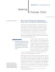 Making Change Stick By Stan Pace and Paul Rogers Why “fast, focused and simultaneous” works best in corporate transformations Seventy percent of change programs fail.1 Depressing news at a time when more and more companies face upheaval. They fail because leaders shy away from making changes broad enough, deep enough and—above all—swift enough to revive the company. Instead, they administer a series of half-cures, which often serve only to prolong the agony and don’t always save the patient. By contrast, companies that implement change programs that are fast, focused and simultaneous have the chance to create enormous and long-lasting shareholder value. Consider Optus Communications, a 1992 start-up and the No. 2 telecommunications The top five performers in our firm in Australia. After a promising start, by sample, generating annual stock- the mid-1990s the company faced a host of price appreciation in excess problems, including the end of Australia’s of 250%, each completed its telephone duopoly, a subsidiary hemorrhaging transformation in 20 months cash, a twice-delayed IPO and a revolving or less. door to the CEO’s office. In 1996 these problems culminated in a staggering beforetax loss of $667 million. In June 1997, shareholders came “within an inch of liquidating the company.”2 But instead of a line gone dead, investors soon heard the clear tone of a profitable company. First, Optus’ CEO and CFO were replaced and an entirely new management team installed. The new leadership integrated the problematic subsidiary, Optus Vision, and brought its cash outflow under control. A cost-saving initiative, Project Breakeven, Stan Pace, based in Dallas, targeting a variety of short-term opportunities, yielded $260 directs Bain & Company's global million in pretax earning improvements. Management completely change management practice. Paul Rogers, based in London, directs Bain's organization practice. 1Michael Beer and Nitin Nohria, “Cracking the Code of Change,” Harvard Business Review (May-June 2000): 133-141. 2Alan Deans and Finola Burke, “The Day Optus Shareholders Nearly Pulled the Plug,” Australian Financial Review, July 4, 1997, p. 1. reworked Optus’ balance sheet, put an employee stock ownership plan in place, and restructured senior management team objectives and incentives. Finally, they launched the long-delayed IPO. Elapsed time? One year. The common threads of successful change Beginning in 1997, a team of Bain consultants began an investigation to identify the key principles common to the most successful corporate transformations. We studied 21 of the most extraordinary business Optus then grew its profits for four consecutive years and became one of the top 10 Australian companies in market capitalization. In September 2001, Singapore Telecom acquired Optus for more than double the IPO price, locking in over $9 billion in shareholder value created since the turnaround began. “transformers” of the past decade and conducted interviews with the senior executives who directed them. The list of companies included maturing start-ups, spin-outs and corporations undertaking major change initiatives. (See Figure 1) Across all 21 companies, four common themes emerged: Focus on the results, not the process The speed and scope of Optus’ turnaround is remarkable. Yet it is consistent with other highly successful transformers. Bain & Company conducted an in-depth study of 21 companies that executed high-value-creating transformations. We found that the stock prices of the companies rose on average 250% per year in the period during and after their transformations, and more than 1000% per year for The best transformers focused first on developing a clear strategy. They established non-negotiable goals (financial and nonfinancial) to support that strategy and incentives to reinforce those goals. Then they stepped back and let managers figure out how to get the results. They did not dictate every step in the process or construct elaborate “change management programs.” some companies. These companies from all types Just ask Continental. When Greg Brenneman took of industries were large and small, public and private, over as president and chief operating officer of diversified and focused, international and regional, Continental Airlines in 1994, the company was and facing a variety of scenarios: turnaround, business about to crash-land. Legend had it that the airline redefinition, disruptive technologies, slowing growth had never met a budget forecast. It had churned and so on. In all of these remarkable stories, through 10 presidents in 10 years, was on the brink management followed the same four principles of a third bankruptcy, and ranked last on nearly in their approaches to change: every measure of customer satisfaction. Continental • Focus on the results, not the process • Change out key senior management… needed results in a hurry. Brenneman and his team began by introducing a host of measures to track and guide key levers of • …Then re-energize the ranks. company performance. They divided the measures • Do it fast and all at once into four categories: marketplace, product/customer, We are the first to concede that no transformation is a simple exercise. But in the great maelstrom that often accompanies organizational change, these four principles can give managers a simple and consistent people and financial. They set targets for their employees, provided meaningful incentives to meet them, and then let the employees figure out how to achieve the results. framework for organizing and executing action. B a i n & C o m p a n y, I n c . Making change stick 2 Within months Continental was near the top of Figure 1: Successful transformers all airlines in on-time performance. The program remains in place today, and so do its results: During Pacific Bell Wesley Jessen* Citizens Bank Nutraceutical* the second quarter 2002 Continental had an on-tim