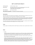 GIFT ACCEPTANCE POLICY Revision Approved: April 2016, President’s Cabinet Related Policies: Smith College Endowment Investment Policy Statement (approved October 2009) Named Endowed Fund Gift Levels (approved March 2010) Naming Guidelines (approved January 2011) Other Information: Gift Acceptance Procedures Office/Administrator Responsible: Development/Vice President for Development Introduction Smith College educates women of promise for lives of distinction. A college of and for the world, Smith links the power of the liberal arts to excellence in research and scholarship, developing leaders for society's challenges. The Office of Development seeks to further the mission of Smith College through the solicitation, acceptance, and administration of gifts of various kinds. In pursuing and facilitating such gifts, the Office of Development shall maximize the benefit to Smith College by acting in accordance with the policies established herein, and shall foster and steward relations so as to make the experience of donors and prospective donors as pleasant and rewarding as possible. Any exceptions to these policies must be approved by the Vice President for Development in consultation with the Vice President for Finance and Administration and other appropriate officers of the college as needed. Scope This policy applies to all charitable gifts offered to Smith College by any individual, couple or organization (formal or informal). Policy I. General All fundraising programs shall be conducted in a manner that does not conflict with any academic or administrative policies, and that protects the interests of Smith College. Concurrently, the interests of each donor shall be protected, and Smith shall not knowingly enter any arrangement which would jeopardize the donor’s interest or contradict the donor’s intent. Gifts shall be made to the college (not to an individual faculty or staff member or student) and shall be consistent with IRS rules and regulations governing charitable gifts. The Office of Development, in the management and reporting of gifts to Smith College, shall be guided by the standards of accounting and reporting established by the Council for Advancement and Support of Education (CASE). Annual fundraising reports shall confirm to the format used in the Council for Aid to Education’s (CAE) annual survey of Voluntary Support of Education (VSE) and shall be reconciled with Smith College accounting totals as approved by the Controller or their delegate. Additional reporting requests will take into account CASE and CAE guidance, along with Smith business needs and be crafted in consultation with the Controller or their delegate, being reconciled as appropriate. 1 1. Gift Acceptance Committee A Gift Acceptance Committee serves in an ad hoc capacity to review proposed Gifts-In-Kind and other complex assets to Smith College. The Committee will represent the college’s interest in evaluating the gift for a use related to the college’s mission. Gifts that fall under this committee’s review include tangible personal property, real property, life insurance, and other complex assets. The category “other complex assets” can include, but is not limited to, intellectual property, partnership interests, and restricted or non-publicly traded securities. The Committee reviews potential gifts utilizing the criteria set forth below. Market Value and Marketability. The Gift Acceptance Committee must receive a reasonably current appraisal of the fair market value of the property and interest in the property the college would receive if the proposed gift were approved. Gift officers will inform the donor that, if the gift is completed, the IRS will generally require a qualified independent appraisal made within sixty days of the date of gift. In the event that there is no immediate use for the proposed gift, the appraisal and other information must indicate clearly and convincingly that there is a market for the asset under consideration and that the asset can be sold within a reasonable period of time. Limitations and Encumbrances. The existence of any and all mortgages, deeds of trust, restrictions, reservations, easements, mechanic liens and other limitations of record must be disclosed. No gift of an interest in such property will be accepted until all mortgages, deeds of trust, liens and other encumbrances have been discharged, except in very unusual cases where the fair market value of the college’s interest in the property net of all encumbrances is substantial or where a separate agreement to pay any such encumbrances which might be charged to the college has been executed by a financially responsible party. Carrying Costs. The existence and amount of any carrying costs, including but not limited to property owners’ association dues, country club membership dues and transfer charges, taxes and insurance, must be disclosed. The Gift Acceptance Committee has delegated review of the following gifts types to the following responsible parties: gifts of books and collections for the library are reviewed by appropriate Library staff, works of art are reviewed by the Museum’s Curatorial Council, and in-kind gifts to the Botanic Garden are reviewed by the Director of the Botanic Gardens. 2. Policy on Confidentiality of Information Smith is committed to protecting the privacy of people whose personal information is held by the college through responsible information management. This includes information on constituents (alumnae, donors and potential donors) that is held by the Smith College Office of Development. Confidential information about Smith College constituents as well as confidential college information in oral form or on electronic, magnetic, or print media is protected to foster a trusting relationship between the constituent and the institution. In response to this trust, the college requires adherence to the college’s Code of Conduct and particularly its statement o