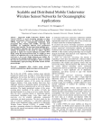 International Journal of Engineering Trends and Technology- Volume3Issue2- 2012 Scalable and Distributed Mobile Underwater Wireless Sensor Networks for Oceanographic Applications Devee Prasan.U1, Dr. Murugappan. S2 1 Dept of CSE, Aditya Institute of Technology and Management, Tekkali, Srikakulam, Andhra Pradesh 2 Department of Computer science & Engineering, Annamalai University, Chennai, Tamilnadu Abstract— Large-scale mobile Underwater Wireless Sensor Network (UWSN) is a novel networking paradigm to explore aqueous environments. However, the characteristics of mobile UWSNs, such as low communication bandwidth, large propagation delay, floating node mobility, and high error probability, are significantly different from ground-based wireless sensor networks. The novel networking paradigm poses inter-disciplinary challenges that will require new technological solutions. In particular, in this article we adopt a top-down approach to explore the research challenges in mobile UWSN design. Along the layered protocol stack, we roughly go down from the top application layer to the bottom physical layer. At each layer, a set of new design intricacies are studied. The conclusion is that building scalable mobile UWSNs is a challenge that must be answered by inter-disciplinary efforts of acoustic communications, signal processing and mobile acoustic network protocol design. Keywords— propagation delay, wireless sensor networks, acoustic communications, signal processing, network protocol I. INTRODUCTION The At the end of 20th century, wireless sensor networks became hot research area. At starts, it covers only terrestrial applications, but we know the Earth is a water plant as more than 70 % of the surface is covered by the water and the largely unexplored vastness of the oceans has attracted human’s attention. From many decades, there have been significant interests in monitoring aquatic environments for scientific, commercial exploration and as well as for military operations. The largely unexplored vastness of the ocean, covering about two-thirds of the surface of Earth, has fascinated humans for as long as we have records. Recently, there has been a growing interest in monitoring aqueous environments (including oceans, rivers, lakes, ponds and reservoirs, etc.) for scientific exploration, commercial exploitation and attack protection. The ideal vehicle for this type of extensive monitoring is a networked underwater wireless sensor distributed system, referred to as Underwater Wireless Sensor Network (UWSN). A scalable UWSN provides a promising solution for efficiently exploring and observing the aqueous environments which operates under the following constraints: A) Unmanned underwater exploration: Underwater condition is not suitable for human exploration. High water pressure, unpredictable underwater activities, and vast size of water area are major reasons for un-manned exploration. B) Localized and precise knowledge acquisition: Localized exploration is more precise and useful than remote exploration because underwater environmental conditions are typically localized at each venue and variable in time. Using long range SONAR or other remote sensing technology may not acquire adequate knowledge about physical events happening in the volatile underwater environment. C) Tether less underwater networking: The Internet is expanding to outer space and underwater. Undersea explorer Dr. Robert Ballard has used Internet to host live, interactive presentations with students and aquarium visitors from the wreck of the Titanic, which he found in 1985. However, while the current tethered technology allows constrained communication between an underwater venue and the ground infrastructure, it incurs significant cost of deployment, maintenance, and device recovery to cope with volatile undersea conditions. D) Large scale underwater monitoring: Traditional underwater exploration relies on either a single high-cost underwater device or a small-scale underwater network. Neither existing technology is suitable to applications covering a large area. Enabling a scalable underwater sensor network technology is essential for exploring a huge underwater space. By deploying scalable wireless sensor networks in 3dimensional underwater space, each underwater sensor can monitor and detect environmental events locally. Such can be accomplished with fixed position sensors. However, the aqueous systems are also dynamic and processes occur within the water mass as it advects and disperses within the environment. Therefore a mobile and dynamic observation system is optimal, and we refer UMSN with mobile sensors as mobile UWSN. In a mobile UWSN, the sensor mobility can bring two major benefits: (1) Mobile sensors injected in the current in relative large numbers can help to track changes in the water mass, thus provide 4D (space and time) environmental sampling. 4D sampling is required by many aquatic systems ISSN: 2231-5381 http://www.internationaljournalssrg.org Page 138 International Journal of Engineering Trends and Technology- Volume3Issue2- 2012 studies, such as estuary monitoring [5]; the alternative is to drag the sensors on boats and or on wires and carry out a large number of repeated experiments. This latter approach would take much more time and possibly cost. The multitude of sensors helps to provide extra control on redundancy and granularity. (2) Floating sensors can help to form dynamic monitoring coverage and increase system reusability. In fact, through a “bladder” apparatus one can dynamically control the depth of the sensor deployment, and force resurfacing and recovery when the battery is low or the mission is over. In traditional aquatic monitoring or surveillance applications, sensors are usually fixed to the sea floor or attached to pillars or surface buoys, and sensors with computational power are usually of big size. Thus, the sensor replacement and recovery cost is very high, as also res