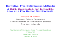 Derivative–Free Optimization Methods: A Brief, Opinionated, and Incomplete Look at a Few Recent Developments Margaret H. Wright Computer Science Department Courant Institute of Mathematical Sciences New York University Foundations of Computer-Aided Process Operations (FOCAPO) Savannah, Georgia January 9, 2012 I’m delighted to be here giving this talk. Thank you for the invitation! Disclaimer: This talk does not mention all the researchers who have worked and are working on derivative-free optimization. For an extended, factual, and complete review of derivative-free methods and software, see “Derivative-free optimization: A review of algorithms and comparison of software implementations”, Rios and Sahinidis (2011). Optimization is a central ingredient in all fields of science, engineering, and business—notably, as all of us here know, in chemical engineering and enterprise-wide optimization. This talk will consider the generic area of derivative-free optimization (also called non-derivative optimization), meaning unconstrained optimization of nonlinear functions using only function values. (But we do not count methods that form explicit finite-difference approximations to derivatives.) This talk will discuss only local optimization. When is a derivative-free method appropriate for minimizing f (x), x ∈ IRn ? • Calculation of f is very time-consuming or expensive, even on the highest-end machines. • f requires data collected from the real world (which may take hours, weeks, . . . ). • f is calculated through black-box software. • f is unpredictably non-nice (e.g., undefined at certain points, discontinuous, non-smooth). • f is “noisy” (not a precise term). For such problems, first derivatives are often difficult, expensive, or impossible to obtain, even using the most advanced automatic differentiation. A few examples (not from chemical engineering): • Drug selection during cancer chemotherapy, based on the patient’s measured responses, e.g. blood tests. • Importance sampling in image synthesis. • Automatic detection of airborne contaminants. • Optimizing a sheet-metal press line in the automotive industry. • Prediction of in vitro liver bile duct excretion. Typically we think of two broad classes of non-derivative methods: 1. “Direct search” • No explicit model of f . 2. Model-based • Create a model of f , usually linear or quadratic, based on interpolation or least-squares, and minimize the model in some form of trust region. NB: Genetic and evolutionary algorithms will not be considered. A sketchy history of direct search methods (more details in Rios and Sahinidis): • Started in 1950s (or before)—Fermi and Metropolis applied coordinate search in a 1952 paper. • LOVED by practitioners from day 1, especially the “simplex” method of Nelder and Mead (1965). • A fall from favor in mainstream optimization (but not with practitioners) throughout the 1970s and early 1980s. • A renaissance starting with Torczon’s (1989) PhD thesis, which gave a convergence proof for a new class (pattern search) of direct search methods. • Major activity ever since, especially theoretical analysis. Too many names to list them all here! Example: “Opportunistic” coordinate search (Fermi and Metropolis) looks for a new best point by taking steps along the ± coordinate directions, reducing the step if no strictly better point is found. 4 3 2 1 0 −1 −2 −3 −3 −2 −1 0 1 2 3 4 We now have convergence proofs (with varying definitions of “convergence”, e.g. results involving lim inf rather than lim) for these direct search methods and more: • pattern search and generalized pattern search, • generating set search, • mesh-adaptive direct search, • frame-based and grid-restrained methods. The proofs often require strong assumptions about f , such as twice-continuous differentiability, etc. Nelder–Mead, to be mentioned only in passing today, is a far outlier (with extremely limited theoretical results), but nonetheless near and dear to my heart. Typical proofs for direct search methods involve • Requirements that the set of search directions remain “nice” (think of the coordinate directions), and • Carefully specified acceptance criteria, e.g. simple or sufficient decrease. The proof techniques are very closely related to those used in derivative-based optimization. See papers by Abramson, Audet, Dennis, Kolda, Lewis, Torczon, . . . For approximately the past 10 years, there has been major interest in model-based methods. Why? If f is smooth, algorithms for unconstrained optimization are hardly ever efficient unless attention is given to the curvature of f . (Powell). By definition, vanilla direct search methods cannot do this. Proofs for model-based methods need to enforce conditions on the geometry of the sample points used to define the local models. (Some very recent methods use randomness to obtain the needed conditions with high probability.) See Introduction to Derivative-Free Optimization, by Conn, Scheinberg, and Vicente, SIAM (2009). Selected recent development 1: Within the past few years, some researchers in nonlinear optimization have become preoccupied with the computational complexity of many classes of unconstrained optimization methods, including Newton’s method, quasi-Newton trust region and line search methods, and steepest descent. There have been surprising results, such as that both steepest descent and Newton’s method may require O(1/ǫ2 ) iterations and function evaluations to drive the norm of the gradient below ǫ, even when f is bounded below and twice-continuously differentiable (Cartis, Gould, Toint, 2009). Remember the 2-d Rosenbrock “banana” function? fR = (x1 − 1)2 + 100(x2 − x21 )2 , with a steep curving valley that approximately follows the parabolic path x2 = x21 . The unique minimizer is x∗ = (1, 1)T . The “classical” starting point is (−1.2, 1)T . The difficulty of mi