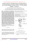 International Journal of Engineering Trends and Technology (IJETT) – Volume 16 Number 6 – Oct 2014 Design Analysis and Optimization of Hybrid Piston for 4 stroke Single Cylinder 10 HP (7.35 kW) Diesel Engine –A Review Amit B. Solanki#1, Mrs.Charula H.Patel#2, Abhishek Y. Makawana *3 1 Asst. Professor, Mechanical Engg.Deptt, C.U.Shah University, Wadhwan city, Gujarat, INDIA Asst. Professor, Mechanical Engg.Deptt, C.U.Shah University, Wadhwan city, Gujarat, INDIA 3 B.E.Student, Mechanical Engg.Deptt, Gujarat Technological University, Ahmadabad, Gujarat, INDIA 2 Abstract— The performance of any automobile largely depends on its size and working in dynamic conditions. The piston is a "heart" of the engine and its working condition is the worst one of the key parts of the engine in the working environment. The design of the piston optimization can lead to a mass reduction on the base of stress analysis satisfying the requirements of automobile specifications with cost and size effectiveness. Piston is the part of engine which converts heat and pressure energy liberated by fuel combustion into mechanical works. Engine piston is the most complex among automotive. This paper work describes design analysis and optimization of hybrid Piston for 4 stroke single cylinder 10 HP (7.35 kW) diesel Engine. The hybrid material, which consist of high strength (cast steel) piston crown and light alloy (aluminium alloy) for piston wall. The stress distribution of piston by using FEM and investigate and analyse of the actual engine condition during combustion process. The stresses due to combustion are considered to avoid the failure of the piston. Intensity of structural stresses should be reduced to have safe allowable limits. This paper introduces an analytical study of the structural effects on the diesel engine piston.CAD software Cre-O is used to model the piston and stress analysis is performed by using ANSYS.14 for weight optimization. The review of existing literature design analysis and optimization of hybrid Piston for 4 stroke single cylinder 10 HP (7.35 kW) diesel Engine is presented. The materials, manufacturing process, design consideration and structural and thermal analysis etc. of the piston are reviewed here. extremes of this motion are referred to as Top Dead Center (TDC) and Bottom Dead Center (BDC) [15] The main functions [14] of the piston are as follows: 1-To receive the gas load and transmit it to the crankshaft through the connecting road. 2- The disperse the heat of combustion from combustion chamber to the cylinder walls. 3-To reciprocate in the cylinders as a gas tight plug causing suction, compression, expansion and exhaust stroke. Keywords— Hybrid Piston, Diesel engine,Piston Strength Analysis, Weight Optimization. I. INTRODUCTION Fig. 1.1: Labeled Image of a Piston Combustion engines can be classified in two groups, as being follows External combustion (EC) engines and internal combustion(IC) engines. In internal combustion engine, piston II. PISTON COMPONENTS Main components of the piston are as follows: is one of the important component. It reciprocates within the cylinder bore by force produced during the combustion process. as shown in fig.1.1.[10].The piston is the heart of the internal combustion engine and is subjected to loads such as thermal and structural stress. The two ISSN: 2231-5381 A. Piston Crown- which carries gas pressure B. Skirt-which acts as a bearing against the side thrust of connecting http://www.ijettjournal.org Page 258 International Journal of Engineering Trends and Technology (IJETT) – Volume 16 Number 6 – Oct 2014 C. Piston Pin- Piston pins are used to connect the piston to the connecting rod. These pins are made from hard steel alloy and have a finely polished surface. Most piston pins are hollow, to reduce weight cleaner. This cool running property of aluminium is now recognized as being quite as valuable as its lightness. Indeed; piston are sometimes made thicker than necessary for strength in order to give improved cooling. D. Piston Rings- which seal the annular space between cylinder wall and piston and scrap off the surplus oil on the cylinder. [13] The allowable stresses for various materials are as under: [12] Cast iron-35 to 40 MPa AL alloy-50 to 90 MPa Cast Steel- 60 to 85 MPa An extensive literature review of Ahu Fahriye Acar et al. [2]. on Effects of Variations in Alloy Content and Machining Parameters on the Strength of the Intermetallic Bonding between a Diesel Piston and A Ring Carrier .He studied that variations in alloy content and graphite size have great influence on bonding quality. Francis Uchenna OZIOKO [9] performed casting of motorcycle piston from aluminium piston scrap using metallic mould. The piston core prepared gave rough surface of internal cavity, this may be due to the fact that bigger sieve was used or proper percentage sand mix composition was not used. The aim to maintain the supposed composition of the LM29 when the scrap was melted could not be achieved. IV. PISTON DESIGN CONSIDERATIONS AND CRITERIONS Fig. 1.2 Labelled Image of Piston Components III. PISTON MATERIALS AND MANUFACTURING PROCESS Following materials are used for I.C. Engines pistons: Cast iron, Cast Aluminium, cast steel and forged aluminium. The material used for piston is mainly aluminium [11] alloy. Aluminium pistons can be either cast of forged. In early years cast iron was almost universal material for pistons because it posses excellent wearing qualities, coefficient of expansion and genera suitability in manufacture. But due to reduction of weight in reciprocating parts, the use of aluminium for piston was essential. To obtain equal strength a greater thickness of metal is necessary. But some of the advantages of the light metal is lost. Aluminium is inferior to cast iron in strength and wearing qualities, and its greater coefficient of expansion necessities greater clearance in the cylinder to avoid the risk of seizure. The he