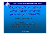 International Telecommunication Union Overview of International Video Coding Standards (preceding H.264/AVC) Gary J. Sullivan, Ph.D. ITU-T VCEG Rapporteur | Chair ISO/IEC MPEG Video Rapporteur | Co-Chair ITU/ISO/IEC JVT Rapporteur | Co-Chair July 2005 ITU- T VICA Workshop 22-23 July 2005, ITU Headquarter, Geneva Video Coding Standardization Organizations § Two organizations have dominated video compression standardization: • ITU-T Video Coding Experts Group (VCEG) International Telecommunications Union – Telecommunications Standardization Sector (ITU-T, a United Nations Organization, formerly CCITT), Study Group 16, Question 6 • ISO/IEC Moving Picture Experts Group (MPEG) International Standardization Organization and International Electrotechnical Commission, Joint Technical Committee Number 1, Subcommittee 29, Working Group 11 Video Standards Overview July ‘05 Gary Sullivan 1 Chronology of International Video Coding Standards H.120 H.120 H.263 H.263 (1995-2000+) (1995-2000+) H.261 H.261 (1990+) (1990+) H.262 H.262// MPEG-2 MPEG-2 (1994/95-1998+) (1994/95-1998+) ISO/IEC ITU-T (1984-1988) (1984-1988) MPEG-1 MPEG-1 MPEG-4 MPEG-4 Visual Visual (1993) (1993) H.264 H.264// MPEG-4 MPEG-4 AVC AVC (2003-2006) (2003-2006) (1998-2001+) (1998-2001+) 1990 1992 1994 Video Standards Overview July ‘05 1996 1998 2000 2002 Gary Sullivan 2004 2 The Scope of Picture and Video Coding Standardization § Only the Syntax and Decoder are standardized: • Permits optimization beyond the obvious • Permits complexity reduction for implementability • Provides no guarantees of Quality Source Pre-Processing Encoding Post-Processing & Error Recovery Decoding Destination Video Standards Overview July ‘05 Scope of Standard Gary Sullivan 3 Predictive Coding and DPCM § § Separate quantization of each sample is known as pulse-code modulation (PCM) Predictive Coding or Differential PCM: Generate an estimate for the value of the input data, and encode only the remaining difference. + Quantizer Prediction Predictor (e.g. weighted sum) Entropy Coder + Delay (Memory) (Channel) Entropy Decoder Decoded Samples (Decoding Process Shown Shaded) Video Standards Overview July ‘05 Gary Sullivan 4 H.120 : The First Digital Video Coding Standard § ITU-T (ex-CCITT) Rec. H.120: The first digital video coding standard (1984) • v1 (1984) had conditional replenishment, DPCM, scalar quantization, variable-length coding, switch for quincunx sampling • v2 (1988) added motion compensation and background prediction • Operated at 1544 (NTSC) and 2048 (PAL) kbps • Few units made, essentially not in use today Video Standards Overview July ‘05 Gary Sullivan 5 “Intra” Picture Coding by DCT Basic “intra” image representation: Discrete Cosine Transform (DCT) (early ‘70s, ITU+ISO JPEG approved ‘92): • Analyze 8x8 blocks of image according to DCT frequency content (images tend to be smooth) • Find magnitude of each discrete frequency within the block • Round off (“quantize”) the amounts to scaled integer values (‘50s, ‘60s, ...) • Send integer approximations to decoder using “Huffman” variable-length codes (VLC, early ‘50s) Video Standards Overview July ‘05 Gary Sullivan 6 The Discrete Cosine Transform § The DCT (unitary type II DCT): M −1 Fm , n ( u , v ) = N −1 ∑∑ x=0 cu 2 cv M 2 ( 2 x + 1) u π f ( m M + x , nN + y ) ⋅ cos N 2M ( 2 y + 1) v π ⋅ cos 2N y=0 § The Inverse DCT (unitary type III DCT): M −1 f$ ( m M + x , nN + y ) = N −1 ∑∑ u=0 cu 2 cv M 2 $ ( 2 x + 1) u π Fm ,n ( u , v ) ⋅ cos N 2M ( 2 y + 1) v π ⋅ cos 2N v=0 § Definition of Constants cu = 1 / cv = 1 / 2 for u = 0 , otherwise 1 . 2 for v = 0 , o t h e r w i s e 1 . Video Standards Overview July ‘05 M = 8 in curren t visual s tandards N = 8 in curren t visual s tandards Gary Sullivan 7 Coefficient Scan Order: The Zig-Zag Scan 0 1 2 3 4 5 6 7 8 9 10 11 0 0 0 0 16 17 18 19 20 21 22 23 24 25 26 27 28 29 30 31 32 33 34 35 36 37 38 39 40 41 42 43 44 45 46 47 48 49 50 51 52 53 54 55 56 57 58 59 60 61 62 63 Video Standards Overview July ‘05 Gary Sullivan 8 Interframe Motion Prediction § Large areas of images stay the same from frame to frame, changing mostly due to motion § Conditional Replenishment: Can signal to leave a block area of the image unchanged, or replace it with new data § Interframe Difference Coding: Could encode a refinement to the value of an area § Displaced Frame Difference Coding: Can predict an image area by copying some nearby part of the previous image (motion compensation) and optionally adding some refinement Video Standards Overview July ‘05 Gary Sullivan 9 P-Picture Predictive Coding I P Video Standards Overview July ‘05 P P P Gary Sullivan 10 H.261: The Basis of Modern Video Compression § ITU-T (ex-CCITT) Rec. H.261: The first widespread practical success • First design (late ‘90) embodying typical structure dominating today: – 16x16 macroblock motion compensation, – 8x8 DCT, – scalar quantization, – zig-zag scan, and – run-length – variable-length coding • Key aspects later dropped by other standards: loop filter, integer motion comp., 2-D VLC, header overhead • v2 (early ‘93) added a backward-compatible high-resolution graphics trick mode • Operated at 64-2048 kbps • Still in use, although mostly as a backward-compatibility feature – overtaken by H.263 Video Standards Overview July ‘05 Gary Sullivan 11 Blocks and Macroblocks The luma and chroma planes are divided into blocks. Luma blocks are associated with Cb and Cr blocks to create a macroblock. macroblock Cb Y Video Standards Overview July ‘05 Cr 8x8 sample blocks Gary Sullivan 12 H.261&3 Macroblock Structure = luma pixel = chroma pixel (two chroma fields) Intra/Inter Decisions: 16x16 macroblock DCT of 8x8 blocks H.261: 16x16 1-pel motion H.263: 16x16 1/2-pel motion or (AP mode) 8x8 1/2-pel motion with overlapping Video Standards Overview July ‘05 Gary Sullivan 13 Basic Hy