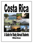 Costa Rica – A Guide for Study Abroad Students Table of Contents Host Families……………………………………………………………………….3 Travel……………………………………………………………………………….5 Food………………………………………………………………………………...7 University Life…………………………………………………………………….10 Money & Costs……………………………………………………………………11 Climate…………………………………………………………………………….12 Odd Cultural Aspects……………………………………………………………...14 Key Words and Meanings Tico/Tica – Synonym for Costa Rican Pura Vida – Costa Rican term for ‘life is good’ 2 Costa Rica – A Guide for Study Abroad Students Host Families Living with a host family is a very common and beneficial aspect to a student’s experience while studying abroad in Costa Rica. Just as all families are not the same in the United States, the same holds true for Costa Rican households. Nonetheless, there are aspects about Tico family life that will be useful to you as you plan your study abroad experience. The profile of a typical Tico host family can vary greatly from single ladies of all ages to old or young families with children. Given this vast difference, expectations can vary greatly depending on the family. Generally, it is very common for families to eat dinner together no matter the size, but they will likely be very willing to save you a plate if you will be late. Many times they will send a lunch to school with you if you will not be able to return from campus to eat. The number of meals the family provides will also depend on a previously determined agreement. Check with your program provider for details. While in a Tico house it is very important to keep your family updated on what you are doing. In Costa Rica, college students usually live at home until after they graduate. With this in mind, your host family will be very concerned about your well-being. You are not just a visitor, you are a part of their family and they feel responsible for your safety. Whenever you go anywhere you need to let your host family know where you are going and when you will get back. If you will be late, call to let them know or else they will be worried. Tico households represent the epitome of cleanliness. It is important to do your best to keep your room clean and to not clutter up the house. While in the United States children consider their room as ‘their own’, and often banish others from entering, for Ticos a child’s (or host student’s) room is just a place where they sleep. Your room should be picked up so your host mother can sweep and clean your room. They will respect your privacy while you are in your room. Some families are very willing to include you in their familial rituals, whether that is going to events or entertainment, or the market. The market, or feria, is a very important aspect of Tico life. This is a great time to learn while spending time with your family. Usually, families go to a feria that is held near their house once a week. Ask your family to take you with them, tell you the names of the products that are provided, and explain what they do with the product. 3 Costa Rica – A Guide for Study Abroad Students Depending on your host family, it is also very likely they will invite you along to spend time with you outside of the house. Movie theaters are very cheap in Costa Rica, and are a great way to learn Spanish by watching an English film with Spanish subtitles. If there are young adults in the house, it is likely that they will want to take you to see other parts of the country. Sometimes they will travel with you to the beach, which is kind of like having a tour guide all the time! Always tell them where you are going…they might want to go along, too. 4 Costa Rica – A Guide for Study Abroad Students Travel Costa Rica is becoming an increasingly popular tourist destination for United States citizens, but also for people from all over the world. The most popular time of the year to visit Costa Rica is during the winter holidays, which coincidentally coincides with the dry season, resulting in beautiful weather. There are many options for these short term visitors to reach their destinations, but for you as a temporary local, there will be other options that will likely fit you better. Travel in Costa Rica is simple, but at times can be painstakingly slow when compared to the U.S. Public transportation is the key to getting around. It is cheap, and the network of buses can get you almost everywhere you want to go. Depending on a number of variables, taking a bus or taxi will be the best options. The Costa Rican bus system is amazing. There are routes to all parts of the country, and in every neighborhood. When in town, you should not have to walk more than two or three blocks to reach your nearest bus stop. It is imperative to have your family teach you where the nearest bus stops are, because there are no signs or route maps. While this sounds daunting, you will learn quickly how to navigate the different routes to get to where you are going. At the local level, bus fares are cheap, usually less than one dollar to get where you are going within town. When you board the bus, you will pay the bus driver and he will give you change on the spot. It is best not to use big bills, such as 10,000 colones or greater. When you are approaching your stop, simply pull the string or touch the button to indicate you want to stop. If you cannot get to it, ask your neighbor to do it for you << ¿Podría tocar el timbre? >>. These local buses can get very crowded in the evening when everyone returns home from work…expect your personal space to be invaded! To travel to the coasts of Costa Rica you will lik