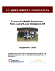 DOLORES HUERTA FOUNDATION D I G N I D A D | J U S T I C I A | R E S P E T O Community Needs Assessment: Arvin, Lamont, and Weedpatch, CA September 2009 Funded in part by the Central Valley Health Policy Institute, The California Endowment, and the CSU Bakersfield, Department of Social Work Dolores Huerta Foundation Community Needs Assessment: Arvin, Lamont, and Weedpatch, CA Prepared by: Roseanna McCleary, Ph.D. Mayra Lourdes Gonzalez, MSW CSU Bakersfield, Department of Social Work Camila Chávez, Executive Director, Dolores Huerta Foundation Research Assistants (CSUB Department of Social Work): Oscar Ceballos Edith Guttierez http://pics.city-data.com/clm/clu1661.png http://www.ens-newswire.com/ens/may2009/20090505_arvinsign.jpg http://wpcontent.answers.com/wikipedia/en/thumb/4/4f/Lamont_sign.jpg/250px-Lamont_sign.jpg http://www.panoramio.com/photo/7932182 ii Table of Contents Section Page No. Dolores Huerta Foundation……………………………………………………………..i Table of Contents……………………………………………………………………….iii List of Tables…………………………………………………………………………….v List of Figures…………………………………………………………………………...vi Executive Summary…………………………………………………………………….1 Introduction ……………………………………………………………………………...4 Mission of the Dolores Huerta Foundation……………….….………………4 Purpose of the Community Needs Assessment…….…………….………..4 Community Snapshots……………………………………………...………....4 Methods…………………………………………………………………..….………… 5 Phase I………………………………………………….…………….…………6 Phase II………………………………………………….……….……………..6 Results…………………………………………..…………………………………..…7 Demographics/Sample Characteristics, Phase I…………….………..……7 Age……………………………………………………………………….7 Gender.............................................................................................7 Marital Status……………………………………………………………8 Citizenship Status………………………………………………………8 Language………………………………………………………………10 Education………………………………………………………………10 Children with Special Needs…………………………………………11 Family and Household………………………………………………..11 Health Related Characteristics…………………………………………….11 Medical Insurance Coverage…………………………………………12 Frequency of Health/Dental Visits……………………………………13 Use of Emergency Room Services…………………………………..13 Chronic Diseases of Participants and Household Members………………………………………………………..13 Location of Medical Services Access……………………………….14 Children’s Use of Medical/Dental Services…………………………15 Preventive Care……………………………………………………….15 Reproductive Health…………………………………………………..17 Prescription Medicine Use……………………………………………18 Housing..................................................................................................19 Media/Communications Access……………………………………………20 Participant’s Income…………………………….…………….……………..21 Employment…………………………………….…………………………….22 iii Employment benefits…………………....…………………………..22 Transportation.........................................................................................23 Experience with Crime……………………….………………………………24 Social Services………………………………………………………………..24 Recreation……………………………………………………………………..26 Results by Community…………………….………………………………………….26 Household Characteristics…………………………………………………..26 Language in Household…………….………………………………..26 Citizenship Status…………………….……………………………….27 Health Related Characteristics……………..…….………………………..27 Medical Insurance Coverage………………………………………...27 Frequency/Location of Health/Dental Care Use…………………...28 Chronic Illness in Communities……………………………………...30 Government Assistance for Self....................................................31 Children’s Health…………………………………………………………….32 Government Assistance for Children in Household……………………...33 Experience with Crime by Community…………………………………….34 Household Survey Summary……………………………………………….34 Results Focus Groups Phase II ……………………………………………………34 Data Collection and Analysis………………………………………………36 An Ideal Community…………………………………………………36 Integration of Group Priorities………………………………………37 Communi