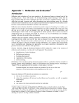 Appendix 1 : Reflection and Evaluation1 Introduction Reflection and evaluation of your own practice in the classroom forms an integral part of the teaching process. These skills need to be developed during teacher-training to ensure that the basic teaching skills have been reached by the time you become a qualified teacher. They are skills that you need to possess and utilise throughout your entire teaching career. It is through reflection and evaluation that you can experience professional development which enables you to become a more proficient and effective teacher with experience. Reflection and evaluation should be considered as positive aspects of teaching. As a teacher, you reflect on your practice and evaluate your performance in order to identify what went well, what did not go so well, or not as planned, why, and to think up alternate possibilities and methodologies which would be more appropriate in further practice. This is not an exercise in emphasising faults or weakness but should be viewed as a way of identifying your strengths together with areas that need further development. Teachers plan and organise learning experiences which they feel would benefit their pupils. Learning activities rarely work out the way they are planned. At times they are more effective than envisaged. Teachers thus need to reflect and assess the outcomes of a learning activity and evaluate the degree of success or failure of their performance. As a teacher, this exercise helps you in re-planning and changing your approaches as you gain experience; subsequently, your practice becomes more effective with experience. Proctor, Entwistle, Judge & McKenzie-Murdoch (1995) outline five steps in the exercise of reflection and evaluation, or as they call it, self-appraisal. These include: a. Identification of critical incidents b. Reflection and analyses c. Learning about oneself d. Application of the learning e. Self-monitoring Identifying critical incidents during classroom practice refers to a particular situation created in a learning context which highlights a barrier or facilitation to the learning process. According to Tripp (1993), the significance of the incident or event makes it ‘critical’. Incidents happen, but critical incidents are produced by the way we look at a situation, it is an interpretation of the significance of the event. p.8 Ghaye & Lillyman (1999) describe an incident as an experience: a. that can be an ordinary experience b. where the experience did not go to plan (these may be positive as well as negative experiences) c. went well d. that reflects the values and beliefs held by the individual 1 Further readings on the topic: (a) Brookfield, D. (1995) Becoming a critically reflective teacher. New York: Jossey-Bass; (b) Cole,P. G. & Chan, L. (1994) Teaching principles and practice. Australia: Prentice Hall. (c) Ghaye, T. & Ghaye, K. (1998) Teaching and learning through critical reflective practice. London: David Fulton. (d) Pollard, A. (2002) Reflective Teaching. London: Continuum. (e) Pollard, A. (2002) Readings for reflective teaching. London: Continuum 2 e. identify the contribution of qualified practitioners f. when it allows the identification of learning. Once this critical incident or incidents are identified, the teacher then reflects and analyses them in order to identify what s/he has learnt about her/himself as a teacher, the children as learners and about teaching and learning in general. On the basis of the reflection and learning, the teacher then applies this learning, which may involve a consolidation or change in approach to other situations. As this process of reflection and evaluation is repeated, the teacher monitors his/her own progress. Aims and objectives By the end of the tutorial and observations you should be able to: • • • • • highlight the role and importance for teachers to reflect on and evaluate their practice; describe the process of evaluation and reflection; identify the different types and focus that the exercise can take; evaluate and reflect upon your own teaching; and write the evaluation report required during teaching practice. Writing a self-evaluation during teaching practice There are various ways that student-teachers can approach their self-evaluation exercise during teaching practice. Whatever the approach, it is important to be able to reflect and evaluate on your own practice. Self-evaluations can be written on general lines where the teacher reflects on his/her practice overall, or else focused on particular issues related to learning and teaching. See the Reflective Questions (RQs) in the Primary Kit. The RQs are designed to help you reflect on some aspects of classroom practice. It is an exercise to set your reflective process in motion. General Self-Evaluation In a general evaluation, the teacher looks at his/her own practice holistically over a period of time. This can be done on a weekly basis. Reflection will involve looking at the different learning activities and trying to identify which ones went well and which ones were not as good as planned. The teacher can then identify the strengths and weaknesses of his/her performance and learn from them. S/he then goes on to identify what alternative strategies and methodologies s/he could have used instead. This exercise can also be done for specific lessons for which more reflection is needed due to the way that they turned out. Various educational issues can be taken into consideration, depending on the situations and critical incidents arising during the practice within the period under evaluation. Self-Evaluation focusing on specific education issues At times, the teacher may decide to reflect and focus on specific educational issues, for example one’s communication skills like questioning technique, classroom management like organisation of group-work, inclusion, dealing with particular learning difficulties etc. The scope of such focus is that due to factors 