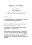 ITU Workshop on Accessibility Bamako, Mali, 13-15 October 2009 Keynote Speech Malcolm Johnson Director, Telecommunication Standardization Bureau International Telecommunication Union Excellencies, Distinguished colleagues, Ladies and Gentlemen, It is a great pleasure to be here in Mali. It is my first time as Director of the ITU Telecommunication Standardization Bureau… Please let me take this opportunity to thank, very much, our hosts, the administration of Mali and in particular the honourable minister H.E. Mrs Diarra Mariam Diallo for being here. Also, I would like to thank Dr. Choguel Kokalla Maiga, General Director of the Committee of the Regulatory Authority for his presence here today. It is very appropriate that we are holding this workshop during the month of solidarity for the disabled in Mali. ITU joins with Mali in its solidarity for the disabled. Indeed, around the world, momentum is building for initiatives that allow persons with disabilities to take their rightful place in society. As the Secretary General mentioned in his video address; in 2006, the UN General Assembly adopted the Convention on the Rights of Persons with Disabilities, which obliges its signatories to provide public information in formats and technologies appropriate to different kinds of disabilities. 2 Universal Design principles in standards make new technologies accessible for persons with disabilities and are now imperative with the wide adoption of the UN Convention. Tackling the issue of accessibility too late in the product design cycle adds unnecessary cost, as does the absence of policies that could help encourage mass production of accessible devices. It is hoped that the UN Convention will redress this problem, and spur new opportunities that will encourage the private sector to channel more investment into this domain. Industry and governments need to understand that persons with disabilities not only need to be included but have a right to be included in the new technological achievements and advances of our time. This is especially important for developing countries that look to the developed world and to ITU for guidance. As the world’s pre-eminent global ICT standards organization, ITU is embracing the challenges of accessibility through standardization efforts and has long championed the principles of inclusion and Universal Design enshrined in the UN Convention. The ITU began its work on accessibility for persons with disability in 1991. It started with one standard called V.18 – a modem that could invisibly translate the different protocols of the deaf telephone network that already existed in many different countries. Although V.18 was agreed in 1995 implementation levels were never high. It was however a beginning for ITU’s path towards including accessibility features in its standards and its role as a strong accessibility advocate. Indeed, advocacy has become the thrust of ITU accessibility today, due to this lack of industry implementation. It is a problem that still exists, not just for text telephony and other accessibility features, but also for accessible web and ICTs. Finding solutions to these challenges is not always a simple matter. On the one hand, equipment and software is now available that provides 3 amazing breakthroughs for people with disabilities. On the other hand, there are many barriers to finding the most appropriate equipment, particularly at affordable prices. In 2008 we established a new ITU group to coordinate standardization activities on accessibility and human factors issues. It is called the joint coordination activity on accessibility and human factors (JCA-AHF) and is open to all experts working in the field to improve access to the information society by people with varied capability of handling information and the controls for its presentation. We are very pleased that in 2008 the coordinator of this group Andrea Saks was made a laureate by the World Telecommunication and Information Society Day. She will speak later today on the JCA and some of its activities. Also in 2008, ITU took the initiative to establish the Dynamic Coalition on Accessibility and Disabilities that met for the first time last year at the Internet Governance Forum (IGF). And, at last year’s Global Standards Symposium in Johannesburg, where we had leaders of industry, government ministers, heads of regulatory bodies and standards bodies, accessibility to ICT services was recognised as a major enabler to economic and social development especially since a significant percentage of persons with disabilities are poor and live in developing countries. This event was followed by the World Telecommunication Standardization Assembly (WTSA-08) which adopted a historic Resolution the first ITU Resolution recognising the importance of the work on accessibility and mandating ITU to document best practice, review its services and facilities for accessibility, and to work on programmes to progress accessibility in developing countries. In our Development sector (ITU-D), represented here by Asenath Mpatwa, Guidelines for mainstreaming ICT accessibility issues provide a catalogue of commercially available accessibility technologies that 4 enable access to ICTs and consider the socio-economic barriers that limit their world-wide availability. It is available free on our website. In addition, ITU and G3ict - represented here by Executive Director, Axel Leblois - have developed an on-line toolkit for policy makers, regulators and other stakeholders to develop policies and strategies addressing ICT accessibility in line with the UN Convention. We also have a number of projects to equip schools and multi-purpose community telecentres with assistive devices such as Braille printers to extend ICT services to persons with disabilities. So you see accessibility is a priority for ITU and we are committed to addressing this important issue in partnership with many other organisations, and many d