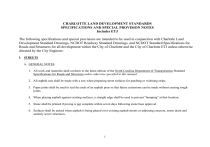 CHARLOTTE LAND DEVELOPMENT STANDARDS SPECIFICATIONS AND SPECIAL PROVISION NOTES Includes ETJ The following specifications and special provisions are intended to be used in conjunction with Charlotte Land Development Standard Drawings, NCDOT Roadway Standard Drawings, and NCDOT Standard Specifications for Roads and Structures for all development within the City of Charlotte and the City of Charlotte ETJ unless otherwise directed by the City Engineer. I. STREETS A. GENERAL NOTES 1. All work and materials shall conform to the latest edition of the North Carolina Department of Transportation Standard Specifications for Roads and Structures unless otherwise specified in this manual. 2. All asphalt cuts shall be made with a saw when preparing street surfaces for patching or widening strips. 3. Paper joints shall be used to seal the ends of an asphalt pour so that future extensions can be made without causing rough joints. 4. When placing asphalt against existing surfaces, a straight edge shall be used to prevent “humping” at that location. 5. Stone shall be primed if paving is not complete within seven days following stone base approval. 6. Surfaces shall be tacked when asphalt is being placed over existing asphalt streets or adjoining concrete, storm drain and sanitary sewer structures. 1 7. In rolling and hilly terrains, sweeping of the stone base and/or application of a tack coat may be required near intersections. These requirements will be established by the City Inspector based on field conditions. 8. ALL concrete used for streets, curb and gutter, sidewalks and drainage structures, etc. shall have a minimum compressive strength of 3600 PSI at 28 days. This requirement shall be provided regardless of any lesser compressive strength specified in the North Carolina Department of Transportation Standard Specifications for Roads and Structures. The contractor shall prepare concrete test cylinders in accordance with Section 1000 of the North Carolina Department of Transportation Standard Specifications for Roads and Structures at the direction of the project inspector. All equipment and cylinder molds shall be furnished by the contractor. It shall be the responsibility of the contractor to protect the cylinders until such time as they are transported for testing. Testing for projects shall be performed by an independent testing lab, at no cost to the City. The contractor shall provide equipment and perform tests on concrete for a maximum slump and air content as defined in Section 1000 of the North Carolina Department of Transportation Standard Specifications for Roads and Structures. These tests shall be performed at a frequency established by the inspector. Materials failing to meet specifications shall be removed by the contractor. 9. All concrete shall be cured with 100% Resin Base, white pigmented curing compound which meets ASTM Specifications C309, Type 1, applied at a uniform rate at one (1) gallon to 400 square feet within 24 hours of placement of the concrete. 10. All curb and gutter shall be backfilled with soil approved by the Inspector within 48 hours after construction to prevent erosion. 11. All backfill shall be non-plastic in nature, free from roots, vegetative matter, waste, construction material or other objectionable material. Said material shall be capable of being compacted by mechanical means and the material shall have no tendency to flow or behave in a plastic manner under the tamping blows or proof rolling. 12. Materials deemed by the Inspector as unsuitable for backfill purposes shall be removed and replaced with select backfill material. 2 13. All trenches in the street right-of-way shall be backfilled with suitable material immediately after the pipe is laid. The fill around all pipe shall be placed in layers not to exceed six (6) inches and each layer shall be compacted thoroughly. 14. Under no circumstances shall water be permitted to rise in un-backfilled trenches after the pipe has been placed. 15. Compaction requirements shall be attained by the use of mechanical compaction methods. Each six (6) inch layer of backfill shall be placed loose and thoroughly compacted into place. 16. Straight forms shall not be used for forming curb and gutter in curves. 17. All excess concrete on the front edge (lip) of gutter shall be removed when curb and gutter is poured with a machine. 18. All subgrade shall be compacted to 100% of the maximum density obtainable with the Standard Proctor Test to a depth of eight (8) inches, and a density of 95% Standard Proctor for depths greater than eight (8) inches. All tests shall be performed by developer at no cost to the City. 19. A canvas cover or other suitable cover shall be required for transporting plant mix asphalt during cool weather when the following conditions are present: a. Air temperature is below 60 degrees F. b. Length of haul from plant to job is greater than five (5) miles. c. Other occasions at the Inspector’s discretion when a combination of factors indicates that material should be covered in order to assure proper placement temperature. 20. Concrete or asphalt shall not be placed until the air temperature measured at the location of the paving operation is at 35 degrees F and rising by 10:00 a.m. Concrete or paving operations should be suspended when the air temperature is 40 degrees F and descending. The contractor shall protect freshly placed concrete or asphalt in accordance with Sections 420 (Concrete Structures), 600 (Asphalt Bases And Pavements), and 700 (Concrete Pavements And Shoulders) of the North Carolina Department of Transportation Standard Specifications when the air temperature is at or below 35 degrees F and the concrete has not obtained an age of 72 hours. 3 21. The contractor shall maintain two-way traffic at all times when working within existing streets. The contractor shall place and maintain signs, danger lights, and barricades and furnish watchmen or flagmen to direct traffic in accord