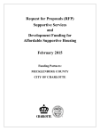 Request for Proposals (RFP) Supportive Services and Development Funding for Affordable Supportive Housing February 2015 Funding Partners: MECKLENBURG COUNTY CITY OF CHARLOTTE Table of Contents 1. Introduction 2. General Procedures 3. Mecklenburg County 4. City of Charlotte 5. Appendices 2 1. INTRODUCTION 3 1.1 Overview The City of Charlotte Neighborhood & Business Services (“NBS”) and Mecklenburg County Community Support Services, (“CSS”), or collectively the (“Collaborative Partners”) are jointly accepting proposals for supportive housing developments and supportive housing programs. Supportive housing developments may serve chronically homeless individuals and families. Funds are available for housing development or rehabilitation and/or supportive services staffing with the understanding that supportive programs are intended to improve residents’ quality of life. Supportive services funding must be paired with non-time limited housing. Developments seeking capital funding from the City of Charlotte must be developed in compliance with City Council’s approved Housing Development Policies. The primary intent of this Request for Proposals (RFP) is to select and contract with qualified organizations demonstrating competencies in housing development and best practices in resident outcomes for eligible populations, to ensure health and safety of residents, and demonstrating efficient and responsible use of funds. This coordinated RFP provides a streamlined process for the Collaborative Partners to review applications and award funding to organizations most qualified to meet supportive housing needs. Applicants may choose to apply for one, or both funding sources available through this RFP on Form A. 1.2 Participating Funders and Funding Availability 1.2.1 MECKLENBURG COUNTY COMMUNITY SUPPORT SERVICES DEPARTMENT (“CSS”): For the purposes of this RFP, Mecklenburg County CSS will allocate up to $800,000 for supportive services up to three fiscal years depending on recipient performance, funding availability and the eligible population served. One or multiple awards may be awarded. In its discretion, Mecklenburg County CSS will allocate Housing Stability and Supportive Services (HSS) funds based on a 1to 15 social worker to client ratio to qualified RFP respondents. Contact: Jamie Privuznak, Management Analyst Jamie.Privuznak@mecklenburgcountync.gov, 704-432-3525 1.2.2 CITY OF CHARLOTTE NEIGHBORHOOD & BUSINESS SERVICES, HOUSING SERVICES (“NBS”): An amount of up to $1,500,000 from the City of Charlotte will be allocated from existing housing dollars for the purpose of funding costs associated with construction or rehabilitation of the development of supportive housing. Contact: Zelleka Biermann, NBS Housing Services Supervisor zbiermann@ci.charlotte.nc.us, 704-336-2482 4 1.3 Goals and Objectives The goal of this RFP is to provide supportive housing developments and/or programs that support the goals of the Ten Year Plan to End and Prevent Homelessness (“Plan”). For the purposes of this RFP, proposals that support new construction or rehabilitation of supportive housing units and supportive services programs for homeless families and chronically homeless individuals or families will be given priority. In cases where a developer is seeking capital funding from the City, developments must be developed and located in compliance with City Council’s approved housing policies. 5 2. GENERAL PROCEDURES 6 Information Session Organizations interested in applying for funds are strongly encouraged to attend an information session on February 13, 2015. During this session, the Collaborative Partners will provide an overview of the RFP, discuss the common funding priorities and development goals, provide information on each of their available funds, and provide details on the application process. INFORMATION SESSION February 13, 2015 10:00 A.M EST City of Charlotte Old City Hall Wilmore Conference Room 106 600 East Trade Street Charlotte, NC 28202 2.1 Timeline for Submission and Award Activity Public Notice announcing RFP RFP Information Session Final Date for Submission of Questions Proposal Submission deadline Proposal Evaluations complete Project Proposal Selection and Funding Award Date Feb 6, 2015 Feb 13, 2015 Feb 20, 2015 March 6, 2015 April 2015 April/May 2015 2.2 Submission of Questions Notify Jamie Privuznak, in writing or via email, if discrepancies or omissions are found in this RFP or any other document(s) provided by the Collaborative Partners. A written addendum will be made available, via Mecklenburg County and the City of Charlotte’s website, as deemed necessary by the Collaborative Partners. Any questions about this RFP must be submitted, via email. All questions shall be directed to: Jamie Privuznak, Management Analyst via Jamie.Privuznak@mecklenburgcountync.gov no later than 5 PM EST, February 20, 2015. 7 2.3 Submission of Proposal 2.3.1 All Proposals must include: a. Electronic Copy: Submit one PDF attachment of all non-confidential information and one PDF attachment of all confidential information to Jamie Privuznak, Management Analyst, Mecklenburg County, via Jamie.Privuznak@mecklenburgcountync.gov NOTE: All information contained and submitted in the proposal that is not identified as confidential shall become public property and after final award of the RFP, copies of non-confidential portions of each proposal submitted may be provided to parties requesting copies of the request for proposal submissions. b. Hard Copies: Three hard copies of the proposal are required. If applying for the County’s Supportive Service dollars, attach three copies of the completed budget excel form. c. USB Drive: Include one USB drive with your agency’s proposal in a PDF format. If applying for the County’s Supportive Service dollars, include the completed budget Excel form on the USB drive. Include the USB drive with the three hard copies. 2.3.2 Submission Date Proposals