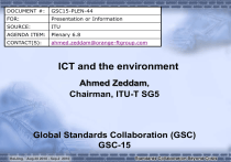 DOCUMENT #: GSC15-PLEN-44 FOR: Presentation or Information SOURCE: ITU AGENDA ITEM: Plenary 6.8 CONTACT(S): ahmed.zeddam@orange-ftgroup.com ICT and the environment Ahmed Zeddam, Chairman, ITU-T SG5 Global Standards Collaboration (GSC) GSC-15 Highlight of Current Activities: ITU-T ITU-T SG5 Lead Study Group on ICTs and climate change: • Recent ITU-T SG5 meetings Oct. 2009: SG5 meeting & JCA on ICT&CC Jan. 2010: WP3/5 meeting & JCA on ICT&CC April 2010: SG5 meeting Nov.-Dec. 2010: SG5 meeting New • Contribution to Joint ITU-T/ISO IEC JTC 1 Leadership meeting Work on E-waste and recycling • Recommendation L.1000 (approved in March 2010) • Universal charger solution for mobile terminals • The first ITU-T Rec. on ICT&CC • Work on L.1000 phase 2 started Work on Methodologies : L.method. general principles (Oct 2010) Work on Energy efficiency : Recommendation on Power feeding systems (2011) Participation in UNFCCC process including COP-16 • Promotion of the role of ICTs in reducing GHGs ITU-R and ITU-D ’s activities on climate change 2 Highlight of Current Activities: ITU-R As the steward of the global framework for spectrum, ITU-R: Provides radio-frequency spectrum and satellite orbits for applications (space and terrestrial) employed in climate monitoring and climate change prediction Develops international treaty level standards for non-interference operation of radiocommunication systems involved in climate monitoring and mitigation of negative impact of climate change Carries out studies (through ITU-R Study Groups) for development of new wireless technologies Develops World-wide standards (ITU-R Recommendations) Facilitates the introduction and operation of modern radio technologies and systems with low-energy consumption Assists administrations in implementing radio systems by analyzing compatibility between new and existing systems See ITU-R Web page “Radiocommunications and Climate Change” at: http://www.itu.int/ITU-R/index.asp?category=information&rlink=climate-change&lang=en Highlight of Current Activities: ITU-D New Questions • ITU-D SG1, Q24/1: Strategies and policies for the proper disposal or reuse of ICT waste material • ITU-D SG2, Q24/2: ICT and Climate Change E-environment Toolkit for policymakers gives principles and guidelines for the development of applications and services in the area of the environment. Will help countries to assess the contribution that ICTs can make to reduce GHG emissions 4 Strategic Direction Leader role on methodologies Work on the methodologies for the evaluation of energy impact and GHG emissions has gained much visibility and generates strong expectations from many actors, such as the EC and the UNFCCC, which plan to rely on it and use it in the near future • Recommendations development plan: Overview umbrella Rec. (Target: 2010) Methodology for ICT goods and services (Target: 2010) Methodology for ICT projects (Target: 2012) Methodology for ICT in organizations (Target: 2011) Methodology for ICT sector in countries (Target: 2012) Coordination activities through JCA on ICT&CC • Coordination with SGs within ITU-T/R/D • Promote collaboration with other organizations : ISO, IEC, GeSI, ETSI, EC, OECD, UNFCCC, UNEP, WIPO, UNIDO, etc. • Invitation of non-member experts and/or organizations • Next Meeting to be held on 29 September 2010 Attract general interest from wider scope of people through symposia and other events 5 Challenges Since "ICT& the Environment" is broad in scope, collaboration with other bodies is indispensable to progress the work effectively without duplication • Multiple organizations are working on ICT & CC such as on universal charger and methodologies. Expertise from other organizations helps the work Non standards organizations are also working Expectation for quick development is strong • We are expected to work even faster Partnership between ITU, GeSI and WBSD (World Business Council for Sustainable Development) 6 Next Steps/Actions (1/2) Acceleration of the ongoing work using interim F2F meeting, e-meeting, etc. • Q18: Methodologies (Overview umbrella Rec. and Recs in 4 major areas) • Q19: Efficient power feeding system (Higher voltage DC power supply within a telecommunication office, datacenter, etc.) • Q21: L.1000 phase 2, e-waste, recycling of rare metals, copper cables and optical fibers Promotion of collaboration and coordination • JCA on ICT & CC • Invite relevant organizations or experts • Partnerships and others ways? 7 Next Steps/Actions (2/2) 4th Meeting of the Dynamic Coalition on Internet & Climate Change (16 September 2010, Vilnius, Lithuania) during the next Internet Governance Forum • DCICC: is a body committed to moderating the environmental impact of the Internet, to seeking new ways to embrace the power of the Internet for reducing greenhouse gas emissions worldwide, and to enabling transformation in line with the objectives set and to be set under the United Nations Framework Convention on Climate Change (UNFCCC). New 5th Symposium on ICTs and the Environment & Climate Change (2-3 November 2010, Cairo, Egypt) • • Topics to be discussed will include: adaptation to climate change, e-waste, costeffective ICT technologies, methodology of environmental impact assessment of ICT and financing of climate change solutions. Outcome: The symposium will issue the “Cairo Road Map”, a set of recommendations for action in relation to ICTs, the Environment and Climate Change. New 8 Supplementary Slides 9 ITU-T & Climate Change WTSA Resolution on ICTs & Climate Change: The World Telecommunication Standardization Assembly 2008 (WTSA-08) adopted Resolution 73, in which Member States recognized the important of action to address climate change, the important role that standards can play and requires all new ITU-T standards (Recommendations) to be checked against energy saving and environmental criteria. Policy & Technology Watch: Through its Policy & Technology Watch