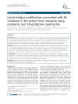 Tetreau et al. BMC Genomics 2012, 13:248 http://www.biomedcentral.com/1471-2164/13/248 RESEARCH ARTICLE Open Access Larval midgut modifications associated with Bti resistance in the yellow fever mosquito using proteomic and transcriptomic approaches Guillaume Tetreau1*†, Krishnareddy Bayyareddy2†, Christopher M Jones3, Renaud Stalinski1, Muhammad A Riaz1, Margot Paris1, Jean-Philippe David1, Michael J Adang2,4 and Laurence Després1 Abstract Background: Bacillus thuringiensis var. israelensis (Bti) is a natural larval mosquito pathogen producing pore-forming toxins targeting the midgut of Diptera larvae. It is used worldwide for mosquito control. Resistance mechanisms of an Aedes aegypti laboratory strain selected for 30 generations with field-collected leaf litter containing Bti toxins were investigated in larval midguts at two levels: 1. gene transcription using DNA microarray and RT-qPCR and 2. differential expression of brush border membrane proteins using DIGE (Differential In Gel Electrophoresis). Results: Several Bti Cry toxin receptors including alkaline phosphatases and N-aminopeptidases and toxin-binding V-ATPases exhibited altered expression levels in the resistant strain. The under-expression of putative Bti-receptors is consistent with Bt-resistance mechanisms previously described in Lepidoptera. Four soluble metalloproteinases were found under-transcribed together with a drastic decrease of metalloproteinases activity in the resistant strain, suggesting a role in resistance by decreasing the amount of activated Cry toxins in the larval midgut. Conclusions: By combining transcriptomic and proteomic approaches, we detected expression changes at nearly each step of the ingestion-to-infection process, providing a short list of genes and proteins potentially involved in Bti-resistance whose implication needs to be validated. Collectively, these results open the way to further functional analyses to better characterize Bti-resistance mechanisms in mosquitoes. Keywords: Aedes aegypti, Bacillus thuringiensis israelensis, DIGE, Microarray, RT-qPCR, Resistance, Transcriptomics, Proteomics, Midgut, Mosquito, Candidate genes Background Mosquito control represents a major public health concern as mosquitoes transmit many pathogens causing fatal human diseases including malaria, filariasis, dengue, yellow fever, and Chikungunya [1]. Vector borne diseases represent a major health threat and economic burden in disease-endemic countries and are currently expanding worldwide [2,3]. As no specific treatment exists for most of these diseases, the most effective way of reducing the incidence of these diseases is to control the vector mosquitoes [4,5]. Chemical insecticides still used in endemic countries have shown their limits as resistance has * Correspondence: guillaume.tetreau@gmail.com † Equal contributors 1 Laboratoire d’Ecologie Alpine, LECA-UMR 5553, Université de Grenoble 1, BP 53, 38041, Grenoble cedex 09, France Full list of author information is available at the end of the article evolved in all target species together with environmental concerns due to their high persistence and toxicity for non-target organisms, including humans [6]. The bacterium Bacillus thuringiensis var. israelensis (Bti) produces a mosquitocidal toxic crystal during sporulation and represents the best alternative to chemical insecticides for mosquito larval control due to its high potency and specificity [7]. The action of Bti begins when larvae ingest Bti spores and toxic crystals. In susceptible larvae, the toxic crystal is dissolved in the alkaline pH of the midgut, protoxins are then activated by digestive proteases to activated-toxins that bind to specific membrane receptors, form pores, disrupt the midgut epithelium, allowing spore penetration and bacterial proliferation in the host tissues [7,8]. The receptors for mosquitocidal Bti Cry toxins are similar to the © 2012 Tetreau et al.; licensee BioMed Central Ltd. This is an Open Access article distributed under the terms of the Creative Commons Attribution License (http://creativecommons.org/licenses/by/2.0), which permits unrestricted use, distribution, and reproduction in any medium, provided the original work is properly cited. Tetreau et al. BMC Genomics 2012, 13:248 http://www.biomedcentral.com/1471-2164/13/248 lepidopteran-active Cry toxins which utilize Naminopeptidase, alkaline phosphatase and cadherin proteins as midgut receptors [9]. In contrast to Bacillus thuringiensis subspecies active against lepidopteran and coleopteran species where cases of insect resistance in the field have been reported [10-13], only one study reported Bti resistance in field mosquitoes [14]. However, subsequent confirmations of this case have not been reported. The delay in the evolution of resistance to Bti is believed to be due to its composite toxic crystal containing four major toxins (Cry4Aa, Cry4Ba, Cry11Aa and Cyt1Aa) [7]. Cyt toxins are known to largely enhance Cry toxins activity due to synergic effects and to drastically decrease resistance development [8,15]. Although Bti is known to have a low persistence in the environment, recent studies suggest that it can persist and possibly proliferate in specific conditions [16-18]. In the French Rhône-Alpes region, decaying leaf litters collected in mosquito breeding sites several months after a Bti treatment revealed a high toxicity against mosquito larvae due to the presence of large amounts of Bti [16]. This toxic leaf litter was used to select an Aedes aegypti strain in laboratory conditions. After 18 generations, the selected strain (named LiTOX) was only moderately resistant to the whole Bti toxins mixture, but up to 30 fold resistant to individual Cry toxins [19]. Although resistance to Bti has already been selected in laboratory conditions [20,21], this is the only reported case of resistance obtained by using fieldcollected material containing residual Bti toxins. Therefore, this Bti-resistant