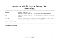 Materials with Biological Recognition (continued) Last time: Today: Biological recognition in vivo Engineering biological recognition of biomaterials: adhesion/migration peptides Engineering biological recognition of biomaterials: enzymatic recognition and cytokine signaling Reading: J.C. Schense et al., ‘Enzymatic incorporation of bioactive peptides into fibrin matrices enhances neurite extension,’ Nat. Biotech. 18, 415-419 (2000) Supplementary Reading: - ANNOUNCEMENTS: Lecture 12 Spring 2006 1 Cell adhesion on biomaterials: Cell responses to non-biological, synthetic biomaterials 1. Protein adsorption 2. Denaturation (unfolding)? 3. Cell responses to expected and unexpected epitopes 4. Reorganization? • Vroman effect: protein exchange Lecture 12 Spring 2006 2 Control of cell attachment by mechanical properties of substrate Polyelectrolyte multilayers (Rubner lab MIT): Images removed due to copyright reasons. Please see: Mendelsohn, Jonas D., Sung Yun Yang, Jeri'Ann Hiller, Allon I. Hochbaum, and Michael F. Rubner. "Rational Design of Cytophilic and Cytophobic Polyelectrolyte Multilayer Thin Films." Biomacromolecules 4 (2003): 96-106. Lecture 12 Spring 2006 3 Control of cell attachment by mechanical properties of substrate (Van Vliet and Rubner labs): Graph removed due to copyright reasons. Please see: Figure 3 in Thompson, M. T., et al. Biomaterials 26 (2005): 6836–6845. Graph removed due to copyright reasons. Please see: Figure 4 in Thompson, M. T., et al. Biomaterials 26 (2005): 6836–6845. Lecture 12 Spring 2006 4 Controlling cell response to biomaterials by building in ECM cues on a ‘blank slate’ background Lecture 12 Spring 2006 5 Design of protein adsorption-resistant surfaces Lecture 12 Spring 2006 6 Design of protein adsorption-resistant surfaces Surface modification strategies: Self-assembled monolayers (SAMs): Surface grafting: Graft copolymers or surface polymerization: Lecture 12 Spring 2006 7 Limiting nonspecific cell adhesion Methyl methacrylate PMMA O O O z y x O O O OH O m n Fraction of cells adhered relative to TCPS Poly(ethylene glycol) methacrylates 0.2 9-unit side chains 0.15 comb 0.1 0.05 0 20 30 45 weight fraction PEO units Lecture 12 Spring 2006 8 Tailoring cell adhesion on biomaterials via immobilized ligands peptide PEO PMMA Peptide integrin-binding GRGDSP sequence PEO short 6-9 unit side chains for protein resistance PMMA backbone anchors hydrophilic side chains Lecture 12 Spring 2006 9 Peptides used to modulate cell adhesion on biomaterials Peptide sequence IKVAV Derived from RGD YIGSR Laminin α-chain, fibronectin, collagen Laminin β1-chain RNIAEIIKDI Laminin γ-chain α1β1 and α3β1 integrins unknown HAV N-cadherin N-cadherin DGEA Type I collagen α2β1 integrin VAPG Elastase Elastase receptor KQAGDV Fibrinogen γ-chain β3 integrins Laminin α-chain Conjugate receptor LBP110 (110 KDa laminin binding protein) Multiple integrins Lecture 12 Spring 2006 Role Cell-ECM adhesion Cell-ECM adhesion Cell-ECM adhesion Cell-ECM adhesion Cell-cell adhesion Cell-ECM adhesion Cell-ECM adhesion Cell-ECM adhesion 10 Peptide linking chemistry O O OH O + n~6 O O O O O O OH n~6 O (1) (1) O O O OH (1) + (1) O O N O O O N n~6 O O (2) (2) O (2) + O O GRGDSP GRGDSP O (2) H2N O O OH O N H n~6 OH O (3) (3) Lecture 12 Spring 2006 11 Fraction Seeded Cells Adhered 0.5 Cell responses to RGD 0.4 0.3 0.2 0.1 0 Tethered RGD GRGDSP GRGESP + soluble RGD Lecture 12 Spring 2006 12 seeded %Fraction Seeded Cells cells adhered Adhered Cells respond to control of ligand density at the surface 0.6 TCPS 0.5 0.4 0.3 0.2 0.1 0 0 1000 2000 3000 4000 5000 2 RGD Density (#/µm ) Lecture 12 Spring 2006 13 Cells respond to control of ligand density at the surface Cell migration on fibronectincoated substrates: Graph removed due to copyright reasons. Please see: Figure 1b in Palecek, S. et al. "Integrin-ligand Binding Properties Govern Cell Migration Speed Through Cellsubstratum Adhesiveness." Nature 385 (6 February, 1997): 537 - 540. Graphs removed due to copyright reasons. Please see: Figure 2b in Palecek, S., et al. "Integrin-ligand Binding Properties Govern Cell Migration Speed Through Cellsubstratum Adhesiveness." Nature 385 (6 February, 1997): 537 - 540. Lauffenburger lab Lecture 12 Spring 2006 14 Alternative functionalization approaches: avidin-biotin chemistry Image removed due to copyright reasons. Please see: Patel, et al. FASEB Journal 12 (1998): 1447-454. Lecture 12 Spring 2006 15 Controlling gross physical distribution of cells Images removed due to copyright reasons. Please see: Patel, et al. FASEB Journal 12 (1998): 1447-454. Lecture 12 Spring 2006 16 Cellular responses to physically patterned ligand- with nonadhesive background Images removed due to copyright reasons. Please see: Patel, et al. FASEB Journal 12 (1998): 1447-454. Lecture 12 Spring 2006 17 Biomaterials recognized by cell-secreted enzymes: synthetic ECMs Lecture 12 Spring 2006 18 Enzymatic remodeling of synthetic ECMs Lecture 12 Spring 2006 19 Enzymatic recognition of synthetic polymer backbones Cell source Cleavage of synthetic polymers by enzymes Acts on Degradation Enzyme Native Mechanism function Result Polyesters, polyesteramides III Monomers or dimers protease Tritirachium album (mold) Proteinase K Protease Poly(lactide) III Monomers or dimers Mammalian cells esterases protease II Mammalian cells Papain, pepsin proteases Poly(alkyl cyanoacrylates) polyesteramides2 III Water-soluble polymers Untested Mammalian cells α-chymotrypsin III Untested Mammalian cells elastase Serine protease Aromatic peptides in polyesteramides3 (e.g. Ala, Val, Leu) protease Polyesteramides III untested Various bacteria lipases Lecture 12 Spring 2006 20 Enzymatic degradation of polyesteramides N. Paredes et al. J. Polym. Sci. A 36, 1271 (1998) Compare with hydrolysis: (poly(ortho ester)) Enzymatic breakdown by papain: Graph removed due to copyright reasons. Please see: Figure 10 in Paredes, N., et al. J. Polym. Sci. A 36, no. 1271