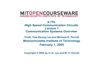 6.776 High Speed Communication Circuits Lecture 1 Communication Systems Overview Profs. Hae-Seung Lee and Michael H. Perrott Massachusetts Institute of Technology February 1, 2005 Copyright © 2005 by H.-S. Lee and M. H. Perrott Modulation Techniques Amplitude Modulation (AM) -Standard AM -Double-sideband (DSB) -Single-sideband (SSB) -Quadrature Amplitude Modulation (QAM) Constant Envelope Modulation -Phase Modulation (PM) -Frequency Modulation (FM) Multiple Access -FDMA -TDMA -CDMA Ultra Wide Band (UWB) -Pulse -OFDM H.-S. Lee & M.H. Perrott MIT OCW Amplitude Modulation (Transmitter) Vary the amplitude of a sine wave at carrier frequency fo according to a baseband modulation signal DC component of baseband modulation signal influences transmit signal and receiver possibilities - DC value greater than signal amplitude shown above Allows simple envelope detector for receiver Strong carrier frequency tone is transmitted(wasted power) H.-S. Lee & M.H. Perrott MIT OCW Frequency Domain View of Standard AM Transmitter Baseband signal x’(t) has a nonzero DC component Causes impulse to appear at DC in baseband signal - Transmitter output has an impulse at the carrier frequency - This component is fixed in frequency and phase, so carries no information (waste of transmit power) H.-S. Lee & M.H. Perrott MIT OCW Zero DC Value (DSB or ‘Suppressed Carrier’) Transmitter Output 0 x(t) y(t) 2cos(2πfot) Envelope of modulated sine wave no longer corresponds directly to the baseband signal - Envelope instead follows the absolute value of the - baseband waveform, negative value of the baseband input produces 180o phase shift in carrier Envelope detector can no longer be used for receiver The carrier frequency tone that carries no information is removed: less transmit power required for same transmitter SNR (compared to standard AM) H.-S. Lee & M.H. Perrott MIT OCW DSB Spectra Impulse in DC portion of baseband signal is now gone - Transmitter output now is now free from having an impulse at the carrier frequency: more power efficient H.-S. Lee & M.H. Perrott MIT OCW Accompanying Receiver (Coherent Detection) Works regardless of DC value of baseband signal Requires receiver local oscillator to be accurately aligned in phase and frequency to carrier H.-S. Lee & M.H. Perrott MIT OCW Frequency Domain View of DSB Receiver (Coherent) H.-S. Lee & M.H. Perrott MIT OCW Impact of Phase Misalignment in Receiver Local Oscillator Worst case is when receiver LO and carrier frequency are phase shifted 90 degrees with respect to each other - Desired baseband signal is not recovered H.-S. Lee & M.H. Perrott MIT OCW Impact of 90 Degree Phase Misalignment (Freq. Domain View) H.-S. Lee & M.H. Perrott MIT OCW SSB (Single-Sideband) The upper sideband (USB) and the lower sideband (LSB) are symmetric, so they contain the same information Standard AM is neither power efficient nor bandwidth efficient The DSB improves power efficiency, but still takes up twice the necessary bandwidth Most baseband signals have no DC or very low frequency components One of the sidebands can be removed at the IF or RF stage (much easier to filter in the IF stage) H.-S. Lee & M.H. Perrott MIT OCW SSB Spectra One of the sidebands is removed by sideband filter or phase shift techniues - Signal bandwidth is reduced 2x: more bandwidth efficient H.-S. Lee & M.H. Perrott MIT OCW Quadrature Modulation (QAM) Takes advantage of coherent receiver’s sensitivity to phase alignment with transmitter local oscillator - We essentially have two orthogonal transmission channels (I and Q) available - Transmit two independent baseband signals (I and Q) onto two sine waves in quadrature at transmitter H.-S. Lee & M.H. Perrott MIT OCW Accompanying Receiver Demodulate using two sine waves in quadrature at receiver - Must align receiver LO signals in frequency and phase to transmitter LO signals Proper alignment allows I and Q signals to be recovered as shown H.-S. Lee & M.H. Perrott MIT OCW Impact of 90 Degree Phase Misalignment I and Q channels are swapped at receiver if its LO signal is 90 degrees out of phase with transmitter - However, no information is lost! - Can use baseband signal processing to extract I/Q signals despite phase offset between transmitter and receiver H.-S. Lee & M.H. Perrott MIT OCW Simplified View For discussion to follow, assume that - Transmitter and receiver phases are aligned - Lowpass filters in receiver are ideal - Transmit and receive I/Q signals are the same except for scale factor In reality - RF channel adds distortion, causes fading - Signal processing in baseband DSP used to correct problems H.-S. Lee & M.H. Perrott MIT OCW Analog Modulation I/Q signals take on a continuous range of values (as viewed in the time domain) Used for AM/FM radios, television (non-HDTV), and the first cell phones Newer systems typically employ digital modulation instead H.-S. Lee & M.H. Perrott MIT OCW Digital Modulation I/Q signals take on discrete values at discrete time instants corresponding to digital data - Receiver samples I/Q channels Uses decision boundaries to evaluate value of data at each time instant I/Q signals may be binary or multi-bit - Multi-bit shown above H.-S. Lee & M.H. Perrott MIT OCW Advantages of Digital Modulation Allows information to be “packetized” - Can compress information in time and efficiently send as packets through network - In contrast, analog modulation requires connections that are continuously available Inefficient use of radio channel if there is “dead time” in information flow Allows error correction to be achieved Enables compression of information Supports a wide variety of information content - Less sensitivity to radio channel imperfections - More efficient use of channel - Voice, text and email messages, video can all be represented as digital bit streams H.-S. Lee & M.H. Perrott MIT OCW Constellation Diagram of Multi-bit Quadrature Digital Modulation (2-bit example) Amplitudes I and Q are encoded I