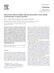 www.elsevier.com/locate/ynimg NeuroImage 32 (2006) 1771 – 1781 Interactions between auditory and dorsal premotor cortex during synchronization to musical rhythms Joyce L. Chen,a,* Robert J. Zatorre, a and Virginia B. Penhune b a b Montreal Neurological Institute, McGill University, Rm. 276, 3801 University St., Montreal, QC, Canada H3A 2B4 Concordia University, Dept. of Psychology, 7141 Sherbrooke St. W., Montreal, QC, Canada H4B 1R6 Received 17 March 2006; revised 18 April 2006; accepted 21 April 2006 Available online 14 June 2006 When listening to music, we often spontaneously synchronize our body movements to a rhythm’s beat (e.g. tapping our feet). The goals of this study were to determine how features of a rhythm such as metric structure, can facilitate motor responses, and to elucidate the neural correlates of these auditory – motor interactions using fMRI. Five variants of an isochronous rhythm were created by increasing the contrast in sound amplitude between accented and unaccented tones, progressively highlighting the rhythm’s metric structure. Subjects tapped in synchrony to these rhythms, and as metric saliency increased across the five levels, louder tones evoked longer tap durations with concomitant increases in the BOLD response at auditory and dorsal premotor cortices. The functional connectivity between these regions was also modulated by the stimulus manipulation. These results show that metric organization, as manipulated via intensity accentuation, modulates motor behavior and neural responses in auditory and dorsal premotor cortex. Auditory – motor interactions may take place at these regions with the dorsal premotor cortex interfacing sensory cues with temporally organized movement. D 2006 Published by Elsevier Inc. Keywords: Finger tapping; Motor timing; Temporal; Sensorimotor; Premotor cortex; Auditory cortex; fMRI Introduction Music can be a potent catalyst in stimulating timely movements. This phenomenon is commonly observed when we tap our feet or nod our heads to the beat of music. The ability to synchronize body movements to both familiar and novel music often occurs spontaneously and intuitively, even for those with no musical training (Drake et al., 2000; Large et al., 2002; Snyder and Krumhansl, 2001). More specifically, the phenomenon of tapping to the beat appears to be unique to auditory – motor interactions; visual cues are not as effective in facilitating accurate movement * Corresponding author. Fax: +1 514 398 1338. E-mail address: joyce.chen@mail.mcgill.ca (J.L. Chen). Available online on ScienceDirect (www.sciencedirect.com). 1053-8119/$ - see front matter D 2006 Published by Elsevier Inc. doi:10.1016/j.neuroimage.2006.04.207 (Patel et al., 2005; Repp and Penel, 2004). Furthermore, the important role of auditory cues in influencing timed behavior is illustrated by studies involving subjects with movement disorders such as Parkinson’s disease and stroke. Walking ability, as indexed by the speed and co-ordination of gait, and upper extremity arm function improve with training using auditory cues, as compared to rehabilitation protocols without auditory facilitation (McIntosh et al., 1997; Thaut et al., 1997; Whitall et al., 2000). These data lend support to the hypothesis that rhythmic auditory cues can influence motor behavior; however, little is known about the basic rhythmic features and neural mechanisms underlying this phenomenon. Thus, the purpose of this study is to examine specific rhythmic features that drive auditory – motor interactions, and to elucidate the neural basis of this behavior. When we tap, dance, or march along with music, we are usually moving in time with the beat. A beat is the basic unit of measure indicating musical time, and is a perceived pulse inferred from a rhythm that occurs in equal temporal units (Lerdahl and Jackendoff, 1983). The regular occurrence of alternating strong and weak beats can be grouped together to form the percept of a meter (e.g. waltz or march time) (Handel, 1989). Meter can help organize a rhythm by parsing it into equal subdivisions or ‘‘measures’’ of temporal duration (Palmer and Krumhansl, 1990). Within a meter, a hierarchy of multiple beat levels can also be perceived (Drake et al., 2000; Parncutt, 1994) but the most perceptually salient level of beat sensation, the tactus, is the level at which most people choose to tap to the beat (Parncutt, 1994). We propose that perception of the metric structure and tactus facilitates movement synchronization to a rhythm and thus auditory – motor interactions. Behavioral studies have suggested that there are several features of a rhythm that can contribute to metric and beat saliency. Melodic cues such as pitch can highlight important events in a rhythm, though not as effectively as a rhythm’s temporal structure (Hannon et al., 2004; Pfordresher, 2003; Snyder and Krumhansl, 2001). Temporal structure, defined by the pattern of time intervals between notes, is an important feature that aids detection of the tactus by organizing musical events into equal time units (Essens and Povel, 1985; Povel, 1984; Povel and Essens, 1985). The ability to perceive the tactus 1772 J.L. Chen et al. / NeuroImage 32 (2006) 1771 – 1781 from a musical rhythm is also aided by the fact that it is a regularly occurring cue. Such predictability can create an expectation for the likelihood of future temporal events even if the actual stimulus ceases (Cooper and Meyer, 1960; Large and Jones, 1999; Parncutt, 1994). Therefore, the recurring pattern of temporal expectations aids in solidifying the percept of meter and allows a listener to accurately anticipate and tap to the beat. While pitch, temporal structure, and predictability are useful cues that highlight the meter and tactus, in this study we are interested in how a rhythm’s accent structure can be an effective cue in facilitating movement synchronization. An accent is a point of beat intensific