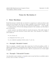 6.042/18.062J Mathematics for Computer Science Tom Leighton, Marten van Dijk September 17, 2010 Notes for Recitation 3 State Machines 1 Recall from Lecture 3 (9/16) that an invariant is a property of a system (in lecture, that system was the 8-puzzle) that does not change, regardless of the system’s behavior. Now we’ll take a look at how we can make use of an important modeling tool — a state machine — to analyze systems. We’ll see that finding invariants of state machines can often help us prove propositions. A state machine is an abstract model of a step-by-step process. The model consists of a collection of states and transitions between those states. More formally, we can define a state machine as � a set of states: Q � a designated start state: q0 ∈ Q � a set of allowed transitions between states: δ ⊆ Q × Q. 1.1 Example: Bounded Counter Take, for example, a bounded counter that counts from 0 to 99 and overflows at 100. A diagram representing the corresponding state machine was shown in recitation. Note that in this example, there is a finite number of states. However, in general, the set of states might be infinite. 1.2 Example: Unbounded Counter An unbounded counter is similar to a bounded counter except that there is an infinite number of states and no overflow. See Figure 2. Recitation 3 2 Figure 1: State machine for the unbounded counter 2 Problem: Breaking a chocolate bar We are given a chocolate bar with m × n squares of chocolate, and our task is to divide it into mn individual squares. We are only allowed to split one piece of chocolate at a time using a vertical or a horizontal break. For example, suppose that the chocolate bar is 2 × 2. The first split makes two pieces, both 2 × 1. Each of these pieces requires one more split to form single squares. This gives a total of three splits. Prove that the number of times you split the bar does not depend on the sequence of splits you make. Solution. As with the “stacking game” from class, we approach the problem with exper­ imentation, strong induction and a strong hypothesis. First we guess what the number of splits needed is: Theorem. To divide up a chocolate bar with m × n squares, we need at most mn − 1 splits. This theorem does not immediately lend itself to an induction or strong induction proof, since there are two variables. In general, propositions involving several natural-valued variables can often be proved by using a sort of nested induction (make sure to try that). However, in this case, we can get by with a single-variable induction and a trick. Intuitively, to break up a big chocolate bar, we need one split to make two pieces, and then we can break up the two pieces recursively. This suggests a proof using strong induction on the size of the chocolate bar, where size is measured in chocolate squares. Now instead of a problem involving two variables (the two dimensions), we have a problem in one variable (the size). With this simplification, we can prove the theorem using strong induction. Proof. The proof is by strong induction on the size of the chocolate bar. Let P (k) be the proposition that a chocolate bar of size k requires at most k − 1 splits. Base case, k = 1: P (1) is true because there is only a single square of chocolate, and 1−1 = 0 splits are required. Recitation 3 3 Induction step: We suppose k ≥ 1 and any chocolate bar of size s, where 1 ≤ s ≤ k, requires at most s − 1 splits. We must now show there is a way to split a chocolate bar of size k + 1 with at most k splits. To do this, first break the chocolate bar of size k + 1 into two smaller pieces of size p and q where p + q = k + 1. This is certainly possible because the size of the bar is at least two. Now the pieces of sizes p and q are between one and k, so by strong induction, breaking these two pieces into single squares requires only p − 1 and q − 1 splits, respectively. The total number of splits required to break the bar of size k + 1 into single squares is therefore at most 1 + (p − 1) + (q − 1) = p + q − 1 = (k + 1) − 1 = k. This shows that P (k) implies P (k + 1), and the claim is proved by strong induction. � Recitation 3 3 4 Problem: The Temple of Forever Each monk entering the Temple of Forever is given a bowl with 15 red beads and 12 green beads. Each time the Gong of Time rings, a monk must do one of two things: 1. Exchange: If he has at least 3 red beads in his bowl, then he may exchange 3 red beads for 2 green beads. 2. Swap: He may replace each green bead in his bowl with a red bead and replace each red bead in his bowl with a green bead. That is, if he starts with i red beads and j green beads, then after he performs this operation, he will have j red beads and i green beads. A monk may leave the Temple of Forever only when he has exactly 5 red beads and 5 green beads in his bowl. Let’s look at how we can represent this problem as a state machine. � What do the states of the machine look like? Solution. We can use variables such as r to represent the number of red beads and g to represent the number of green beads. Then the states can be represented as pairs (r, g) for r ≥ 0, g ≥ 0. � � Use the notation you developed above to represent the allowable transitions in the state machine. Solution. There are two possible transitions: 1. trade 3 red for 2 green (exchange): (r, g) → (r − 3, g + 2), r ≥ 3 2. swap red and green (swap): (r, g) → (g, r) � � Expand the state machine diagram to the first three or four levels. Label the transitions according to the operation type (E for exchange or S for swap). Solution. You can see the diagram in Figure 3. � Recitation 3 5 Figure 2: State machine diagram for first few levels Recitation 3 3.1 6 Invariants and State Machines The Temple of Forever machine models every possible way of exchanging beads at each time step according to the rules. We would like to know whether the machine ever reaches the state (5, 5