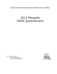 Global School-based Student Health Survey (GSHS) 2013 Mongolia GSHS Questionnaire For more information: www.cdc.gov/gshs or www.who.int/chp/gshs/en/ 2013 MONGOLIA GLOBAL SCHOOL-BASED STUDENT HEALTH SURVEY This survey is about your health and the things you do that may affect your health. Students like you all over your country are doing this survey. Students in many other countries around the world also are doing this survey. The information you give will be used to develop better health programs for young people like yourself. DO NOT write your name on this survey or the answer sheet. The answers you give will be kept private. No one will know how you answer. Answer the questions based on what you really know or do. There are no right or wrong answers. Completing the survey is voluntary. Your grade or mark in this class will not be affected whether or not you answer the questions. If you do not want to answer a question, just leave it blank. Make sure to read every question. Fill in the circles on your answer sheet that match your answer. Use only the pencil you are given. When you are done, do what the person who is giving you the survey says to do. Here is an example of how to fill in the circles: Fill in the circles like this Not like this or Survey 1. Do fish live in water? A. Yes B. No Answer sheet 1. A B C D E F G H Thank you very much for your help. Mongolia GSHS Questionnaire - 2013 For more information: www.cdc.gov/gshs or www.who.int/chp/gshs/en/ Last Updated: May 24, 2013 2 1. How old are you? The next 7 questions ask about your height, weight, eating breakfast, and going hungry. A. 11 years old or younger B. 12 years old 6. How tall are you without your shoes on? ON C. 13 years old THE ANSWER SHEET, WRITE YOUR HEIGHT D. 14 years old IN THE SHADED BOXES AT THE TOP OF THE E. 15 years old GRID. THEN FILL IN THE OVAL BELOW EACH F. 16 years old NUMBER. G. 17 years old Example H. 18 years old or older Height (cm) 2. What is your sex? 1 0 A. Male B. Female 2 3. In what grade are you? 5 0 1 1 2 2 3 4 A. 3 0 th 7 grade 4 5 th B. 8 grade C. th 9 grade 6 6 7 7 8 8 9 9 D. 10th grade E. 11th grade F. th 12 grade 9 4. I do not know Where do you live now? A. Central of city B. Rural of city C. Aimag center D. Soum center E. 5. Rural bag What is your living condition now? A. Ger in the khashaa B. Building in the khashaa C. Dormitory D. Apartment E. House F. Some other place Mongolia GSHS Questionnaire - 2013 For more information: www.cdc.gov/gshs or www.who.int/chp/gshs/en/ Last Updated: May 24, 2013 1 7. How much do you weigh without your shoes on? ON THE ANSWER SHEET, WRITE YOUR 10. What is the main reason you do not eat breakfast? WEIGHT IN THE SHADED BOXES AT THE TOP OF THE GRID. THEN FILL IN THE OVAL A. I always eat breakfast BELOW EACH NUMBER. B. I do not have time for breakfast C. I cannot eat early in the morning Example D. There is not always food in my home Weight (kg) E. 0 5 Some other reason 2 0 0 1 1 1 2 2 11. During the past 30 days, how often did you go hungry because there was not enough food in your home? 3 3 A. Never 4 4 B. Rarely 5 C. Sometimes 6 6 D. Most of the time 7 7 E. 8 8 9 9 Always 12. During this school year, were you taught in any of your classes the benefits of healthy eating? 9 8. I do not know How do you describe your weight? A. Yes B. No C. I do not know A. Very underweight The next 5 questions ask about what you might B. Slightly underweight eat and drink. C. About the right weight D. Slightly overweight E. Very overweight 13. During the past 30 days, how many times per day did you usually eat fruit, such as apples, grapefruit, bananas, or kiwi? 9. During the past 30 days, how often did you eat breakfast? A. I did not eat fruit during the past 30 days B. Less than one time per day A. Never C. 1 time per day B. Rarely D. 2 times per day C. Sometimes E. 3 times per day D. Most of the time F. 4 times per day E. G. 5 or more times per day Always Mongolia GSHS Questionnaire - 2013 For more information: www.cdc.gov/gshs or www.who.int/chp/gshs/en/ Last Updated: May 24, 2013 2 14. During the past 30 days, how many times per day 17. During the past 7 days, on how many days did did you usually eat vegetables, such as carrots, you eat food from a fast food restaurant, such as cabbage, or green vegetables? pizza or burger places? A. I did not eat vegetables during the past 30 A. 0 days days B. 1 day B. Less than one time per day C. 2 days C. 1 time per day D. 3 days D. 2 times per day E. 4 days E. 3 times per day F. 5 days F. 4 times per day G. 6 days G. 5 or more times per day 15. During the past 30 days, how many times per day did you usually drink carbonated soft drinks, H. 7 days The next 6 questions ask about cleaning your teeth and washing your hands. such as Coca, Pepsi Cola, or National Tereij? (Do not include diet soft drinks.) 18. During the past 30 days, how many times per day did you usually clean or brush your teeth? A. I did not drink carbonated soft drinks during A. I did not clean or brush my teeth during the C. 1 time per day B. Less than 1 time per day D. 2 times per day C. 1 time per day E. 3 times per day D. 2 times per day F. 4 times per day E. 3 times per day F. 4 or more times per day the past 30 days B. past 30 days Less than one time per day G. 5 or more times per day 16. During the past 30 days, how many times per day did you usually drink milk or eat milk products, 19. During the past 30 days, how often did you wash your hands before eating? such as milk, yogurt, cheese, or sieved milk? A. Never Rarely A. I did not drink milk or eat milk products B. during the past 30 days C. Sometimes B. Less than one time per day D. Most of the time E. Always C. 1 time per day D. 2 times per day E. 3 times per day F. 4 times per day G. 5 or more times per day Mongolia GSHS Questionnaire - 2013 For more information: www.cdc.gov/gshs or www.who.int/chp/gshs/en/ Last Updated: May 24, 2013 3 20. During the past 30 days, how often did you wash your hands before