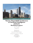 Twenty-Third AAAI Conference on Artificial Intelligence (AAAI-07) Workshop Program July 13–14, 2008 Chicago, Illinois Sponsored by the Association for the Advancement of Artificial Intelligence 445 Burgess Drive, Menlo Park, CA 94025-3442 650-328-3123 650-321-4457 (fax) workshops08@aaai.org www.aaai.org AAAI Workshop Chairs Deadlines ■ ■ ■ ■ April 7: Submissions due April 21: Notification of acceptance May 12: Camera-ready copy due to organizers and AAAI July 13–14: AAAI-07 Workshop Program AAAI Formatting Guidelines ■ Simon Parsons Brooklyn College, City University of New York parsons@sci.brooklyn.cuny.edu Meinolf Sellman Brown University sello@cs.brown.edu www.aaai.org/Publications/Author/author.php Contents ■ W1: Advancements in POMDP Solvers AAAI is pleased to present the AAAI-08 Workshop program. Workshops will be held Sunday and Monday, July 13–14, 2008 at the Hyatt Regency McCormick Place in Chicago. Exact locations and dates for the workshops will be determined in the spring. The AAAI-08 workshop program includes 15 workshops covering a wide range of topics in artificial intelligence. Workshops are one day unless noted otherwise in the individual description. Each workshop is limited to approximately 25 to 65 participants. Participation at these workshops is by invitation from the workshop organizers. There is a separate fee for attendance at a workshop. Workshop registration is discounted for AAAI-08 technical registrants. Registration information will be mailed directly to all invited participants. All workshop participants must preregister, and must indicate which workshop(s) they will be attending. Workshop reports are included in the workshop registration fee, and will be distributed onsite during the workshop. In most cases, reports will also be available after the conference as part of the AAAI Press technical report series. Submission Requirements Submission requirements vary for each workshop, but most key deadlines are uniform, unless otherwise noted. Submissions are due to the organizers on April 7, 2008, except where noted. Workshop organizers will notify submitters of acceptance by April 21, 2008. Camera-ready copy is due back to workshop organizers by May 5, 2008 (working notes) and to AAAI by May 12, 2008. Please mail your submissions directly to the chair of the individual workshop according to their directions. Do not mail submissions to AAAI. For further information about a workshop, please contact the chair of that workshop. Format AAAI two-column format is required for all final accepted submissions. Links to styles, macros, and guidelines for this format are located on the AAAI publications site. 2 AAAI-07 WORKSHOPS ■ W2: AI Education Workshop ■ W3: Coordination, Organization, Institutions and Norms in Agent Systems ■ W4: Enhanced Messaging ■ W5: Human Implications of Human-Robot Interaction ■ W6: Intelligent Techniques for Web Personalization and Recommender Systems ■ W7: Metareasoning: Thinking about Thinking ■ W8: Mobile Robot Workshop ■ W9: Fourth Multidisciplinary Workshop on Advances in Preference Handling ■ W10: Search in Artificial Intelligence and Robotics ■ W11: Spatial and Temporal Reasoning ■ W12: Trading Agent Design and Analysis ■ W13: Transfer Learning for Complex Tasks ■ W14: What Went Wrong and Why: Lessons from AI Research and Applications ■ W15: Wikipedia and Artificial Intelligence: An Evolving Synergy 1. Point based algorithms — Introduction to point-based algorithms, including the basic operations, and overview of state of the art algorithms. 2, Compression and efficient representation — various techniques for compressing POMDPs and representing factored POMDPs. 3. Online belief space search — survey of algorithms and advancements in online belief space search. 4. Policy iteration algorithms — using techniques such as finite state controllers to efficiently learn policies directly, without computing a value function. Organizing Committee Joelle Pineau, McGill University (jpineau@cs.mcgill.ca); Pascal Poupart, University of Waterloo (ppoupart@ cs.uwaterloo.ca); Guy Shani, Microsoft Research (guyshani@microsoft.com, 425-705-1561); Trey Smith, Carnegie Mellon University West / NASA Ames Research Center (trey.smith@west.cmu.edu) Additional Information For additional information, please visit the supplemental workshop site (research.microsoft.com/~guyshani/ AAAIWorkshop/Main.html). Advancements in POMDP Solvers O ver the past decade, much advancement was achieved in the field of POMDP solvers. The size of POMDPs that solvers can handle has increased by orders of magnitude.Solvers developed ten years ago were hardly able to handle more than 10 states, while modern solvers scale up to models with millions of states. New techniques compute approximate policies of manageable complexity, thus handling larger and more complicated POMDPs. This advancement was achieved by a few orthogonal approaches — point-based techniques, finite-state controllers, efficient model representations, model compression techniques, hierarchical decompositions, inference-based techniques, and online search. This workshop is designed to bring together researchers working on POMDP solvers, as well as those with complimentary interests. A main objective is to identify remaining barriers preventing full-scale POMDP deployment, as well as key scientific opportunities. The workshop is also intended to introduce new people to the current advancements in POMDP solvers. The workshop will begin with a set of short tutorials over various advancements in POMDP solvers: The workshop will continue by a set of short presentations of work in the field of POMDP solvers. Accepted papers will have 15 minutes for presentation of the main contributions. We will then follow up by a poster presentation of all accepted papers that will allow for an extended discussion with the authors of the papers. Submissions We invite researchers in the