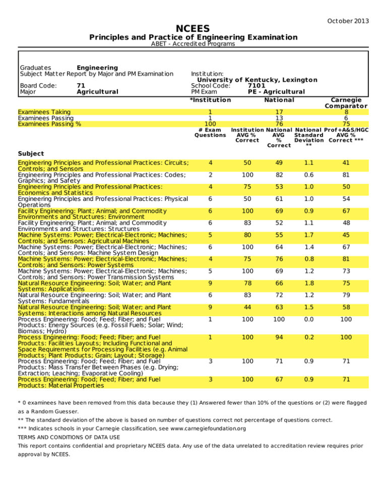 Oct ober 2013 NCEES Principles and Pract ice of Engineering Examinat ion ABET - Accredit ed Programs Graduat es Engineering Subject Mat t er Report by Major and PM Examinat ion Board Code: Major 71 Agricultural Examinees Taking Examinees Passing Examinees Passing % Subject Engineering Principles and Professional Pract ices: Circuit s; Cont rols; and Sensors Engineering Principles and Professional Pract ices: Codes; Graphics; and Safet y Engineering Principles and Professional Pract ices: Economics and St at ist ics Engineering Principles and Professional Pract ices: Physical Operat ions Facilit y Engineering: Plant ; Animal; and Commodit y Environment s and St ruct ures: Environment Facilit y Engineering: Plant ; Animal; and Commodit y Environment s and St ruct ures: St ruct ures Machine Syst ems: Power; Elect rical-Elect ronic; Machines; Cont rols; and Sensors: Agricult ural Machines Machine Syst ems: Power; Elect rical-Elect ronic; Machines; Cont rols; and Sensors: Machine Syst em Design Machine Syst ems: Power; Elect rical-Elect ronic; Machines; Cont rols; and Sensors: Power Syst ems Machine Syst ems: Power; Elect rical-Elect ronic; Machines; Cont rols; and Sensors: Power Transmission Syst ems Nat ural Resource Engineering: Soil; Wat er; and Plant Syst ems: Applicat ions Nat ural Resource Engineering: Soil; Wat er; and Plant Syst ems: Fundament als Nat ural Resource Engineering: Soil; Wat er; and Plant Syst ems: Int eract ions among Nat ural Resources Process Engineering: Food; Feed; Fiber; and Fuel Product s: Energy Sources (e.g. Fossil Fuels; Solar; Wind; Biomass; Hydro) Process Engineering: Food; Feed; Fiber; and Fuel Product s: Facilit ies Layout s; Including Funct ional and Space Requirement s for Processing Facilit ies (e.g. Animal Product s; Plant Product s; Grain; Layout ; St orage) Process Engineering: Food; Feed; Fiber; and Fuel Product s: Mass Transfer Bet ween Phases (e.g. Drying; Ext ract ion; Leaching; Evaporat ive Cooling) Process Engineering: Food; Feed; Fiber; and Fuel Product s: Mat erial Propert ies Inst it ut ion: University o f Kentucky, Lexingto n School Code: 7101 PM Exam PE - Agricultural *Institutio n Natio nal 1 1 100 17 13 76 Carnegie Co mparato r 8 6 75 # Exam Inst it ut ion Nat ional Nat ional Prof +A&S/HGC Quest ions AVG % AVG St andard AVG % Correct % Deviat ion Correct *** Correct ** 4 50 49 1.1 41 2 100 82 0.6 81 4 75 53 1.0 50 6 50 61 1.0 54 6 100 69 0.9 67 6 83 52 1.1 48 5 80 55 1.7 45 6 100 64 1.4 67 4 75 76 0.8 81 5 100 69 1.2 73 9 78 66 1.8 75 6 83 72 1.2 79 9 44 63 1.5 58 1 100 100 0.0 100 1 100 94 0.2 100 3 100 71 0.9 71 3 100 67 0.9 71 * 0 examinees have been removed from this data because they (1) Answered fewer than 10% of the questions or (2) were flagged as a Random Guesser. ** The standard deviation of the above is based on number of questions correct not percentage of questions correct. *** Indicates schools in your Carnegie classification, see www.carnegiefoundation.org TERMS AND CONDITIONS OF DATA USE This report contains confidential and proprietary NCEES data. Any use of the data unrelated to accreditation review requires prior approval by NCEES. Oct ober 2013 NCEES Principles and Pract ice of Engineering Examinat ion ABET - Accredit ed Programs Graduat es Engineering Subject Mat t er Report by Major and PM Examinat ion Board Code: Major 71 Civil Examinees Taking Examinees Passing Examinees Passing % AM Subject Const ruct ion Geot echnical St ruct ural Transport at ion Wat er Resources & Environment al PM Subject Eart hwork Const ruct ion & Layout Est imat ing Quant it ies & Cost s Const ruct ion Operat ions & Met hods Scheduling Mat erial Qualit y Cont rol & Product ion Temporary St ruct ures Worker - Healt h & Safet y & Environment Ot her Topics *Institutio n 8 4 50 Inst it ut ion: University o f Kentucky, Lexingto n School Code: 7101 PM Exam PE - Civil - Co nstructio n Natio nal Carnegie Co mparato r 730 194 297 95 41 49 # Exam Inst it ut ion Nat ional AVG Nat ional Quest ions AVG % % Correct St andard Correct Deviat ion ** Prof +A&S/HGC AVG % Correct *** 8 8 8 8 8 84 63 77 70 69 73 62 77 65 63 1.5 1.6 1.5 1.7 1.7 77 63 78 68 66 4 7 6 7 4 5 3 44 79 54 77 59 40 67 50 66 51 76 48 48 65 1.1 1.4 1.3 1.3 0.9 1.3 0.7 50 71 54 78 52 51 68 4 53 55 1.0 60 * 0 examinees have been removed from this data because they (1) Answered fewer than 10% of the questions or (2) were flagged as a Random Guesser. ** The standard deviation of the above is based on number of questions correct not percentage of questions correct. *** Indicates schools in your Carnegie classification, see www.carnegiefoundation.org TERMS AND CONDITIONS OF DATA USE This report contains confidential and proprietary NCEES data. Any use of the data unrelated to accreditation review requires prior approval by NCEES. Oct ober 2013 NCEES Principles and Pract ice of Engineering Examinat ion ABET - Accredit ed Programs Graduat es Engineering Subject Mat t er Report by Major and PM Examinat ion Board Code: Major 71 Civil Examinees Taking Examinees Passing Examinees Passing % Inst it ut ion: University o f Kentucky, Lexingto n School Code: 7101 PM Exam PE - Civil - Geo technical *Institutio n Natio nal Carnegie Co mparato r 2 350 81 1 200 46 50 57 57 # Exam Inst it ut ion Nat ional Nat ional Quest ions AVG % AVG St andard Correct % Correct Deviat ion ** Prof +A&S/HGC AVG % Correct *** AM Subject Const ruct ion Geot echnical St ruct ural Transport at ion Wat er Resources & Environment al PM Subject Subsurface Explorat ion & Sampling Engineering Propert ies of Soils & Mat erials Soil Mechanics Analysis Eart hquake Engineering Eart h St ruct ures Shallow Foundat ions Eart h Ret aining St ruct ures Including Temporary St ruct ures Deep Foundat ions Ot her Topics 8 8 8 8 8 69 69 50 44 75 71 74 80 69 64 1.6 1.5 1.5 1.7 1.8 73 75 79 71 66 3 5 5 2 4 6 7 100 50 60 100 63 75 71 71 66 61 81 55 74 63 0.8 1.1 1.4 0.6 1.0 1.4 1.5 73 63 65 81 58 73 63 4 4 25 63 47 54 1.1 1.0 50 54 * 0 examinees have b