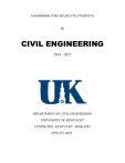 HANDBOOK FOR GRADUATE STUDENTS IN CIVIL ENGINEERING 2014 - 2015 DEPARTMENT OF CIVIL ENGINEERING UNIVERSITY OF KENTUCKY LEXINGTON, KENTUCKY 40506-0281 (859) 257-4858 Table of Contents Page FORWORD 1 SECTION I - GENERAL PROCEDURES 1. Classification of Students a. Post-Baccalaureate Students b. Degree Students - Conditional Admission c. Degree Students - University Scholar Program d. Degree Students - Regular Students 2. Admission Requirements for Degree Students 3. Activities Prior to Admission a. Information on Available Programs b. Graduate Record Examination c. Test of English as a Foreign Language d. Application for Admission e. Non-CE Background f. ABET/EAC Professional Component g. Application for Financial Aid 4. Activities Following Admission but before Beginning of Class Work a. Assignment of a Faculty Advisor b. Program Planning c. Classification and Registration d. Office Space 5. Activities after Enrollment a. Proposed Program b. Priority Registration c. Current Student Information d. Readmission e. Incomplete Grades f. Repeat Option g. Scholastic Probation h. Admission to Candidacy i. Application for Degree j. Time Limits for Degrees 6. Course Load a. Regular Semester b. Summer Term 7. Program and Course Offerings a. Civil Engineering Specialties Available in the Graduate Program b. Course Descriptions of Graduate Courses offered in the Department 2 2 2 2 2 2 3 3 3 3 4 4 4 5 5 6 6 6 6 6 6 6 6 6 6 7 7 7 7 7 7 7 7 8 8 8 8 c. Faculty Members and their Specialties d. Core Courses 8. Course Scheduling a. Courses Offered Every Semester b. Courses Offered Every Fall Semester c. Courses Offered in Fall Semester of Odd Year d. Courses Offered in Fall Semester of Even Year e. Courses Offered in Every Spring Semester f. Courses Offered in Spring Semester of Odd Year g. Courses Offered in Spring Semester of Even Year h. Courses Offered Periodically i. Courses Offered Every Third Semester 9. Graduate School Fellowships a. CSX, Durr, Garver, Nichols, Raymond-Terrell, Vaughn-Melton, Walker, Harp Fellowships b. Presidential Fellowships c. Open Competition Academic Year Fellowships d. Lyman T. Johnson Minority Fellowships e. Otis A. Singletary and W. L. Matthews, Jr. Fellowships f. Dissertation Year Fellowships g. Other Fellowships 10. Special Fellowships and Scholarships a. Advanced Institute for Transportation Systems Science Fellowship b. Environmental Protection Scholarship 15 16 17 17 17 18 18 18 18 18 18 19 19 SECTION II - MASTERS PROGRAMS 1. Program Options a. MSCE Program Plan A (24 Hour Plus Thesis Option) b. MSCE Program Plan B (30 Hour Non-Thesis Option) c. University Scholars Combined BS-MS Program 2. Residence Requirements a. On-Campus Residence b. Transfer of Credits c. Correspondence Work 3. Course Requirements a. Program Approval b. Deficiencies c. Requirements by Course Numbering d. Requirements for CE Area e. Grades f. Transfer from Other Graduate Degree Programs 20 20 20 21 22 22 22 22 23 23 23 23 23 23 23 24 19 19 19 19 19 20 20 20 20 20 4. Thesis Requirements 5. Independent Work Courses - CE 790 and CE 791 6. Final Examination a. For the 24 Hour Plus Thesis MSCE Option (Plan A) b. For the 30 Hour Non-Thesis MSCE Option (Plan B) 7. Graduation Fees 8. Concurrent Degree Programs 9. Certificate Programs 24 24 24 25 25 25 25 26 SECTION III - THE DOCTOR OF PHILOSOPHY (Ph.D.) PROGRAM 1. Course Requirements 2. Major Professor 3. Advisory Committee 4. Change in Membership of Advisory Committee a. Changes in Student Interest or Emphasis b. Faculty Resignations from Committee c. Faculty Turnover and Leave 5. Language Requirements 6. Qualifying Examination 7. Residence Requirement a. Pre-Qualifying Examination b. Post Qualifying Examination 8. The Dissertation 9. Graduation Fees 10. Final Examination a. Composition of Committee b. Scheduling of Examination c. Procedure 11. Submission of Dissertation 26 26 26 26 26 27 27 27 27 27 27 27 28 28 28 28 28 28 29 29 SECTION IV - GUIDELINES FOR ASSISTANTSHIPS l. Terminology 2. Responsibilities 3. Period of Appointment a. Assistantships (TA, RA) b. Absences 4. Service Load a. Teaching Assistants (TA) and Research Assistants (RA) b. Service Load for TA/RA 5. Selection and Appointment of TA, RA a. Application for Assistantships b. Appointment Criteria 29 29 29 30 30 30 30 30 30 32 32 32 6. Renewal and Termination of Appointments a. Renewal of Appointment for Graduate and Research Assistants b. Maximum Periods of Appointment c. Renewal of Assistantships 7. Multiple Sources of Financial Aid/Employment 8. Parking Privileges 9. Holidays, Vacations, and Sick Leave 10. University Health Service and Student Health Insurance 32 32 32 32 33 33 33 33 SECTION V – HELPFUL TIPS 33 APPENDIX - A – CE Graduate Programs: Learning Outcomes (MSCE/PhD) 35 APPENDIX - B - Financial Support Application 37 APPENDIX - C – CE Independent Graduate Work Initiation Form 39 FORWARD This handbook is intended to acquaint prospective, new, and continuing graduate students with the opportunities and requirements for graduate study and graduate degrees in the Department of Civil Engineering at the University of Kentucky. This handbook supplements the Graduate School Bulletin and the general University Catalog, with which students should also become familiar. For additional information, or explanation of matters that may remain unclear, please contact the Director of Graduate Studies, Department of Civil Engineering, University of Kentucky, Lexington, KY 40506-0281. Phone: (859) 257-5937 or Email: ywang@uky.edu. All applications for graduate study at the University of Kentucky Graduate School must be submitted online. Detailed information can be found at http://www.gradschool.uky.edu/ and http://www.engr.uky.edu/ce/. January 14, 2014 Y. T. Wang, Ph.D., PE Professor and Director of Graduate Studies -1- SECTION I: GENERAL PROCEDURES 1. Classification of Students Currently, the Graduate School classifies students in one of two categories: Post-Baccalaureate Students, or Degree S
