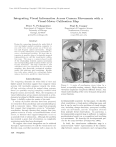 From: AAAI-96 Proceedings. Copyright © 1996, AAAI (www.aaai.org). All rights reserved. Integrating Visual Information Visual-Motor Across Camera Movements Calibration Map Peter N. Prokopowicz Paul R. Cooper Department of Computer Science University of Chicago Chicago, IL 60637 peterp@cs.uchicago.edu Department of Computer Science Northwestern University Evanston, IL 60201 cooper@ils.nwu.edu with a Abstract Facing the competing demands for wider field of view and higher spatial resolution, computer vision will evolve toward greater use of fovea1 sensors and frequent camera movements. Integration of visual information across movements becomes a fundamental problem. We show that integration is possible using a biologically-inspired representation we call the visual-motor calibration map. The map is a memory-based model of the relationship between camera movements and corresponding pixel locations before and after any movement. The map constitutes a selfcalibration that can compensate for non-uniform sampling, lens distortion, mechanical misalignments, and arbitrary pixel reordering. Integration takes place entirely in a retinotopic frame, using a short-term, predictive visual memory. Introduction The competing demands for wider field of view and higher spatial resolution suggest that computer vision systems will inevitably progress towards the tradeoff that evolution selected for animal vision systems: fovea1 (or spatially varying) sampling combined with frequent camera movements. Thus, the integration of visual information across camera movements is a fundamental prc$&n for lifelike computer vision systems. Figure 1 visually evokes the nature of the task. A variety of possible solutions have been proposed, by researchers from psychology and neurophysiology as well as computer vision. These range from proposals that suggest that integration occurs in “retinotopic” coordinates, through theories that propose that integration occurs in a body- or head-based frame of reference, to theories that suggest integration occurs at a symbolic level of abstraction. Although the problem has received a great deal of attention, no completely convincing model has been developed. We suggest that visual integration can be achieved through a representation we call the visual-motor calibration map, and that moreover such a map can be 1124 Perception Figure 1: A series of overlapping views taken by a fovea& or spatially-varying, camera. Slight changes in viewpoint emphasize completely different details. Any visual understanding of the scene demands integration across fixations. developmentally acquired. In this paper, we describe what constitutes a visual-motor calibration map, and how it can be used to solve problems of visual integration, including change detection, perceptual stability across eye movements, and the recognition of forms from multiple fovea1 observations. In particular, a developmentally-acquired map is sufficient to replicate psychophysical results on a recognition task involving eye movements. We describe the developmental process for the map elsewhere (Prokopowicz 1994). In brief, the visual-motor calibration map is a memory- based “table” represent at ion of the relationship between camera movements and corresponding pixel positions before and after a camera movement. Such a representation is neurobiologically plausible and scales-up to a realistically sized visual integration task. The map provides, in effect, a motor coordinate basis for visual information that allows visual tasks of extent larger than a single view to be computed. The map constitutes an adaptive visual-motor calibration that can compensate for effects including spatially-varying fovea1 sampling, trary (non-linear) be extraordinarily random pixel reordering, and arbilens distortions, all of which would difficult to model analytically. Visual Integration Calibration and Memory-based It has long been known that our vision is many times more acute in the center of view than outside it, and that, to see, we unconsciously move our eyes two or three times every second, accumulating the details around us (Yarbus 1967). In seeking the mechanisms by which our perception can nevertheless be stable, and relatively uniform, theorists early on appreciated that disrupting the normal relationship between an intended eye movement and the viewpoint that would follow throws off these mechanisms: the world seems Other experiments showed jumpy (Stratton 1897). that, over several weeks, this effect can wear off, sometimes completely, and later rebound when the disruption is removed. These experiments suggest that in normal seeing, we unconsciously account for the expected visual effects of eye movements, is a learned or adaptive ability. and that this Frames of reference in theories of perceptual One theory of perceptual integration integration holds that the stability and uniformity of perception corresponds to a stable and uniform internal visual representation, formulated in a head or body-centered 1985). Each succeeding frame of reference (Feldman fixation can be viewed as “painting” a different part of a larger inner image, one whose parts persist in memory long enough, perhaps a few seconds, to accumulate a detailed picture of the scene. This representation is invariant with respect to each eye movement, except that the immediate input is directed, or shifted, into the picture according to where the eyes currently point. This stable mental picture, consisting of pixels or some other primitive visual features, constitutes the effective input for the rest of perception, which goes on as if there were no small eye movements at all. Others suggest that eye movements are not accounted for at this early a stage of perception, but at a much higher level of abstraction, in terms of the geometric relation between concrete objects or components (Pollatsek, Rayner, & Collins 1984). When a nose is perceived, for example, a representati