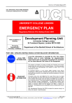 Bldg Name: 34 Tavistock Square (377) UCL ESTATES & FACILITIES DIVISION Construction Maintenance & Fire Safety UNIVERSITY COLLEGE LONDON EMERGENCY PLAN Regulatory Reform (Fire Safety) Order 2005 Name & Address of Building: Occupying Department(s) / School(s) / Institute(s): Development Planning Unit University College London 34 Tavistock Square, London WC1H 9EZ Department of the Bartlett School of Architecture PART ONE - SPECIFIC INSTRUCTIONS & OTHER RELEVANT INFORMATION: LOCAL FIRE INFORMATION Local fire information is provided by UCL Fire Action Notices (and in some buildings, by supplementary instructions) that are provided throughout the premises at Fire Alarm Manual Call Points & Fire Equipment. The property is situated in a terrace of similar mid Victorian town houses formed along the west side of the Tavistock Square. All of the properties in the terrace are semi-detached and belong to either UCL or the University of London. 34 Tavistock Square is a four storey 1850s Victorian Town House consisting of a lower ground / basement level, ground, first, second, third and fourth floors around a core single stair enclosure leading to a final exit to street level. RELEVANT INFORMATION Occupants using main stair (Stair A) from upper floors leave by single stair and discharge out of the main entrance on the ground floor to safety. In the unlikely event of the main stair being unavailable due to smoke or fire, a fire door at the 3rd floor level protects occupants on the forth floor to make alternative escape arrangements. An alternative escape route across the roof to an adjacent building and a holding point in comparative safety is provided, where the fire brigade can affect a rescue, as necessary. The basement has an alternative exit up to street level via the light well. UCL Development Planning Unit (DPU) occupies the premise using it as office and research / teaching space. _______________________________________________________________________________________________________________ Date Last Amended: Dec 10 EP: 1 of 6. Issued by: Fire Officer, Estates & Facilities, Gower Street, London WC1E 6BT / fire.officer@ucl.ac.uk / Tel: 020 - 7679 - 1240 Bldg Name: 34 Tavistock Square (377) PART TWO - SITE OR BUILDING SPECIFIC EVACUATION INSTRUCTIONS: ITEMS Escape Route th (4 Floor) SPECIFIC INFORMATION OF INSTRUCTION 1. FOURTH FLOOR ALTERNATIVE FIRE ESCAPE ROUTE (ROOM 405): (a). Occupants of the fourth floor should use the Main Single (Stair A) for all normal escape conditions and leave by the main entrance on the ground floor to safety. (b). In the unlikely event of the main stair being unavailable due to smoke or fire, a fire door at the 3rd floor level protects occupants on the 4th floor and allows them to leave the building by an alternative escape route over the roof of the adjoining buildings to a place where there is ‘comparative safety’ whilst awaiting rescue. (c). Room 405 - The escape route is through Room 405, the office door must remain Free From Fastenings (FFF) [e.g. Must Not Be Locked!]. This provides access at all material times to a set of steps that lead up to a window where occupants pass through the window, which is fitted with an Emergency Fastening (EF) [Key Not Required] and pass onto the external walkway. The external route is provided with duckboards, railings, emergency lighting and signage to identify the route north over the roofs until safely away from 34 Tavistock Sq. (d). This alternative escape route across the roof to adjacent buildings and a ‘holding point’ in comparative safety is proved, where the fire brigade can then effect a rescue, as necessary. (e). Training of All Relevant Staff - occupants of the upper floors (including the 3rd floor) shall be shown the escape route and be lead out onto the roof to ensure familiarisation on a regular basis, and recorded on their personal UCL fire safety training sheet (TN086). 2. MAIN ESCAPE FROM UPPER FLOORS & GROUND LEVELS Descend main stairs and exit via main entrance onto Tavistock Square 3. Main Escape Routes BASEMENT LEVEL The basement escape route is via stair (Stair A1) to the protected main entrance lobby at Ground Level and out to street level via the Main Entrance. There is no escape from the rear enclosed garden area but there is an alternative fire escape route via external front light well stair (Stair B) for the front Computer Cluster Room only FIRE ASSEMBLY POINT The Fire Assembly Point is located: TAVISTOCK SQUARE Extreme caution and awareness required by occupants of road traffic, when evacuating the premises. PART THREE - DISABILITY PROVISIONS RELATING TO CENTRALLY TIMETABLED SPACE: Centrally Timetabled Lecture Theatres & Seminar Rooms - Disable (Wheelchair) Emergency Egress Facilities / Arrangements Lecture Theatre / Seminar Room Locations Accessible / Egress None None1 1 Evacuation Arrangements Not Designated as Wheelchair Accessible None - No Disabled Access or Egress available, _______________________________________________________________________________________________________________ Date Last Amended: Dec 10 EP: 2 of 6. Issued by: Fire Officer, Estates & Facilities, Gower Street, London WC1E 6BT / fire.officer@ucl.ac.uk / Tel: 020 - 7679 - 1240 Bldg Name: 34 Tavistock Square (377) PART FOUR - DISABILITY PROVISIONS RELATING TO EMERGENCY DISABLED EVACUATION (CONT): ITEMS Where refuges are provided, they should be enclosed in a fireresisting structure, which creates a protected escape route leading directly to a place of safety and should only be used in conjunction with effective management rescue arrangements. DISABLED PROVISION WITHIN THE BUILDING DISABLED SIGNAGE: Fire safety and directional signage provided within the premises: NO * Remarks: No Disabled Facilities need at present DISABLED EVACUATION LIFTS: Complying with BS 5588 Part 8 are provided in this building: NO * Remarks: No Disabled Facilities need at present DEAF PEOPLE FIRE ALARM ALERTING FACILITIES: Vibrating Pager equip