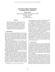 Proceedings of the Twenty-Second International Joint Conference on Artificial Intelligence Autonomous Object Manipulation: A Semantic-Driven Approach∗ Nicola Vitucci Dipartimento di Elettronica e Informazione (DEI) Politecnico di Milano Milano, Italy vitucci@elet.polimi.it Abstract in the reasoning process, may thus be used to bridge qualitative and quantitative reasoning in a unified framework. The problem of semantic part decomposition is still an open problem and, to the best of our knowledge, there are no tools available to automatically create a fuzzy ontology from raw data taken from an image. The use of fuzzy DLs for object recognition has been investigated in some works such as [Hudelot et al., 2008], in which little advantage is taken from the (partial) fuzzy extension and from the expressivity of the used logic (i.e., no cardinality restrictions are used); furthermore, a preliminary phase of semantic annotation of the images by domain experts has to be performed. Some recent works make a thorough use of fuzzy DLs to reason about multimedia information (e.g., [Simou et al., 2007]) but, again, little advantage is taken from the expressivity given by cardinality restrictions (when available). Generally speaking this is due to the fact that, for scene understanding purposes, it is sufficient to know whether an object is present or not, while, for object recognition purposes, it is often necessary to be able to count the number of similar instances of the same class. The problem of grasping is widely studied in the robotics community. This project focuses on the identification of object graspable features using images and object structural information. The primary aim is the creation of a framework in which the information gathered by the vision system can be integrated with automatically generated knowledge, modelled by means of fuzzy description logics. 1 Introduction Research on grasping and manipulation is nowadays focusing on how to make this task as autonomous as possible: recent advances in the fields of computer vision, knowledge engineering and neurophysiology show that a variety of techniques can be used to get closer to this goal. One of the major issues is given by the high dimensionality of the problem, as many variables occur both in the object recognition and in the grasp decision processes. Different data representations have been studied to deal with the grasping problem [Rubio et al., 2010; Huebner et al., 2009], the main aim being to find a suitable representation of object and grasp types, in order to reduce the complexity of the problem. Most of the proposed representations focus on the visual characteristics of the objects more than on their “conceptual” representations. In our project we are exploring a semantic representation of objects using a suitable description logic (DL) formalism, which should take into account the qualitative and quantitative characteristics that can be useful for grasping and manipulation tasks. The decomposition of an object into parts has been shown to be both close to the way human beings reason about objects [Biederman, 1987] and effective in reducing the complexity of computing tasks like object recognition (e.g., [Agarwal et al., 2004]). The semantic description of the parts composing an object and their mutual relationships is a difficult problem: apart from the problems related to the image analysis phase, the vagueness affecting real world data makes formal representation of an object structure quite inconvenient. Novel tools such as fuzzy DLs [Lukasiewicz and Straccia, 2008], which extend crisp DLs by adding imprecision and vagueness ∗ 2 Current work As shown in the previous section, the first problem arising in an autonomous manipulation task is given by object localization and recognition. The input image has to be segmented in a meaningful way, in order to distinguish each object from the background and from other objects; we are now focusing only on the shape of the objects (thus using synthetic models), as the first step is to make the system able to build its own representation of each object. The problems due to occlusions and cluttering have to be faced after some knowledge about the object to recognize has been gathered, so to use it for trying to solve ambiguities. The most delicate part of the process is given by the decomposition of an object in its composing parts, firstly as an image or mesh processing task. We are currently taking advantage of some concepts pertaining to the Gestalt theory and its application to computer vision [Desolneux et al., 2004], such as proximity, closure and similarity, which can be described in a formal and efficient way. Some studies in the field of developmental robotics have been performed on how to generalize such relations by using perceptual functions [Modayil and Kuipers, 2007], but this is at the moment out of our scope. Research project supervised by Prof. Giuseppina Gini. 2858 References The formalization is built on top of fuzzy DLs, which give a chance both to ground qualitative concepts as “close to” and “connected to” to quantitative real-world data and to define a degree of membership of an object to a certain class. The available tools (as the fuzzy reasoners FuzzyDL1 and FiRE2 ) are still under development, so there are several limitations to take into account in the formalization process. Fuzzy DLs are used to represent the structure of the objects, e.g., “a fork is composed of a long and thin part (the handle) and four short and thin parts (the tines)”, while the ontology of grasping types currently contains axioms like [Agarwal et al., 2004] Shivani Agarwal, Aatif Awan, Dan Roth, and IEEE Computer Society. Learning to detect objects in images via a sparse, part-based representation. IEEE Transactions on Pattern Analysis and Machine Intelligence, 26:2004, 2004. [Biederman, 1987] I. Biederman. Recognition-bycomponents: A theory of human image und