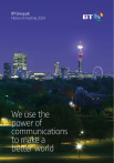 BT Group plc Notice of meeting 2014 We use the power of communications to make a better world Welcome to the BT Group plc Notice of meeting 2014 Our AGM will be held at Old Billingsgate, London on Wednesday 16 July 2014. This document is important and requires your immediate attention, so please read it straight away. If you have any doubts about what action you need to take, you should consult your authorised financial advisor. If you have sold or transferred all of your shares, you should pass this booklet and accompanying documents to the person through whom you sold or transferred them, to forward to the purchaser or transferee. Contents 1Our purpose Who we are and what we do 2 Chairman’s message 4 Board of Directors 6 Notice of meeting 12 AGM information Look out for… Further reading online Video content online In this document, references to ‘BT Group’, ‘BT’, ‘the group’, ‘the Company’, ‘we’ or ‘our’ are to BT Group plc (which includes the activities of British Telecommunications plc) and its subsidiaries and lines of business, its internal service unit, or any of them as the context may require. A reference to a year expressed as 2013/14 is to the financial year ended 31 March 2014 and a reference to a year expressed as 2014 is to the calendar year. This convention applies similarly to any reference to a previous or subsequent year. References to ‘this year’, ‘the year’ and ‘the current year’ are to the financial year ended 31 March 2014. References to ‘last year’ and ‘the prior year’ are to the financial year ended 31 March 2013. BT Group plc Notice of meeting 2014 1 Our purpose Our purpose is to use the power of communications to make a better world. By bringing together the best networks and technology with the expertise of our people, we make connections and create new possibilities. We use the power of communications to make a better world We are improving our business. Our people, technology and networks set us apart We make a major contribution to society, businesses and communities We have the financial strength to invest for the future while rewarding our stakeholders Who we are and what we do We are one of the world’s leading communications services companies In the UK we are delivering one of the fastest rollouts of fibre broadband in the world We provide managed networked IT services for many of the largest global companies We are the leading provider of voice and broadband services to UK SMEs and consumers Every day we touch the lives of millions of people, helping them communicate, do business and be entertained and informed We are Europe’s largest telecoms services wholesaler by revenue 2 6 BT Group plc Notice of meeting 2014 Chairman’s message Our mobility plans are progressing well and give us a real opportunity to expand the range of services we provide to customers. The investments we are making in our IT services capabilities will also make us more valuable to businesses in the UK. Sir Michael Rake Chairman “The investments we are making are delivering – for both BT and the UK”. This has been an important year for BT. Our investments are delivering and contributed to a strong set of results. Our investments We have continued to invest in the long-term health of our business. We have brought fibre broadband in reach of more than 19m UK premises – around two thirds of the country. Our rollout is well ahead of our original target and we are now rapidly expanding into rural areas as part of the Broadband Delivery UK (BDUK) programme. Thanks to our investment, the UK now has the widest coverage of high-speed broadband of the five largest countries in Western Europe. Average broadband speeds are almost 50% higher than they were a year ago. Our fibre investment will take many years to pay back. But it is the right thing to do for our customers and for BT – and it will drive significant economic benefits for the UK. We successfully launched BT Sport in the year. We are making premium sports content widely available at significantly lower prices than previously provided in the market. Nine months on from launch, we have around 3m direct BT Sport customers and with our wholesale deals, it is now in around 5m homes. BT Sport has driven strong take-up of broadband, slowed customer loss and contributed to BT Consumer delivering its best revenue growth in over ten years. We also increased the range of non-sports content on BT TV, which now has 1m customers. While our customer service improved this year, it was not good enough. This was partly because our resources were stretched by the widespread flooding across the UK and the strong demand for BT Sport. We are making our networks more resilient, recruiting more engineers and contact centre agents and investing to improve our systems and processes. We need to deliver a step-change to provide a superior service to all our customers. Our global presence A significant proportion of our revenue is generated outside the UK, mainly from servicing large multinational businesses. BT Global Services has consolidated its leadership position in the market for managed networked IT services and grew its order book by 9%. It has also reduced its cost base, contributing to its cash flow increasing by over 80% in the year. To best serve our multinational customers it is critical that we have fair access to networks across the world. Other operators can use our networks in the UK on favourable terms. Yet in the US and some European countries incumbents are allowed a distinct advantage in their home markets. We have therefore worked with the European Commission to genuinely complete the digital single market, and with the US Federal Communications Commission on improved access to the US market. We are encouraged by progress over the last year in the EU-US TTIP trade talks which should deepen transatlantic economic integration and reduce non-tariff barriers. We will continue to lo