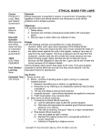 ETHICAL BASIS FOR LAWS Course Practicum in Local, State, and Federal Government Unit III Ethics & Politics Essential Question What does the term ethics mean and why is it important to careers in government? TEKS §130.190(c) (3)(A)(B)(C) Prior Student Learning None Rationale Ethical awareness is essential to careers in government. Knowledge of the legalities of ethics and ethical behavior are necessary to avoid ethical problems and to achieve success. Objectives The students will be able to: 1. Define ethics 2. Compare and contrast consequence-based ethics with rule-based ethics 3. Discuss ways in which ethics are reflected in laws Engage Use the following scenario and questions for a class discussion: Jasmine, Maria, and Logan were employees of the Rolling Wheel Restaurant. They were aware that the owner never checked the totals on the sales checks against the cash in the register, making it very easy to steal from the cash register. The three employees did not steal from the restaurant. Jasmine said she did not take the money because she was afraid of being caught. Maria said that she did not take the money because she felt obligated to obey the law. Logan said he did not take the money because of his religious beliefs. Ask the students which person they relate to the most. Then give students examples of ethical dilemmas and ask how they would respond. Use the Discussion Rubric for assessment. Key Points Estimated Time I. Ethics and the Law 4 to 5 hours A. Ethics – practice of deciding what is right or wrong in a reasoned, impartial manner 1. Decision must affect you or others in a significant way 2. Reasoned out by referring to an established authority that provides consistency 3. The law and religious texts provide authority 4. Impartial decision – same ethical standards are applied to everyone 5. Profit maximization may overlook ethics B. Basic forms of ethical reasoning 1. Consequence-based ethical reasoning a) Look for alternative ways to alter the current situation b) Alternative that generates the greatest good (financial reward, pleasure, love, justice) c) Who will be receiving “the good” often is a major consideration 2. Rule-based ethical reasoning a) Acts are judged as right or wrong b) Standard for judging comes from a recognized authority or human reasoning c) Authority is frequently a religious source 1 Copyright © Texas Education Agency, 2015. All rights reserved. d) Universalizing – picture everyone doing the action and then asking whether the result would be irrational, illogical or demeaning II. Ethics Reflected in Laws A. US Democracy – representatives must vote for laws that are acceptable to the majority of people if the representatives expect to be reelected (consequence-based ethics) B. Constitution – seeks to protect the well-being of minorities that might be taken advantage of by the wrong actions of the majority C. Ethics based on consequences and ethics based on rules both conclude that we are obligated to obey the law D. Laws can easily be broken by those with superior abilities or knowledge 1. Fidelity bond – an insurance policy that pays the employer money in the case of theft by employees 2. Scofflaws – persons who do not respect the law at all and are not deterred by the risk of being caught and punished 3. Lack personal integrity (capacity) to do what is right in the face of temptation or pressure to do otherwise E. Civil disobedience – open, peaceful, violation of a law to protest its alleged or supposed injustice 1. Goal to make the legal system more just 2. View a written law being in conflict with ethical reasoning 3. No effective political methods are available to change the law 4. The civil disobedience is nonviolent 5. The civil disobedience does not advance a person’s immediate selfinterest 6. The civil disobedience is public, and one willingly accepts the punishment for violating the law Activities 1. Current Ethical Issue – Divide the class into groups of two students. Each group must outline a current ethical issue in society. Each group will report about its ethical issue to the class. Use the Presentation Rubric for assessment. 2. Ethics Presentation – Divide the class into teams consisting of two students. Each team must prepare a presentation that deals with three ethical situations: shoplifting (stashing candy in a purse), cheating on income taxes to save nearly $2,000, and skipping the automobileemissions inspection with the rationale that you are a mechanic who takes better care of your automobile than a service station. The presentation must indicate the ethical issues involved with each situation, the consequences of each situation, and who is affected by the unethical actions. Use the Presentation Rubric, the Group Evaluation Rubric and/or the Peer Evaluation Rubric for assessment. 3. Emotions vs. Ethics Table – Split the class into teams of two students. Design a three-column table. The first column should list different situations 2 Copyright © Texas Education Agency, 2015. All rights reserved. that involve emotions and ethics. Students should list 10 situations in the first column and then list the responses to each based on emotions and ethics. Discuss the students’ answers. Use the Discussion Rubric for assessment. Assessments Discussion Rubric Essay Rubric Group Evaluation Rubric Peer Evaluation Rubric Presentation Rubric Materials Ethical Basis for Laws computer-based presentation Internet Computers for students to complete projects Projector for presentation Resources Local newspapers Television Network Newscasts and the Internet http://thoreau.eserver.org/civil.html State of Utah Business Law Curriculum: http://schools.utah.gov/cte/business_resources_law.html Accommodations for Learning Differences For reinforcement, the students will survey family members to learn more about their cultures. Students should learn at least five facts about the laws that their relative had to live by when they 