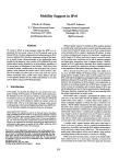 Mobility Support in IPv6 Charles E. Perkins T. J. Watson Research Center IBM Corporation Hawthorne, NY 10532 perk@watson.ibm.com David B. Johnson Computer Science Department Carnegie Mellon University Pittsburgh, PA 15213 dbj@cs.cmu.edu Abstract Without specific support for mobility in IPv6, packets destined to a mobile node would not be able to reach it while the mobile node is away from its home IP subnet, since as in IPv4, routing is based on the network prefix in a packet’s destination IP address. In order to continue communication in spite of its movement, a mobile node could change its IP address each time it moves to a new IP subnet, but the mobile node would then not be able to maintain transport and higher-layer connections when it changes location. Mobility support in IPv6 is particularly important, since mobile computers are likely to account for a majority or at least a substantial fraction of the population of the Internet during the lifetime of IPv6. IPv6 is derived from IPv4 and is in many ways similar to it. As such, the IETF Mobile IP Working Group’s current protocol design [22] for mobility of IPv4 nodes could be adapted for use in IPv6, with only the straightforward changes needed to accommodate differences between IPv4 and IPv6 such as the size of addresses. However, the development of IPv6 presents a rare opportunity, in that there is no existing installed base of IPv6 hosts or routers with which we must be compatible, and in that the design of IPv6 may still be adjusted to account for the few special needs of mobile nodes. This paper, therefore, considers how IPv6 can most naturally fulfill the support requirements for mobile nodes. Each mobile node is assigned a (permanent) IP address in the same way as any other node, and this IP address is known as the mobile node’s home address. A mobile node’s home address remains unchanged regardless of where the node is attached to the Internet. The IP subnet indicated by this home address is the mobile node’s home subner. and standard IP routing mechanisms will deliver packets destined to a mobile node’s home address only to the mobile node’s home subnet. A mobile node is simply any node that may change its point of attachment from one IP subnet to another, while continuing to be addressed by its home address. Any node with which a mobile node is communicating we refer to here as a correspondent node. which itself may be either mobile or stationary. A mobile node’s current location while away from home is known as its care-of address, which is a globally-routable address acquired by the mobile node through IPv6 address autoconfiguration in the foreign subner being visited by it. The association of a mobile node’s home address with a care-of address, along with the remaining lifetime of that association, is known as a binding. While away from its home subnet. a router on the mobile node’s a record of the home subnet known as its home agent maintains current binding of the mobile node. The home agent then intercepts IP version 6 (IPv6) is being designed within the IETF as a replacement for the current version of the IP protocol used in the Internet (IPv4). We have designed protocol enhancements for IPv6. known as Mobile IPv6, that allow transparent routing of IPv6 packets to mobile nodes, taking advantage of the opportunities made possible by the design of a new version of IP. In Mobile IPv6, each mobile node is always identified by its home address, regardless of its current point of attachment to the Internet. While away from its home IP subnet, a mobile node is also associated with a care-of address, which indicates the mobile node’s current location. Mobile IPv6 enables any IPv6 node to learn and cache the care-of address associated with a mobile node’s home address, and then to send packets destined for the mobile node directly to it at this care-of address using an IPv6 Routing header. 1 Introduction In this paper, we describe the design of a new protocol for transparent routing of IPv6 packets to mobile IPv6 nodes operating in the Internet [ 131. IP is the protocol which provides packet routing and delivery services for the Internet, and IP version 6 (IPv6) [8] is a new version of IP intended to replace the current version of IP (IPv4) [26]. IPv6 is in the final stages of design within several working groups of the Internet Engineering Task Force (IETF) [ 11, 121,the principle standards development body for the Internet. David Johnson was supported in part by the National Science Foundation under CAREER Award NCR-9502725. by the Air Force Materiel Command (AFMC) and ARPA under contract numberF196828-93-C-0193, and by the AT&T Foundation under a Special Purpose Grant in Science and Engineering. The views and conclusions contained here me those of the authors and should not be interpreted as necessarily representing the official policies or endorsements, either express or implied, of NSF, AFMC, ARPA, the AT&T Foundation, IBM, CMU. or the U.S. Government. Permissionto make digital/hard copies of all or pati of this material for personal or classroom use ia granted without fee provided that the copies are not made or distributed for profit or commercial advantage, the copyright notice, the title of the publication and its date appear, and notice is given that copyright is by permission of the ACM, Inc. To copy otherwise, to republish, to post on servers or lo redistribute to lists, requires specific permission and/or fee. MOBICOM 96, Rye NY USA Q 1996 ACM 0-89791-872-X/96/1 1 .X3.50 27 Correspondent node Packets from mobile node routed directly to correspondent node operation of a correspondent node communicating with a mobile node, and Seclion 8 describes the operation of a home agent. Slecurity issues are discussed in Section 9, and in Section 10. we present conclusions. Mobile node a4 2 Packets to mobile node routed indirectly through home agent \ In this section. we outline some of the basic char