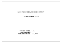 ROSE TREE MEDIA SCHOOL DISTRICT COURSE CURRICULUM COURSE TITLE: Latin GRADE LEVEL: I CREATION DATE: June, 2004 Essential Question, Concept or Theme: A. Communication: Reading, understanding, and demonstrating comprehension of Approx. Time Allotment: words, phrases, and simple sentences of Latin. Demonstrating a knowledge of vocabulary, basic inflectional systems, and syntax appropriate to the level. Reading and understanding, with appropriate assistance, passages of Latin adapted from original authors. PA Standards: 1.1, 1.2 Benchmark/Skills VOCABULARY: Alphabet, geographical terms, immediate family terms, numbers 1-10, 100, Roman numerals I-MM, Ordinal numbers 1st.-10th, School/student terms, Ancient European countries, Roman Provinces, Slavery terms, Ancient Rome-city and monuments, Farming, Religion/mythology/gods, Foods and customs, Traveling, Nationalities of ancient world, Military and war terms, Roman entertainment, Vocabulary appropriate to stories of Ulysses and Aeneas. GRAMMAR: NOUNS: Declensions 1-3, singular and plural, all genders ADJECTIVES: Declensions 1-3. Possessives, and demonstratives PRONOUNS: Personal, interrogatives, and relative VERBS: All six tenses (present, imperfect, future, perfect, pluperfect,, fut. Perfect), all 4 conjugations, active and passive voice, Irregular verbs-sum, possum. ADVERBS: Declensions 1-2 CONJUNCTIONS: et, aut, neque, quod, sed INTERROGATIVES: ubi, quo, modo, cur, -ne SYNTAX: Questions, subjective and objective infinitives (active Ablative constructions, Ablative Absolute, Participial clauses PREPOSITIONS: With ablative, with accusative Latin I Assessment Decline in singular and plural nouns of 1st., 2nd, 3rd, declensions Show noun/adjective agreement in simple phrases Demonstrate an understanding of inflection Identify and translate Roman numerals Read and translate brief dialogs Form and translate simple verb synopses Generate and fill in simple questions Count in Latin numbers 1-10 Identify and translate the ordinal numbers in Latin Assess the main idea of simple Latin narratives Distinguish words and phrases used in idiomatic expressions Recognize and identify English cognates from Latin Use cognates to facilitate comprehension of Latin text Compose simple sentences illustrating targeted syntax and grammar Complete generic exercises to illustrate comprehension of grammar and syntax Demonstrate comprehension of materials learned by creating lesson plans and teaching to the class Employ role playing Evaluate comprehension skills by using discrete point quizzes and prochievement chapter tests Discriminate between the uses of all noun cases Demonstrate a working knowledge of the vocabulary of Latin I Produce projects (e.g. calendars, family, military, etc.) Participate in games that review and assess comprehension of Latin (words and syntax) Identify and use correctly Latin expressions used in English Page 1 Aligned Materials/ Resources/Technology Text Latin for Americans First Book (Glencoe, Macmillan/McGrawHill, 2000) Student Edition Teacher’s annotated edition Writing activities workbook Testing Program with answer key Internet resources Verb Synopses -1- Instructional Strategies Oral presentations Role Playing Paired/cooperative learning Oral drills Memorization Dictation Visual and verbal cues Modeling Realia Transparency activities Computer software activities Games, skits, songs, puzzles Workbook activities Notebook/journal Verb synopses Declension drills Connection of old to new Brainstorming Prepared and sight translation June, 2004 Essential Question, Concept or Theme: A. Communication: Reading, understanding, and demonstrating comprehension of words, phrases, and simple sentences of Latin. Demonstrating a knowledge of vocabulary, basic inflectional systems, and syntax appropriate to the level. Reading and understanding, with appropriate assistance, passages of Latin adapted from original authors. PA Standards: 1.1, 1.2 Adaptations/Inclusion Techniques Communicate with Special Education personnel regarding student data Review knowledge and skills Emphasize cognates as learning strategies Model pronunciation and learning strategies Use organizers - notebook, daily planner, buddy system Extend or adapt written exercises Allow extra time for practice and assessments Examine patterns Reinforce and review Clarify expectations and goals Explain unfamiliar concepts and terminology Use contextual clues Assist in problem solving Support with realia Color code or highlight Provide tutoring and peer mentoring Employ memory techniques Provide individual instruction Give adequate advance notice regarding future assignments Latin I Enrichment Strategies Remediation Strategies World Language Department Initiates District World Language Contest and Fete (award Program) Nations Latin Exam Junior Classical Honor Society Level I Opportunities Field Trips Music Student designed activities Rank Level I projects Challengefor credit Independent study Enhancement activities (movies, extra readings, cultural celebrations) Latin Experience activities/journal Page 2 Approx. Time Allotment: Multicultural/Interdisciplinary Connection Romance Languages - French, Spanish, Portuguese, Romanian, Italian, Romanche, - (derived from Latin) Math - Roman numerals and ordinal numbers in Latin e.g. Septimus/September Geography - The roman Empire extended into all of Europe, Aisa Minor, and Northern Africa and each of these areas was influenced by its culture. Language Arts - 60 percent of the English Language is derived from Latin. The study of Latin and Latin literature has influenced many important writers of the renaissance period. (Shakespeare’s works were influenced by Ovid’s writings) Public speaking, theater, and cinema Social Studies – Culture, government, civics, history, humanities, ethnicity Music - sacred music, Gregorian chant, instruments Art - Art history, crafts, student art projects, architecture Science - Biology, Botany, Anatomy, Chemistry, Ph