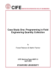 CIFE CENTER FOR INTEGRATED FACILITY ENGINEERING Case Study One: Programming in Field Engineering Quantity Collection By Forest Peterson & Martin Fischer CIFE Working Paper #WP113 April 2009 STANFORD UNIVERSITY COPYRIGHT © 2009 BY Center for Integrated Facility Engineering If you would like to contact the authors, please write to: c/o CIFE, Civil and Environmental Engineering Dept., Stanford University The Jerry Yang & Akiko Yamazaki Environment & Energy Building 473 Via Ortega, Room 292, Mail Code: 4020 Stanford, CA 94305-4020 CC2009 - Case Study One: Programming in Field Engineering Quantity Collection Forest Peterson, Graduate Research Assistant, Dept. of Civil and Env. Eng., Stanford Univ., email: granite@stanford.edu Martin Fischer Ph.D., Professor, Dept. of Civil and Env. Eng., Stanford Univ., and Director, Center for Integrated Facility Engineering, e-mail: fischer@stanford.edu CIFE, Stanford University, The Jerry Yang & Akiko Yamazaki Environment & Energy Building, 473 Via Ortega, Room 292, MC:4020, Stanford, CA 94305-4020 Keywords: Field engineer, Programming, Project Control, Quantities Abstract: The question guiding this study is can field engineers on large infrastructure and industrial projects automate repetitive tasks through the use of programmed functions. Field engineers have repetitive tasks, some of these are endogenous tasks and others are exogenous tasks. Endogenous tasks are those consisting of calculating values through recipe-formulas and exogenous tasks being collecting outside measurements. There has been research in the past few years on open source software and programming language aimed at nonprofessional or semi-professional programmers. This paper is intended to target below that scope and address the non-programmer. Macros are a programming interface which repeats a predetermined sequence of operations and are well suited for often repeated tasks. This topic is important because many construction engineers are not aware what macros are and do not write them for their repetitive tasks. This study adds to science knowledge in that recipe-formulas are shown to be a tool available to field engineers that possibly could be standardized and automated. The study is to learn how to use macros. Write a macro to complete several field engineer tasks and find if it is a net benefit to the engineer. A field engineer task is to verify haul truck invoices are correctly calculated using the fuel surcharge for a given week. Two macro tools are used to accomplish this task, one provided as part of Microsoft Office and the other a free tool available online. A function is coded to pull the weekly average fuel rate from a US government website, apply a recipe formula to calculate the percent surcharge the check the invoice total cost. The macros were able to pull the needed information from the government website and calculate the percent surcharge. Individually neither macro tool could accomplish the field engineers task. Combined and applied to those functions they could perform they were able to accomplish the task. The purpose of the study is achieved. Macros are able to perform an exogenous field engineer task and several endogenous tasks. The difficulty in performing these tasks with macros was unexpected. Using two vendors software tools provided results that indicate the difficulty is not the macros themselves but functionality issues with each specific tool. This study is limited in the number of macro tools tested and the field engineer tasks automated. In practice the implication is that field engineers are likely performing tasks that could be automated with a macro. The results indicate that adding macros to construction engineering courses as part of lab assignment solutions would provide a benefit in their employment. More research is needed to explore how macros could be introduced into existing course lab assignments. Additional research is needed to define criteria to identify tasks most likely to benefit from automation. Exploring the establishment of a lunch box or shared library of common recipe formulas encoded as macros. Introduction Field engineers on large projects have repetitive tasks that must be completed routinely. Some of these tasks could be automated using macro programming applications, resulting in fewer endogenous tasks and more emphasis on exogenous tasks. Endogenous tasks are those consisting of calculating values and exogenous tasks being collecting outside measurements. Macros are applications that will repeat a predetermined sequence of operations, well suited for often repeated field data manipulation tasks. Engineers often utilize spreadsheets for these tasks. Many construction engineers both recent graduates and those with more experience are not aware what macros are and do not write them for small repetitive tasks. As an engineer myself, I had heard of these tools and was aware they could simplify data manipulation steps that were done the same every time. With no time to learn these tools and having not been taught in undergraduate studies, the opportunity to exploit these tools was lost. The broad use of macros on projects to derive quantities would result in better use of engineers working on those things that are not able to be completed by macros. There has been research in the past few years on “open source” software and programming language aimed at nonprofessional or semi-professional programmers. This paper is intended to target below that scope and address the non-programmer who can still benefit from some programming light in their daily life. Here at the Center for Integrated Facility Engineering (CIFE) Timo Hartman has been a visionary of open source code and wrote on integration of the process model through XMLi. David Chua of the National University of Singapore published an article also outlining the use of XML to create an application that would automate some tasks of the scheduler in creating a realistic pr