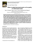 African Journal of Food Science and Technology (ISSN: 2141-5455) Vol. 3(10) pp. 236-243, December, 2012 Available online http://www.interesjournals.org/AJFST Copyright © 2012 International Research Journals Full Length Research Paper Effect of added beneseed paste on the quality of millet-based masa *1 Ayo J.A, 1Onuoha G, 1Agu H, 1Ayo V.A, 1Avu E.O, 2Sosanya M, and 2Adeosun F 1 Department of Food Science and Technology Department of Nutrition and Dietetics, the Federal Polytechnic, PMB 0231, Bauchi 2 Accepted November 15, 2012 Beneseed enriched millet masa was produced using millet and beniseed flour. The millet was cleaned, washed, dried, dehulled and dry-milled to produce flour. Beneseed was washed, dried and toasted and milled to produce flour. Beneseed flour was supplemented into the millet flour at 0, 10, 20, 30, 40 and 50%. Millet –Beneseed composite masa was produced using the local method and analyzed for proximate, sensory and microbial qualities. The protein and the fat content increased from 8.88 - 11.20% and 9.44 - 11.50%, respectively, while the ash, moisture and carbohydrate decreased from 2.6 -1.0%, 3.8 - 1.8% and 75.32 - 74.44% respectively with increase in the added beneseed flour(0 – 50%). The average mean score for taste, colour, texture, aroma, appearance and general acceptability decreased from 5.10 – 4.45, 5.55 – 5.0, 6.45 – 4.5, 5.70 – 4.95, 5.05 – 4.15 and 6.05 – 5.0, respectively with increase in added beneseed flour. The sample with 20% beneseed and 80% millet with corresponding increase in protein content (14.3%) was the most accepted by the consumers. The microbial counts obtained showed a reduction in microbial populations from 5.0 x 105 to 1.0 x 105 for bacteria and 6.0 x 106 to 1.0 x 105 for fungi with increase in added beneseed flour (0-50%). The organisms identified were Bacillus spp., Streptobacillus spp., Staphylococcus spp., and Streptococuss spp., for bacterial and Saccharomyces spp., Penicillum spp., and Aspergillus spp., for fungi. Keywords: Beneseed flour, millet, bacterial and carbohydrate. INTRODUCTION Masa (Waina) is a fried round shaped fermented breadlike product that is round in shape and made from the batter of rice, pearl millet or maize. It is like the Indian idli in shape and dose in taste (Nkama and Malleshi, 1998) but different from the Mexican “Masa” used in tritiller preparation. Masa is a popular staple food consumed by over 80% of the Northern Nigerian population of about 47 million (Nkama, 1993). It is also consumed in Niger, Burkina Fas and Mali (Nkama, 1998). It is prepared to create variety in cereal based foods for sale and serves as a breakfast and snack item. Though it is as popular as the Nigerian Ogi, but has only received very little attention (Nkama and Malleshi, 1998). Masa is one of the major sources of carbohydrate to the natives of the indigene states in the North. It contains protein, oil, starch, calcium and phosphorus. Masa is a food used for breakfast forming 1/5 of the then total daily *Corresponding Author E-mail: jeromeayo@yahoo.com intake as recommended by FAO/WHO/UNU. The energy content of formulated masa samples was within the recommended values (Nkama and Malleshi, 1998). In the preparation of Masa, the raw materials commonly used include:- Millet, rice, salt, sugar, yeast, vegetable oil and trona or ‘kanwa’. During preparation of masa from pearl millet the grain is dehulled, washed, dried and grounded. The grounded masa is then sieved to produce grits and flour of which the grit is added to boiling water and cooked before mixing with the raw flour in the ratio of 1:2. The batter obtained, is inoculated with baker’s yeast and allowed to ferment over night (14-16 hrs). This fairly thick batter is then diluted with trone or ‘kanwa’ water. Salt and sugar is added to the batter and stirred vigorously to incorporate air. The batter is scooped using a medium sized spoon (50ml capacity) and placed in a pan with individual cup-like depressions in which vegetable oil (3-5 ml) has been added. Batter is fried for 2 minutes on one side, then turned with a small spoon and the other side fried (Nkama and Malleshi, 1998). Ayo et al. 237 Table 1. Recipe for Production of Composite Masa Raw materials (g) Millet Beni seed Water Sugar Trona Yeast Oil (G/nut) Salt Baking powder qr 100 0 75 9.3 3 0.5 5 Pinch 0.5 zt 90 10 75 9.3 3 0.5 5 Pinch 0.5 Masa is a single cereal food whose protein is very poor in nutritional quality and commonly deficient in the essential amino acids such as lysine. It is therefore very important to supplement with locally available legumes and oilseeds that are high in protein and lysine such as groundnut paste, cowpea, beniseed. Beniseed an important edible oil seed crop is produced in several states of Nigeria such as Kaduna, Benue, Kogi, Nassarawa, Niger, Taraba, Yobe, Cross-River and Jigawa (Sosanya, 2007). Beniseed (sesame) are used as a soup mickering condiment and as an important dietary source of protein in areas where they are grown. Their protein has a good balance of amino acids with a chemical score of 62% and net protein utilization of 54%. These characteristics give sesame the potential of being a source of protein supplementation in cereal based foods (Alobo, 2000). Beniseed oil has the highest concentration of Omega – 6-fatty acids and two naturally occurring preservatives, sesamol and sesamin. The seeds are also rich in manganese, copper and calcium (90mg per table spoon for unhulled seeds, 10mg per table spoon for hulled seeds) and contains vitamin B1 (thiamine) and vitamin E (tocophenol) (Sosanya, 2007). Therefore, supplementing with other legumes and oilseeds like beniseed high in protein and lysine could improve the nutritional quality of the diet of the consumer, and also promotes masa as a breakfast and snack item. The work is aimed at producing high quality millet based masa using beniseed. The objectives of the work include: Producing beniseed-mi